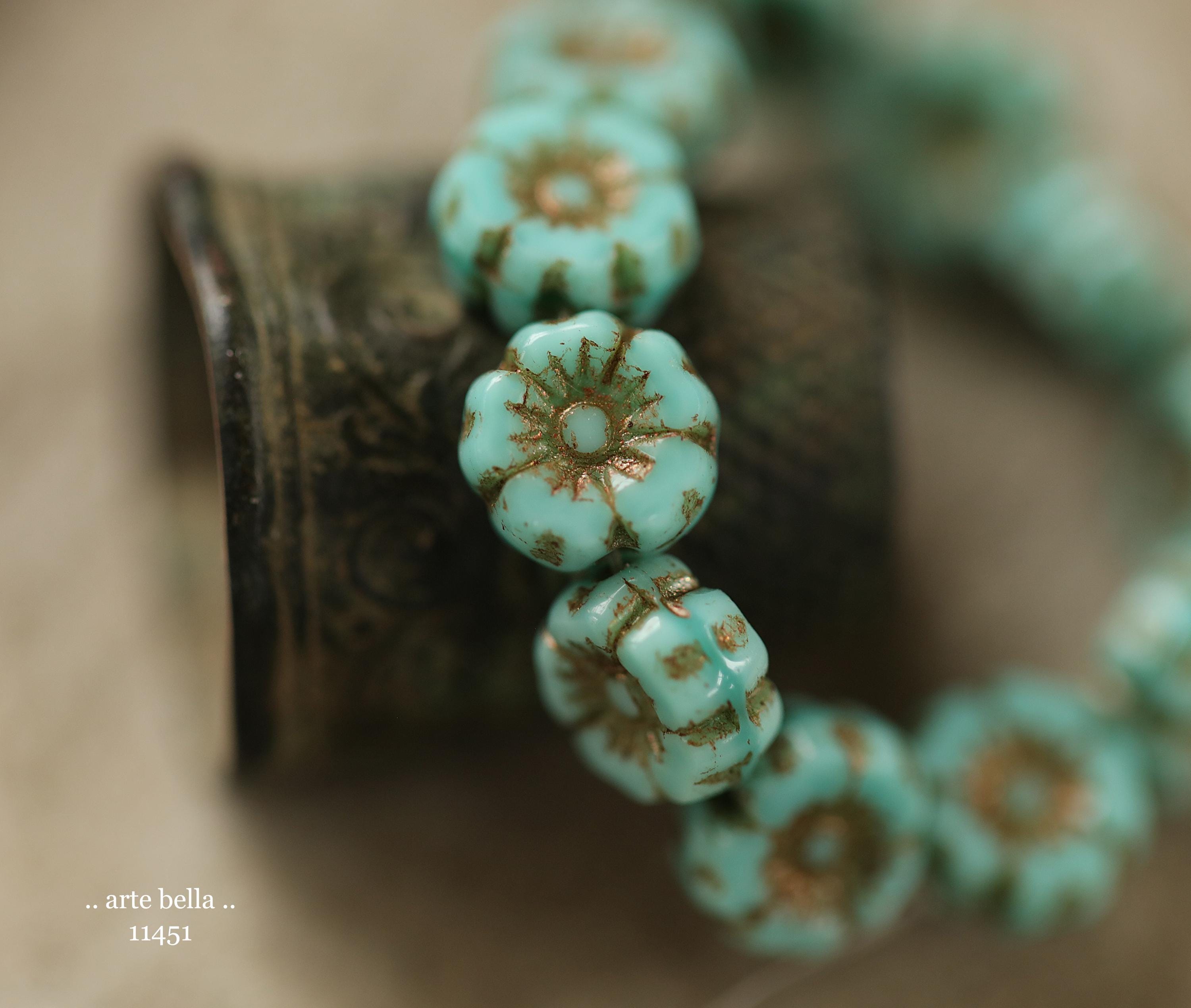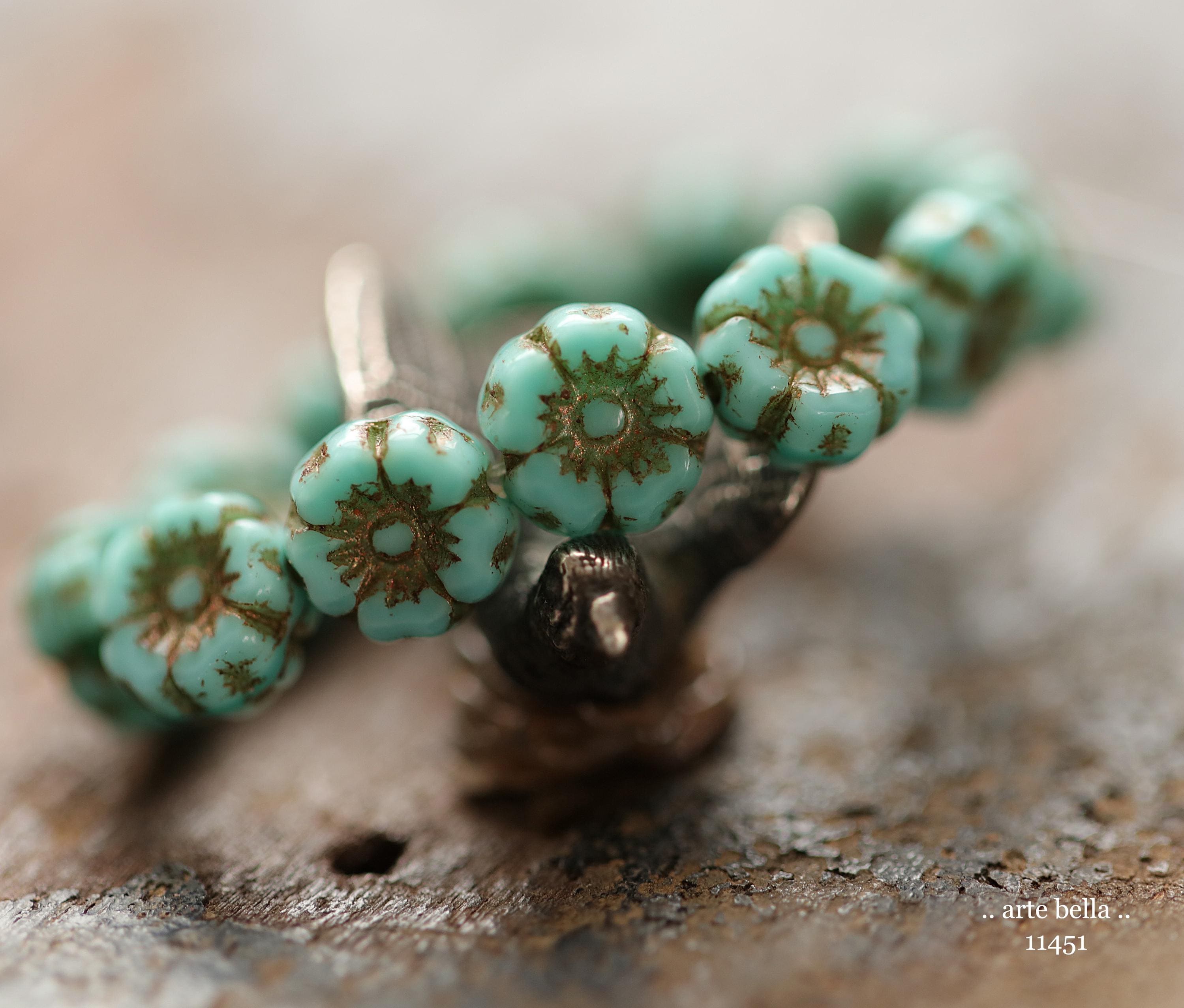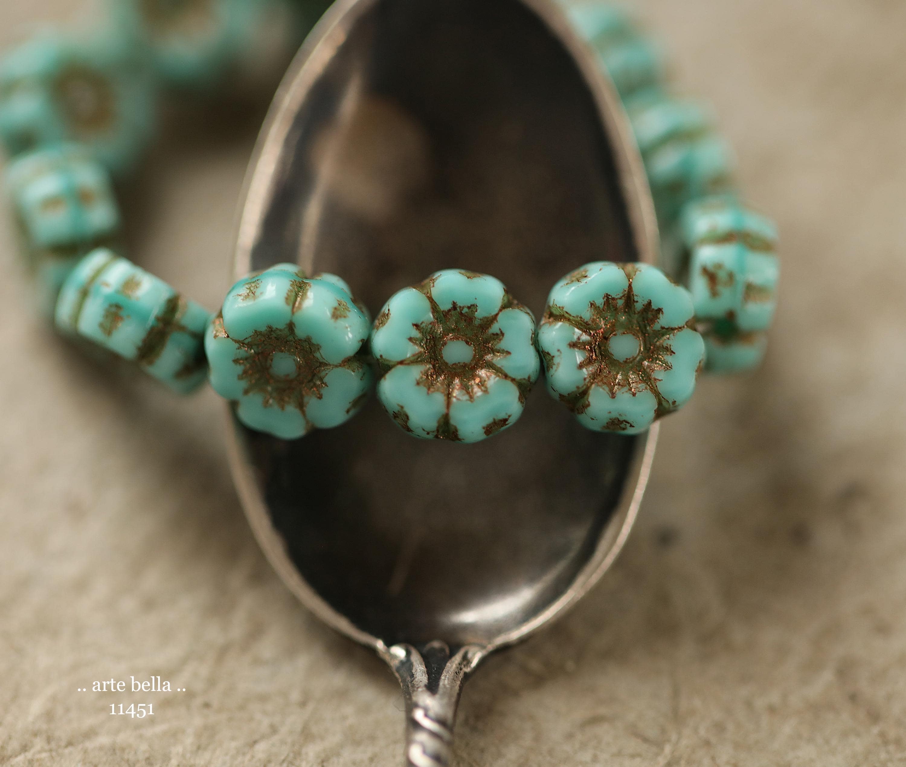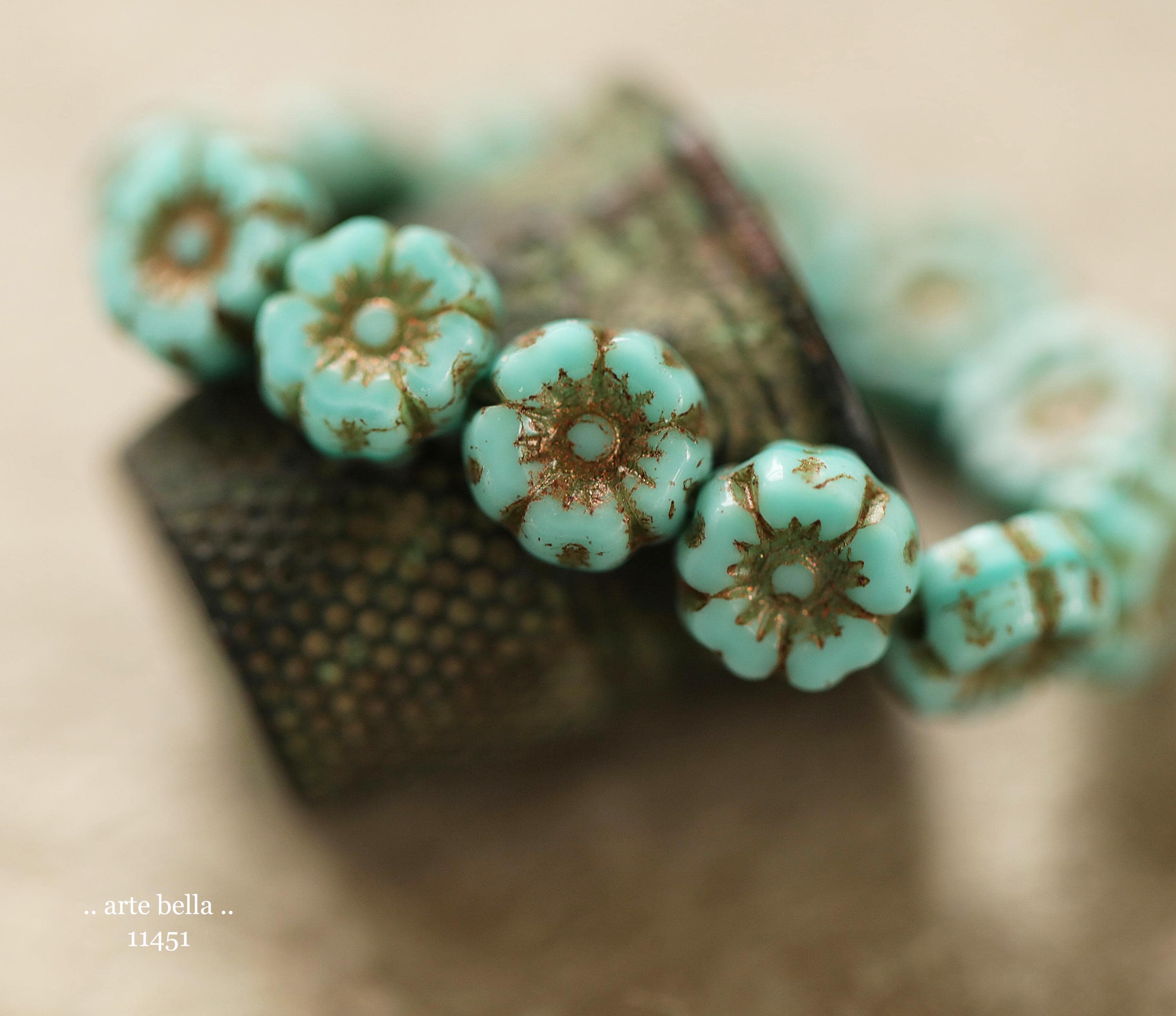 New .. BRONZED TURQUOISE PANSY 7mm .. 12 Premium Czech Glass Petite Hibiscus Flower Beads (11451-st) .. jewelry supplies