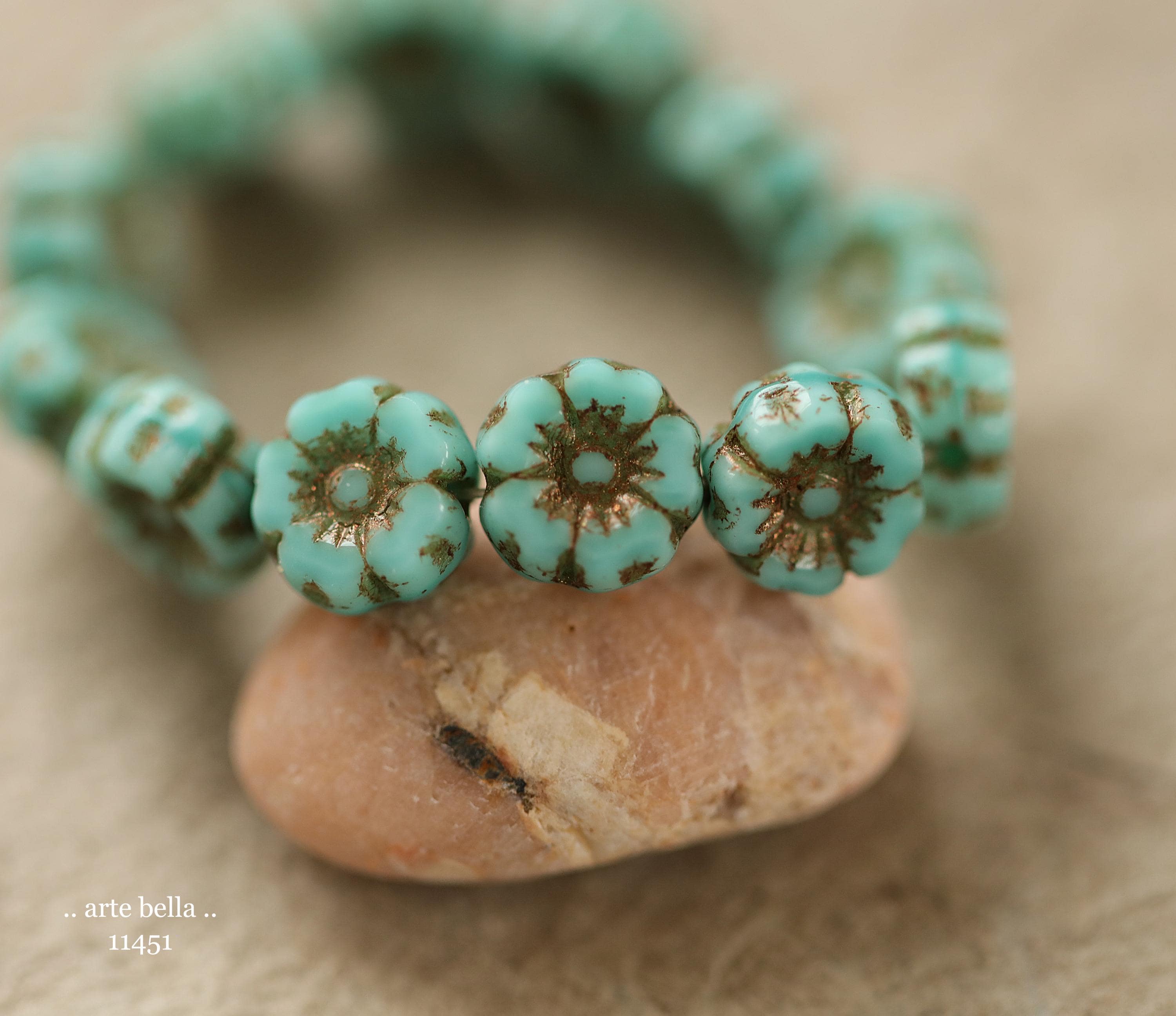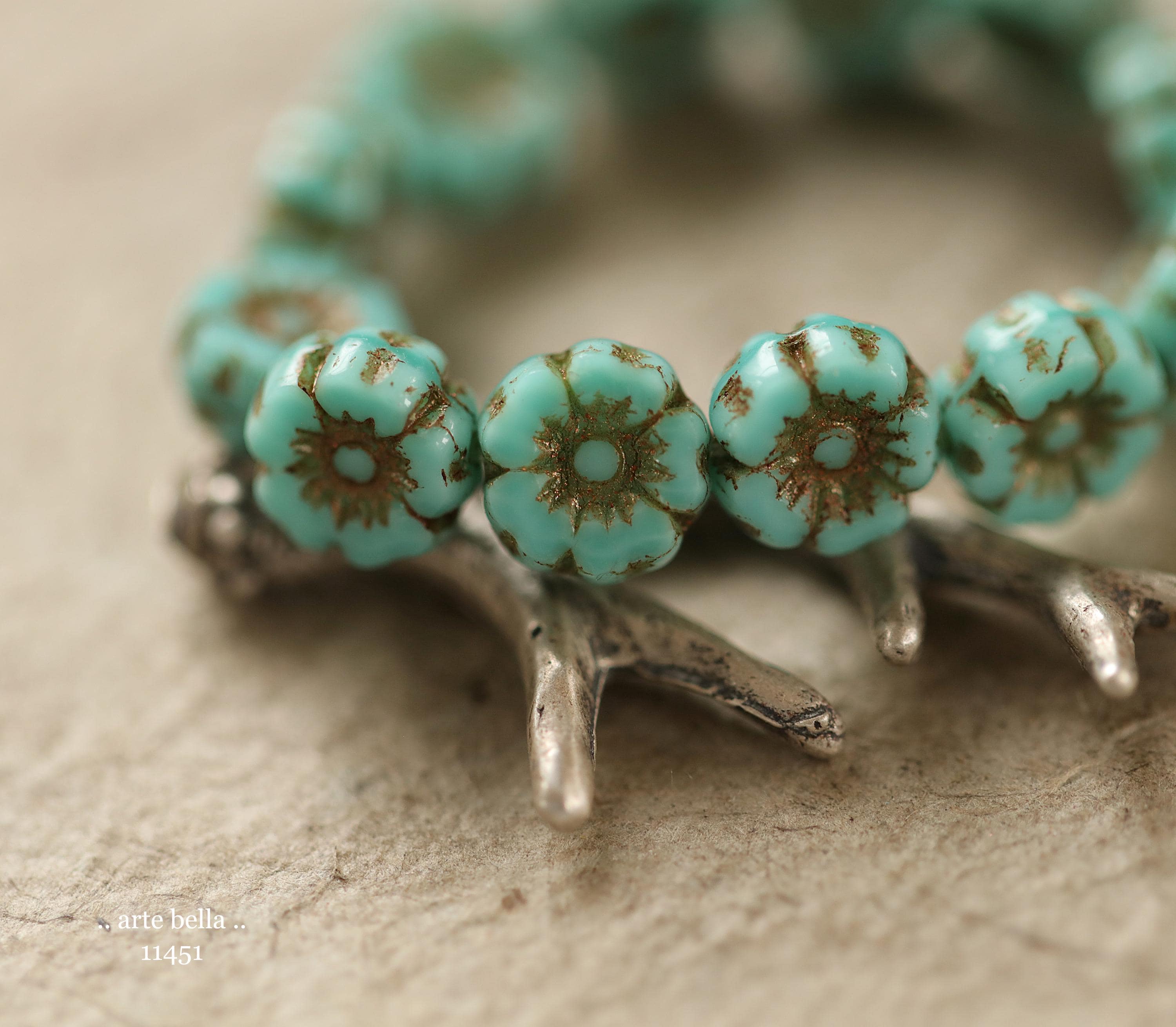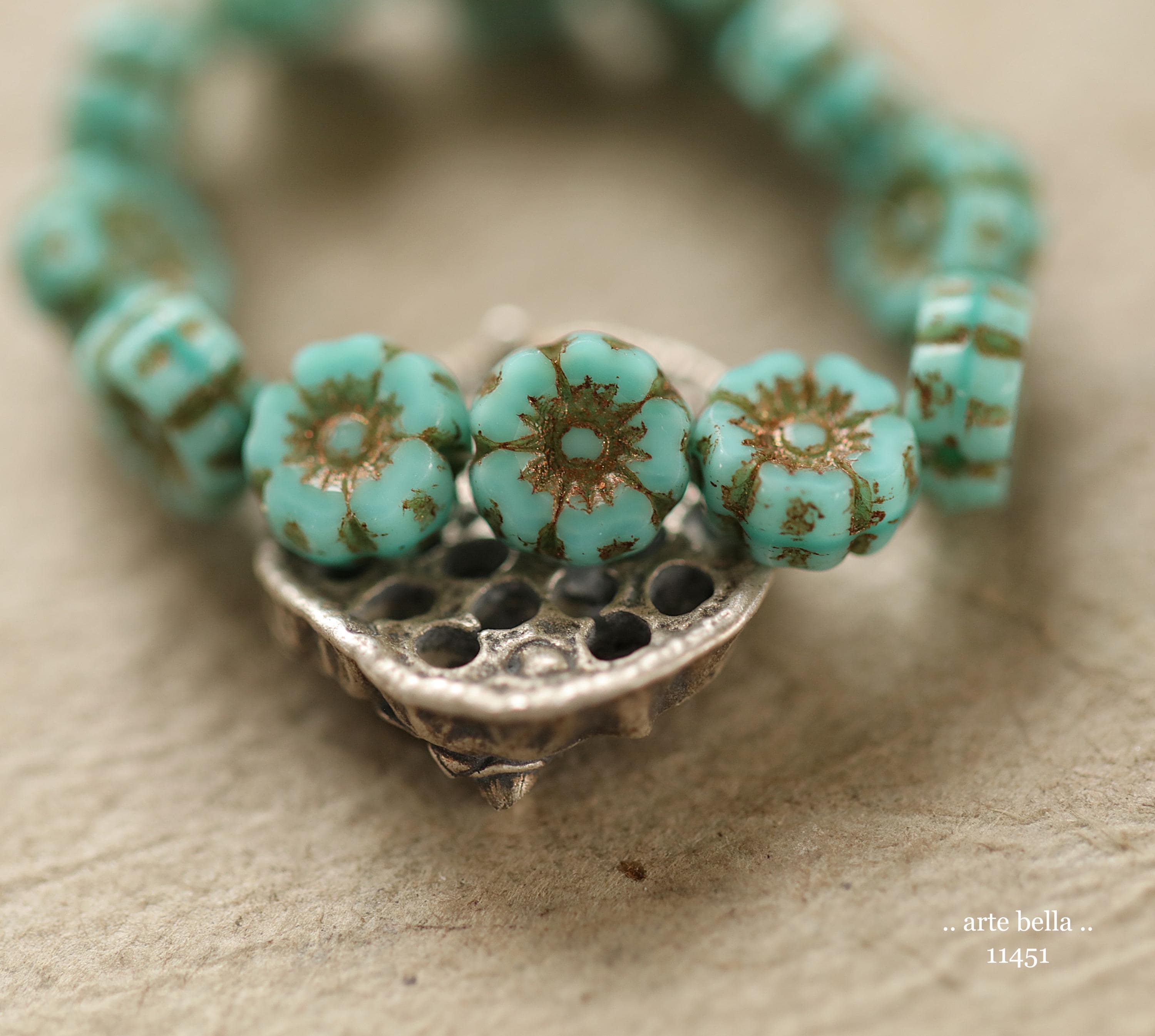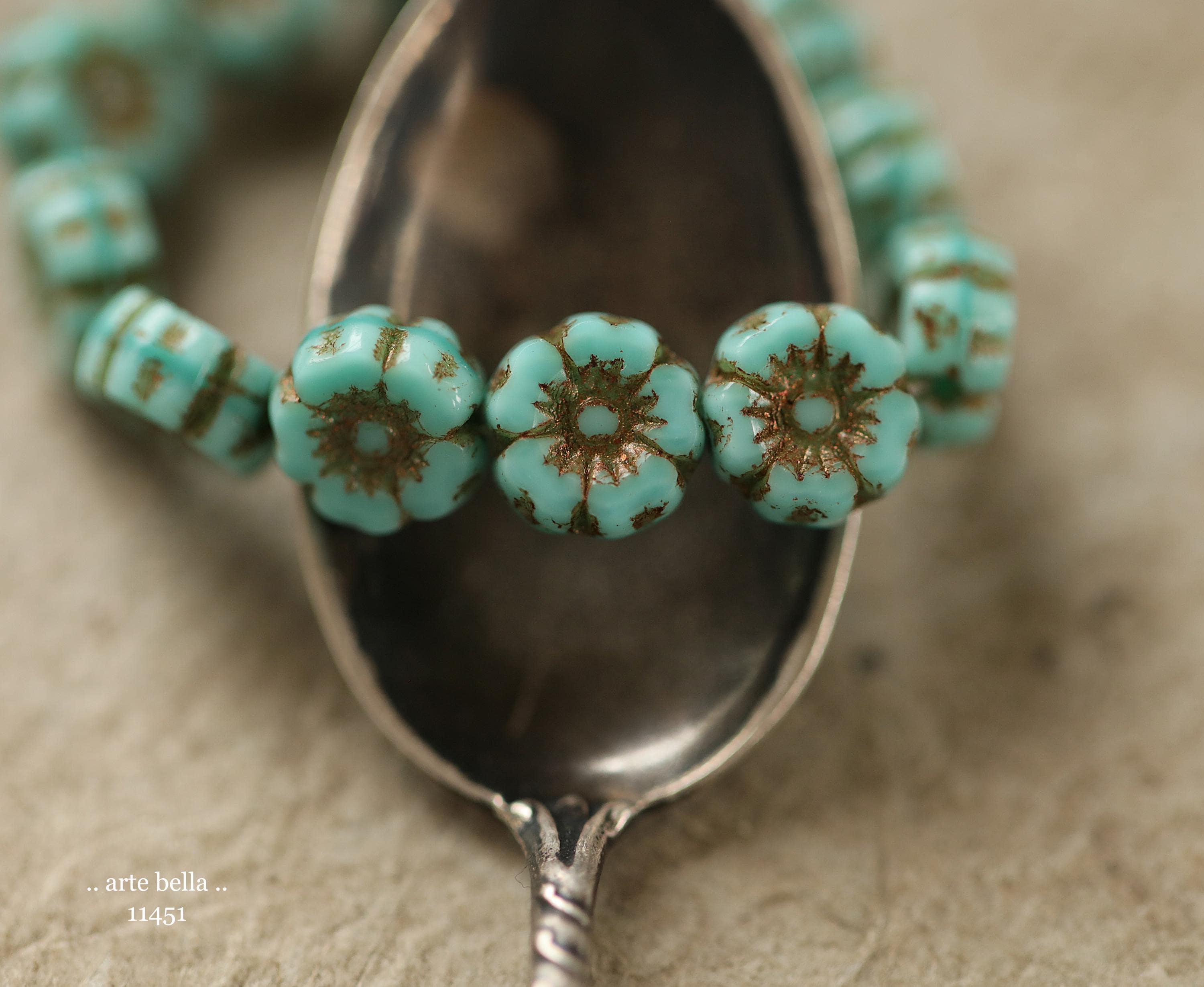 New .. BRONZED TURQUOISE PANSY 7mm .. 12 Premium Czech Glass Petite Hibiscus Flower Beads (11451-st) .. jewelry supplies