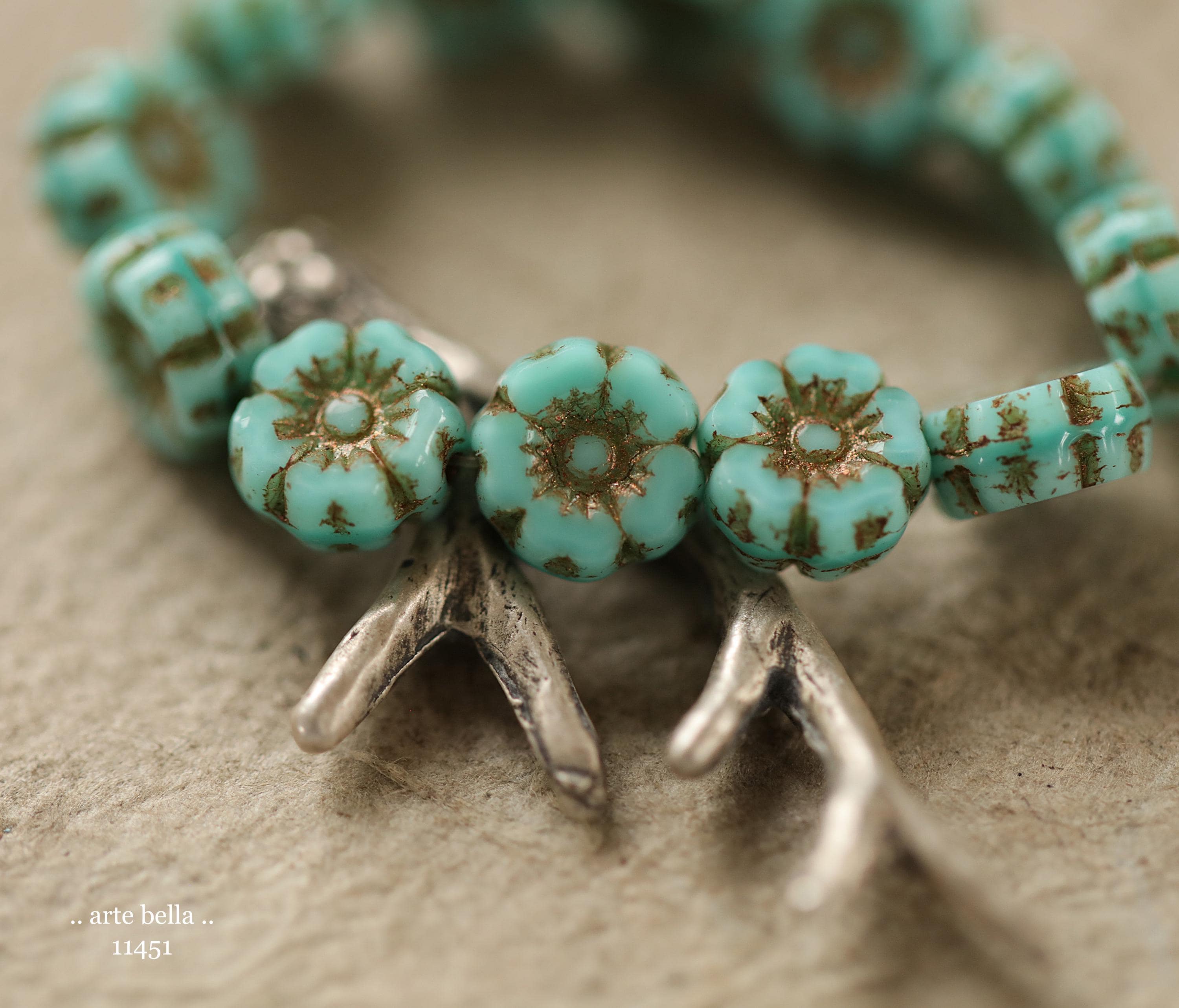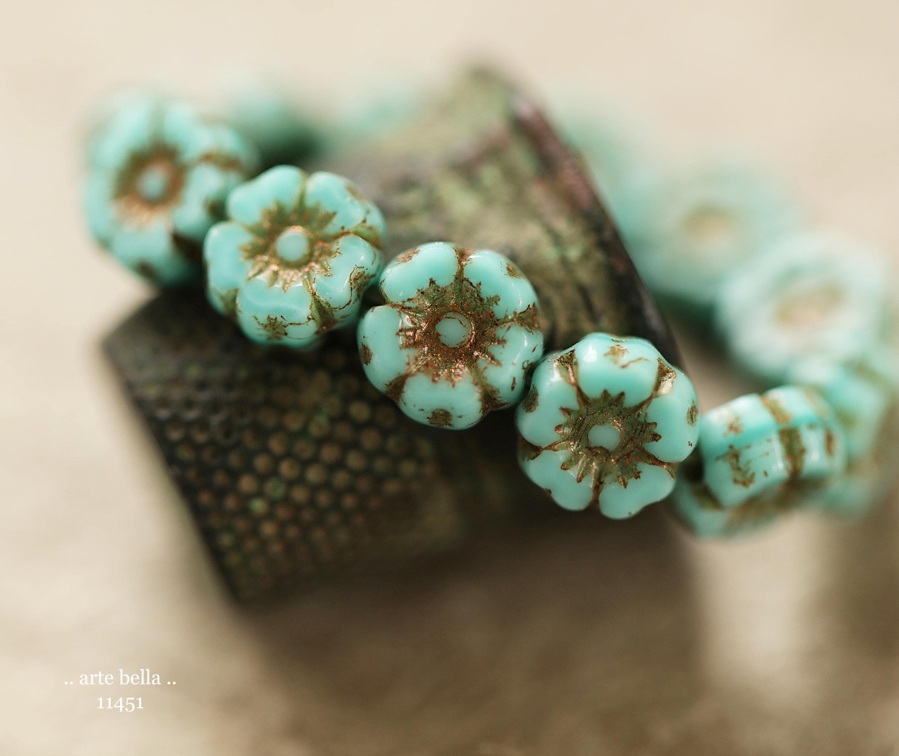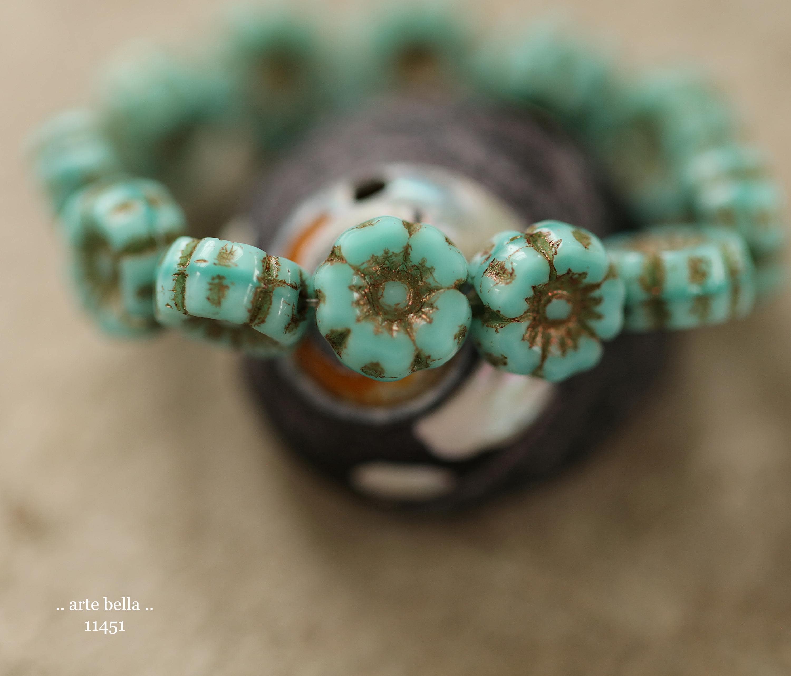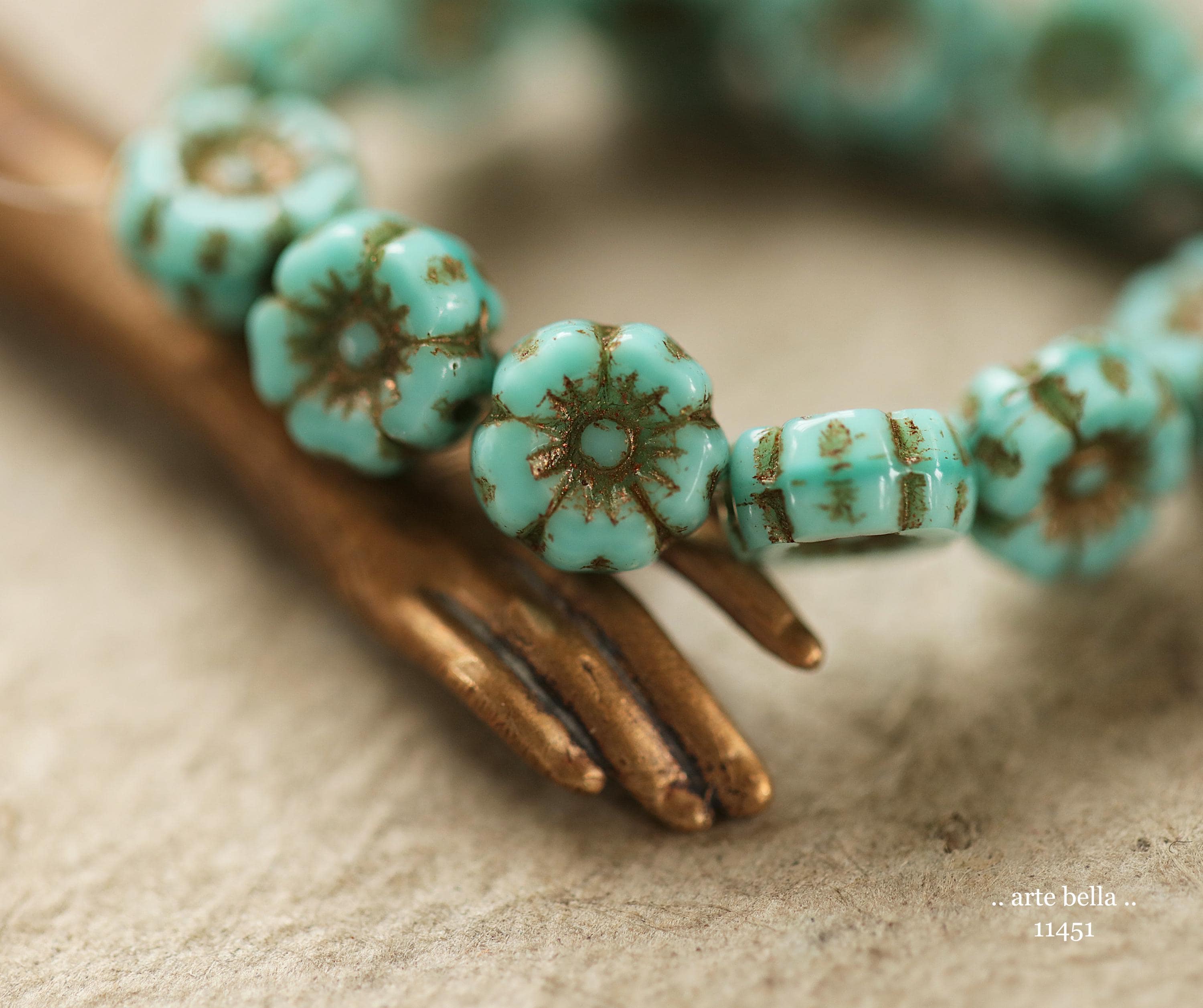 New .. BRONZED TURQUOISE PANSY 7mm .. 12 Premium Czech Glass Petite Hibiscus Flower Beads (11451-st) .. jewelry supplies
