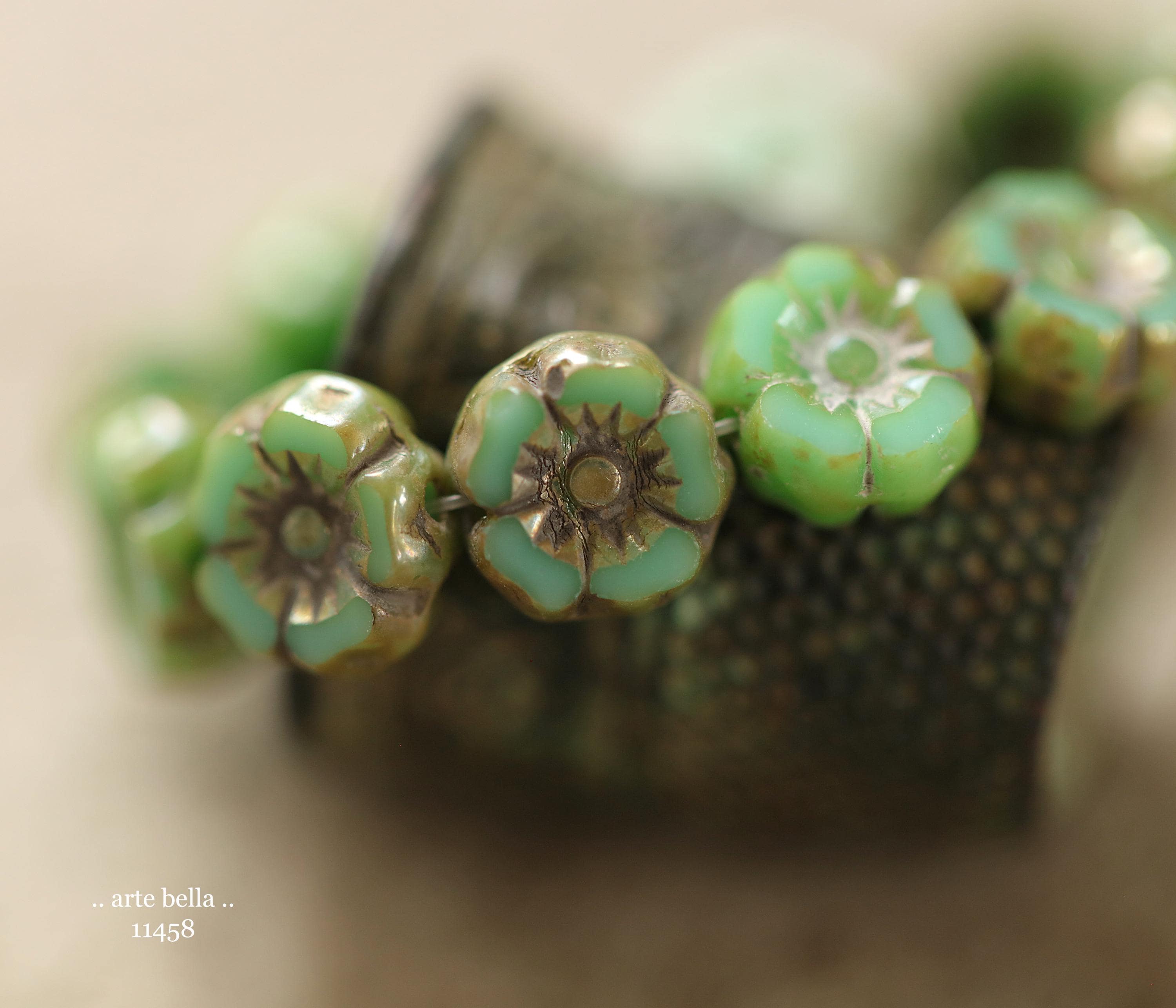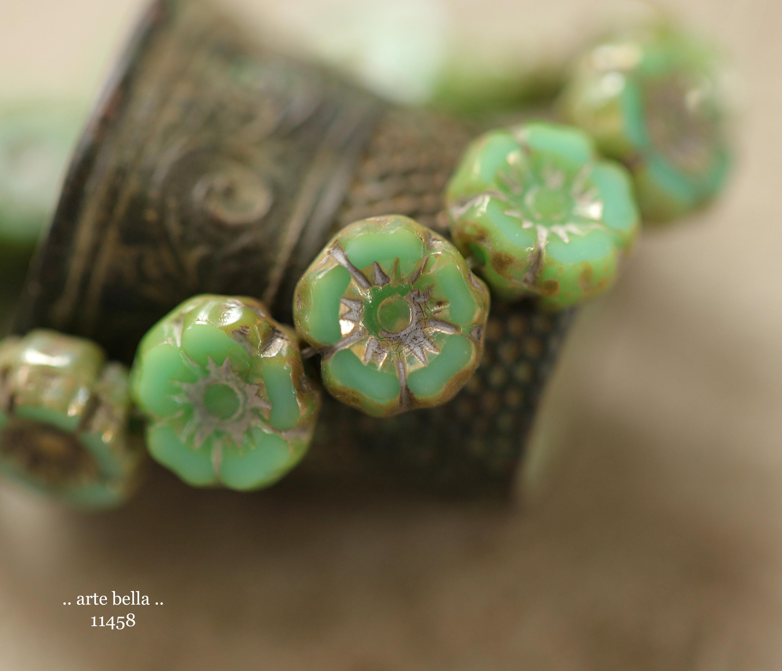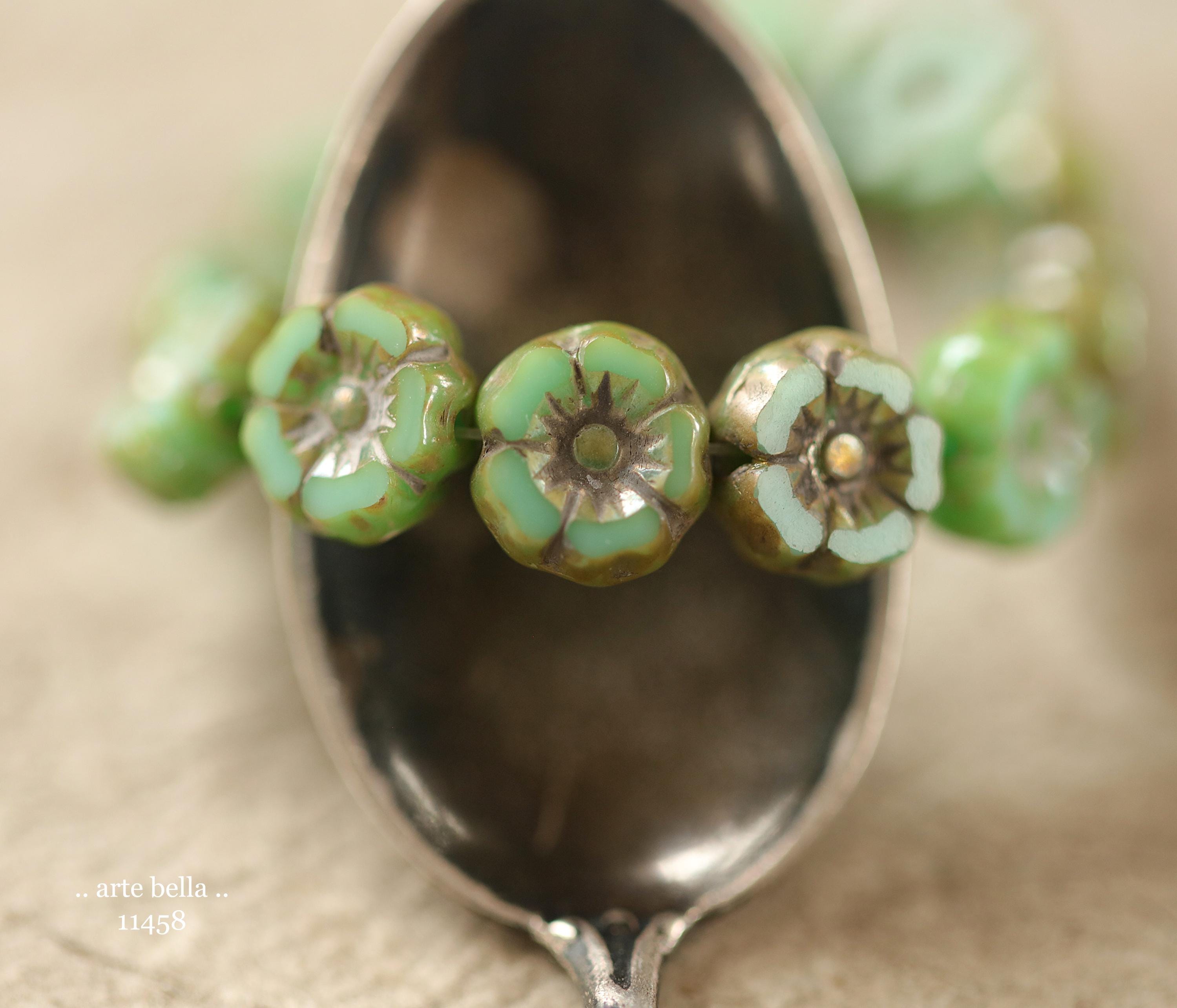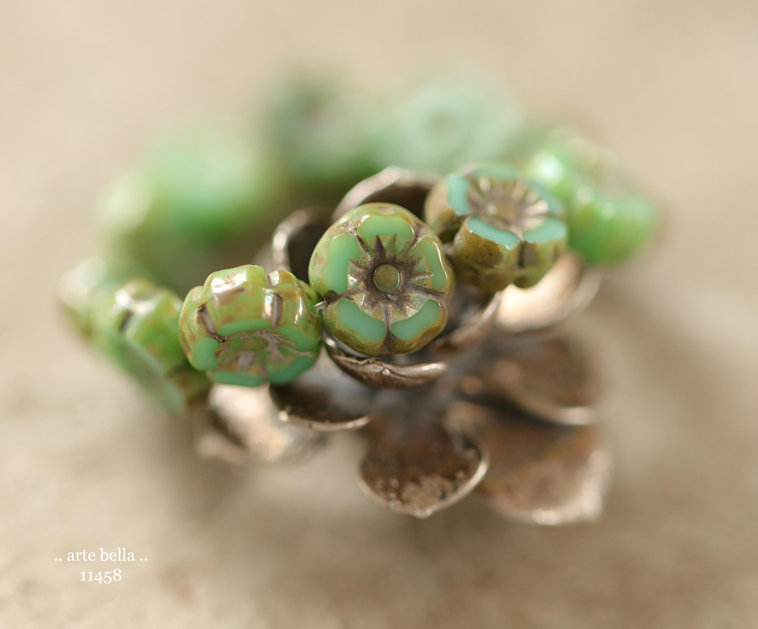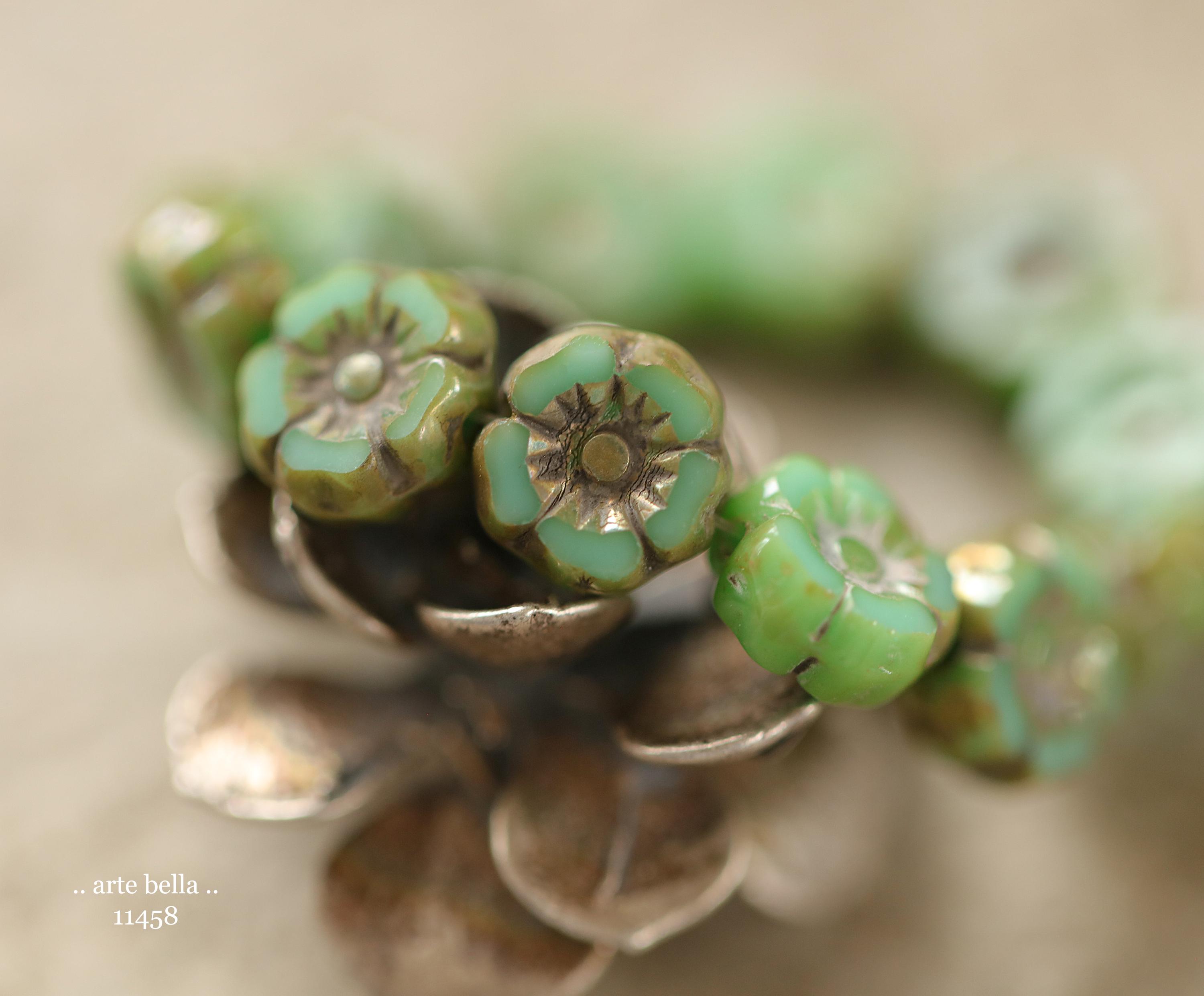 New .. EARTHY TURQUOISE PANSY 7mm .. 12 Premium Luster Picasso Czech Glass Petite Hibiscus Flower Beads (11458-st) .. jewelry supplies