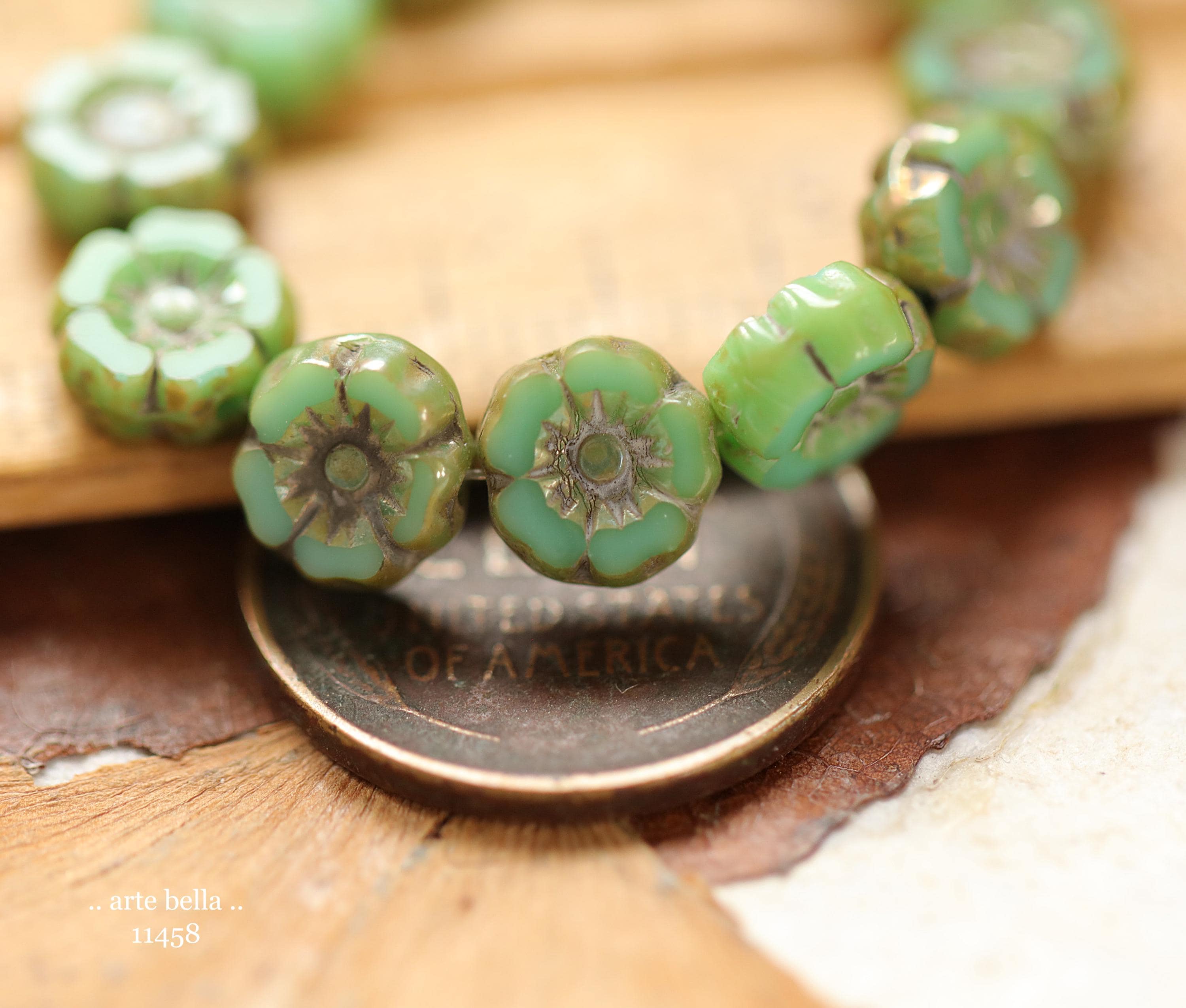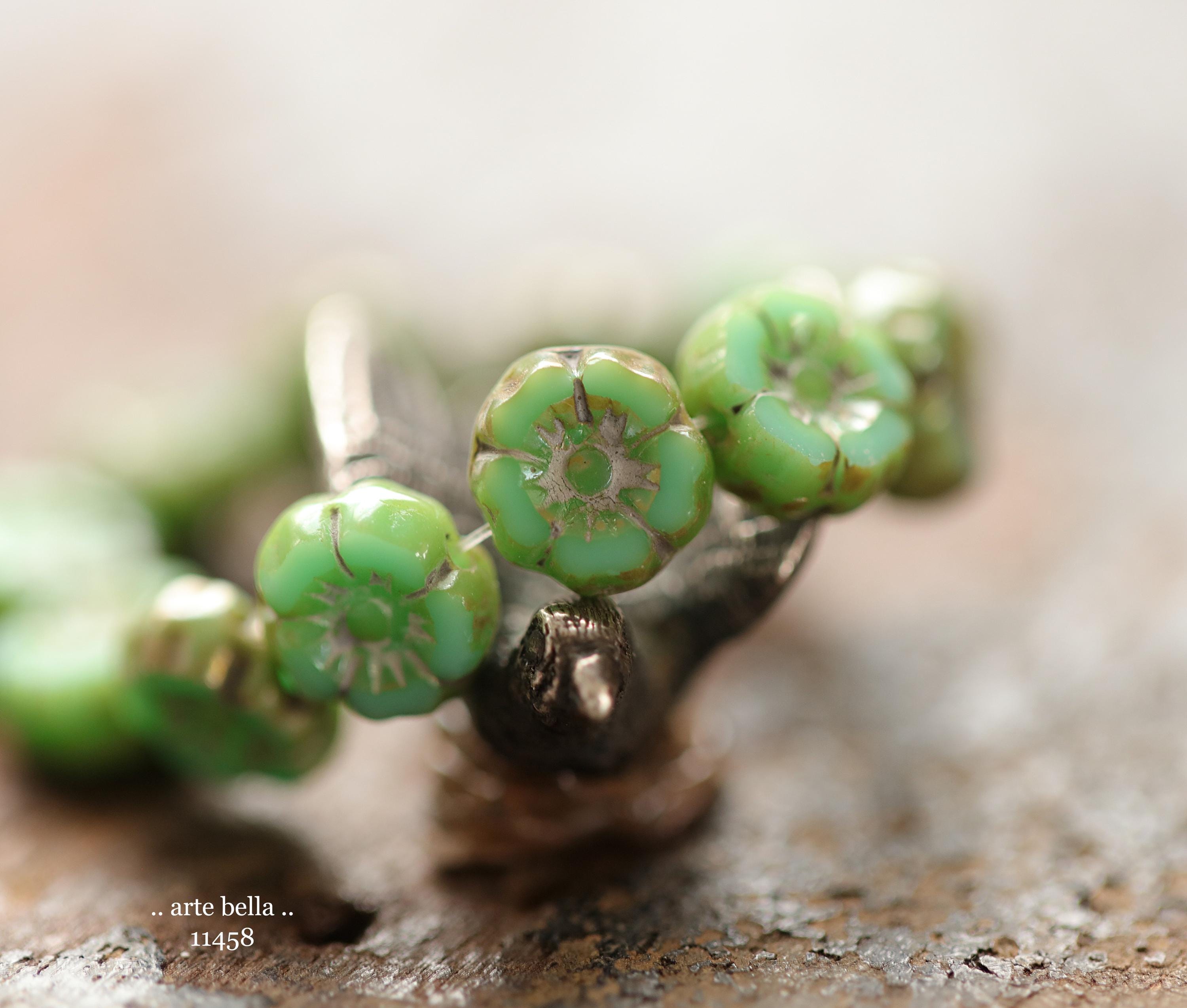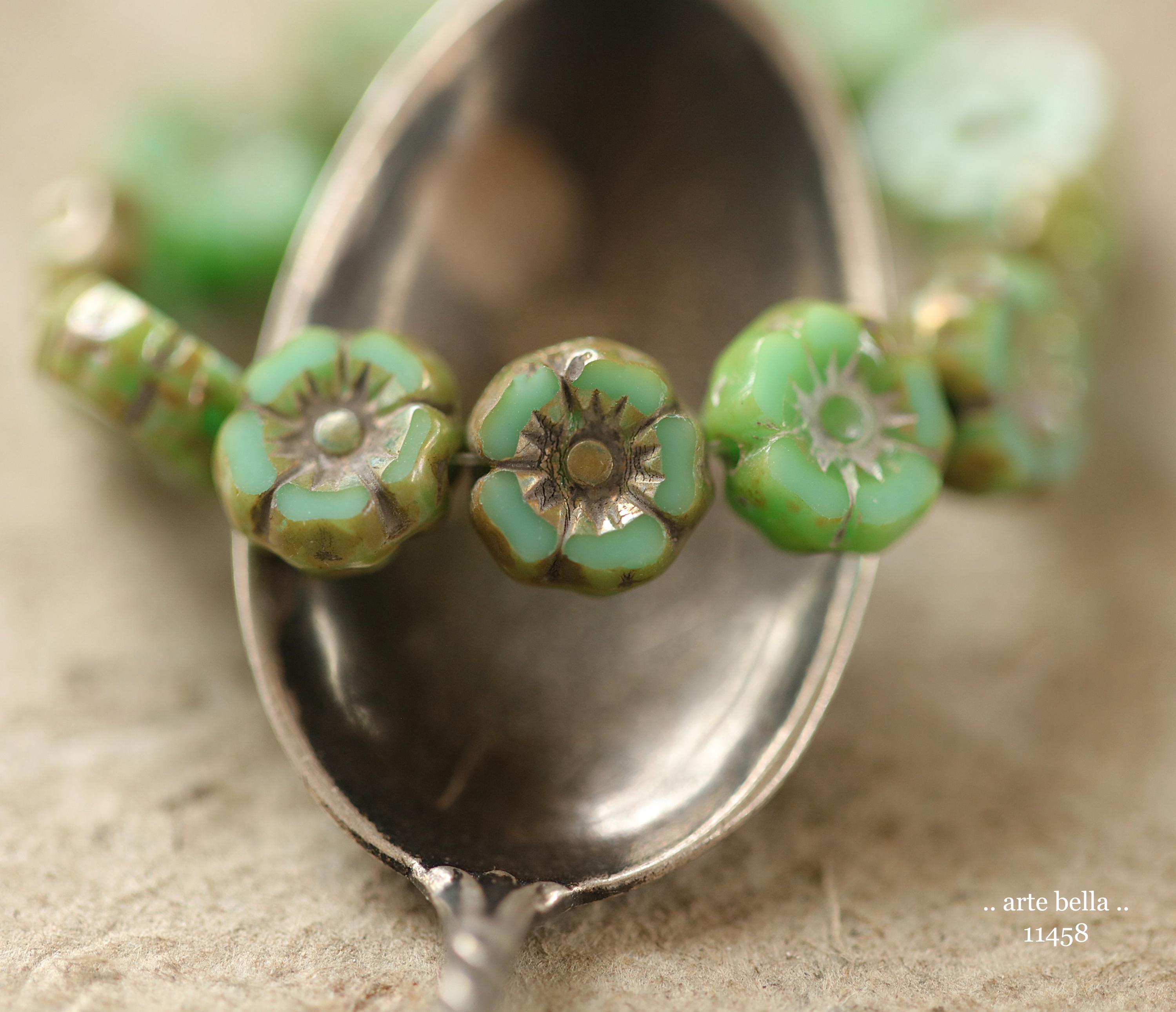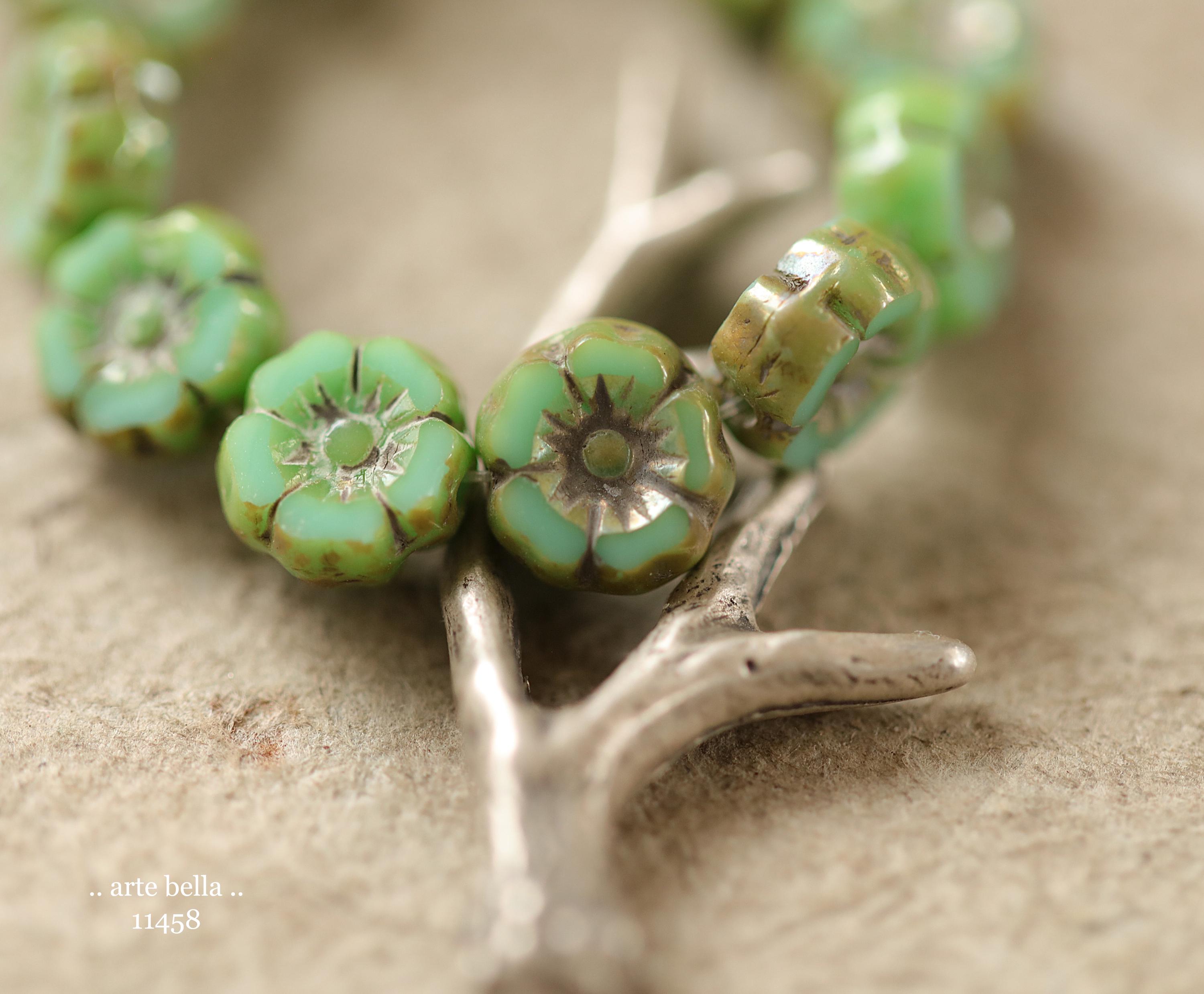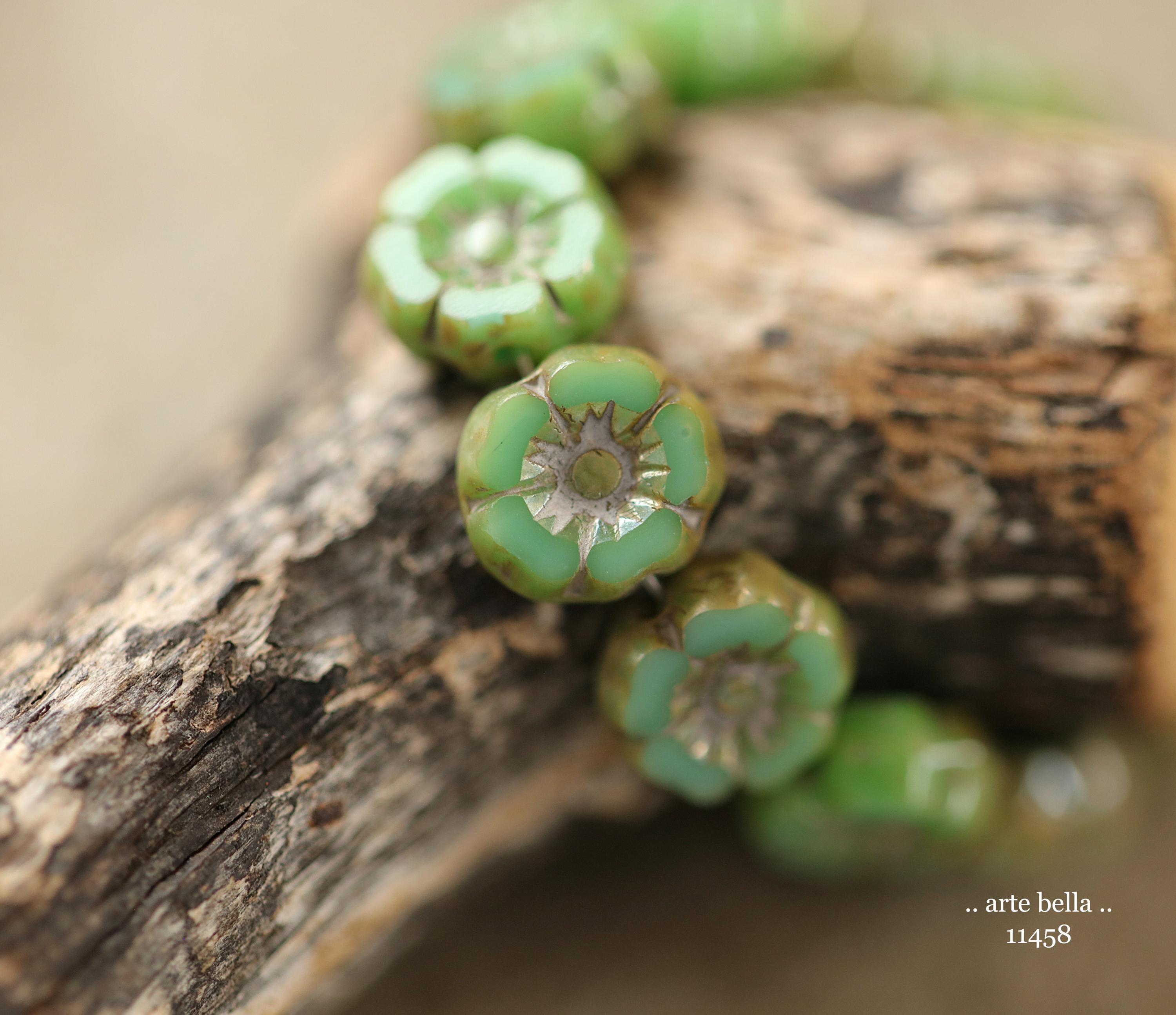 New .. EARTHY TURQUOISE PANSY 7mm .. 12 Premium Luster Picasso Czech Glass Petite Hibiscus Flower Beads (11458-st) .. jewelry supplies