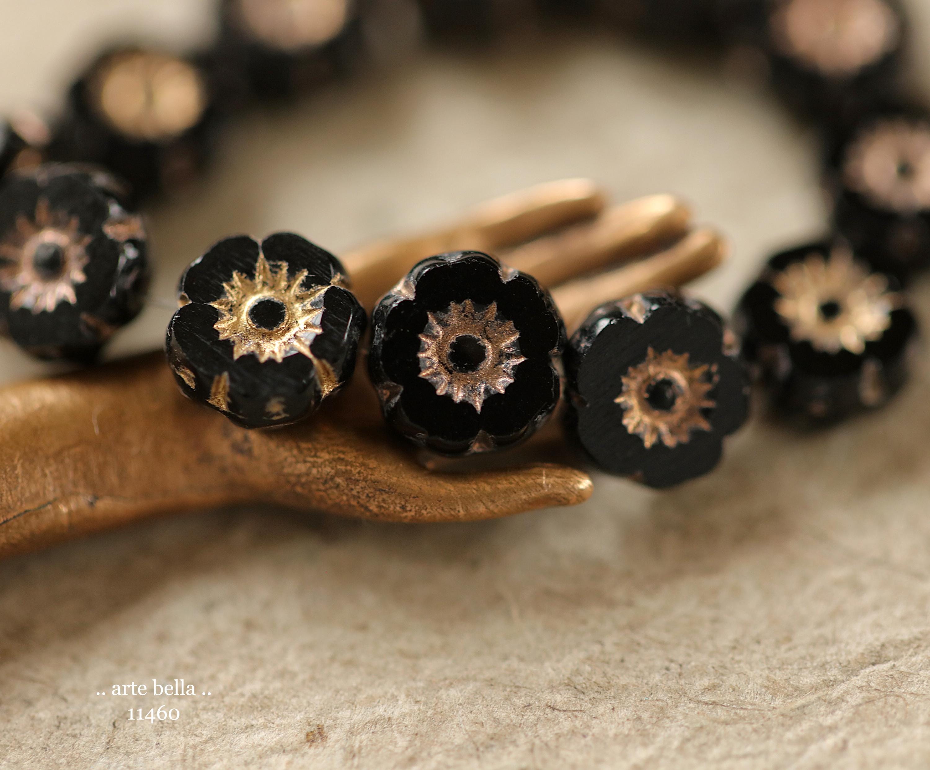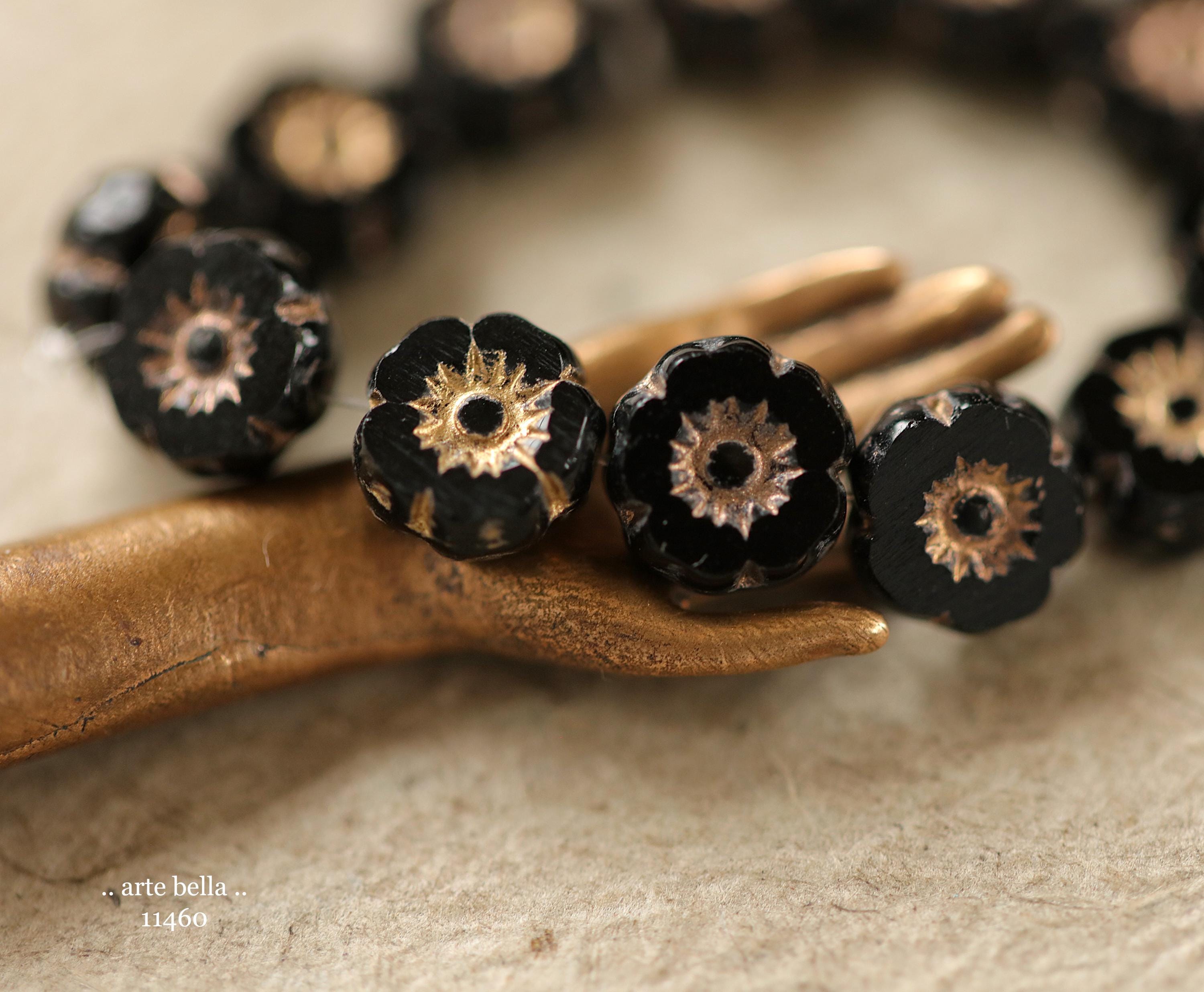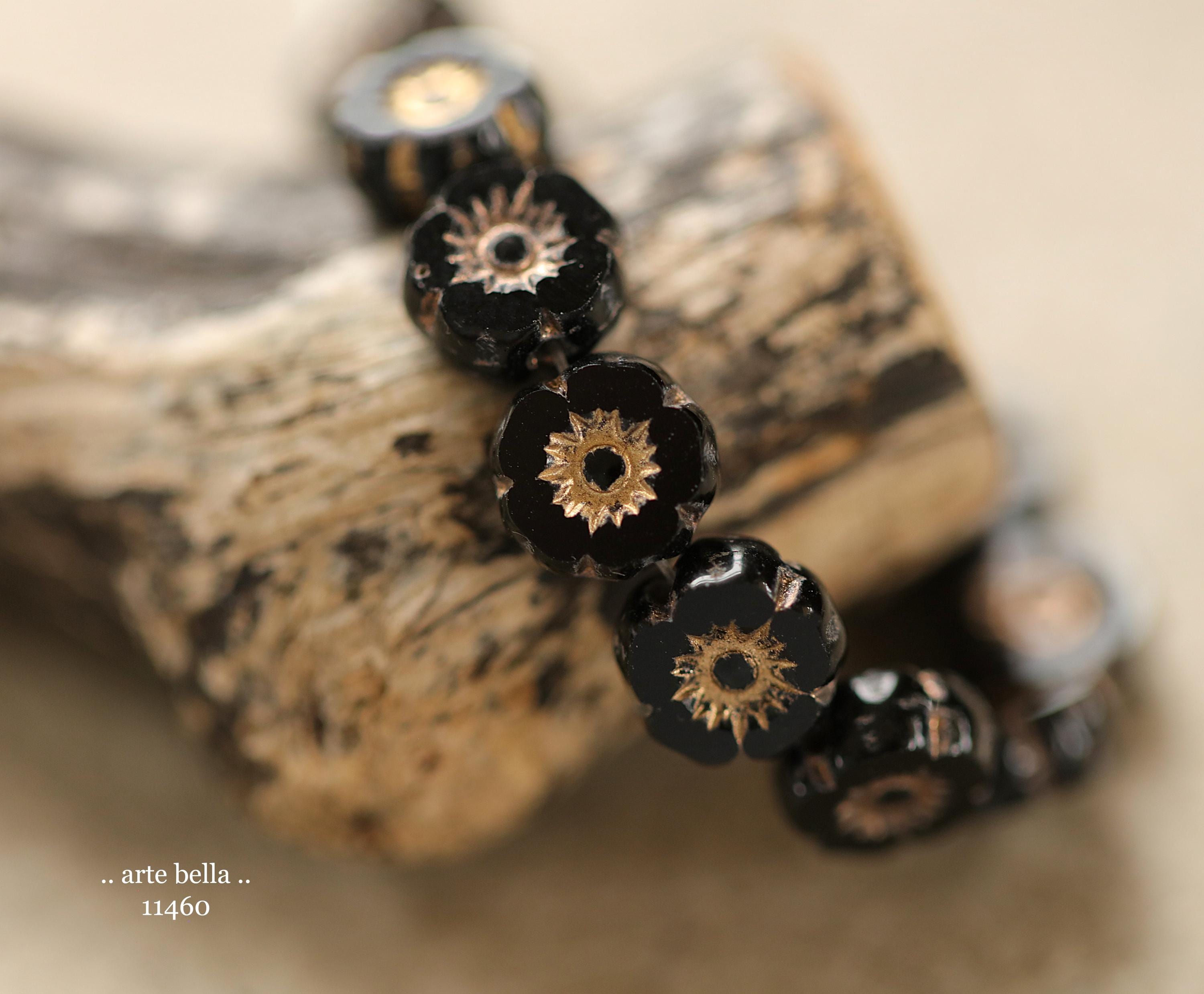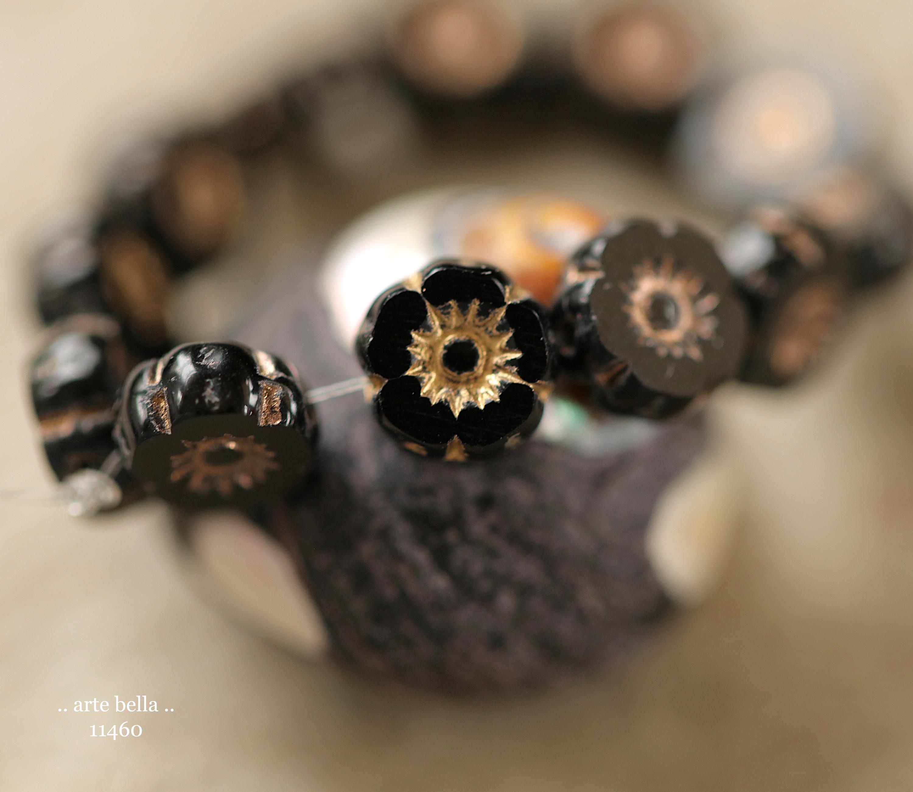 Pretty opaque black glass with a gold and bronze metallic washes .. table cut and fire polished on the face of the beads. **You will receive a random mix of 12 beads.**