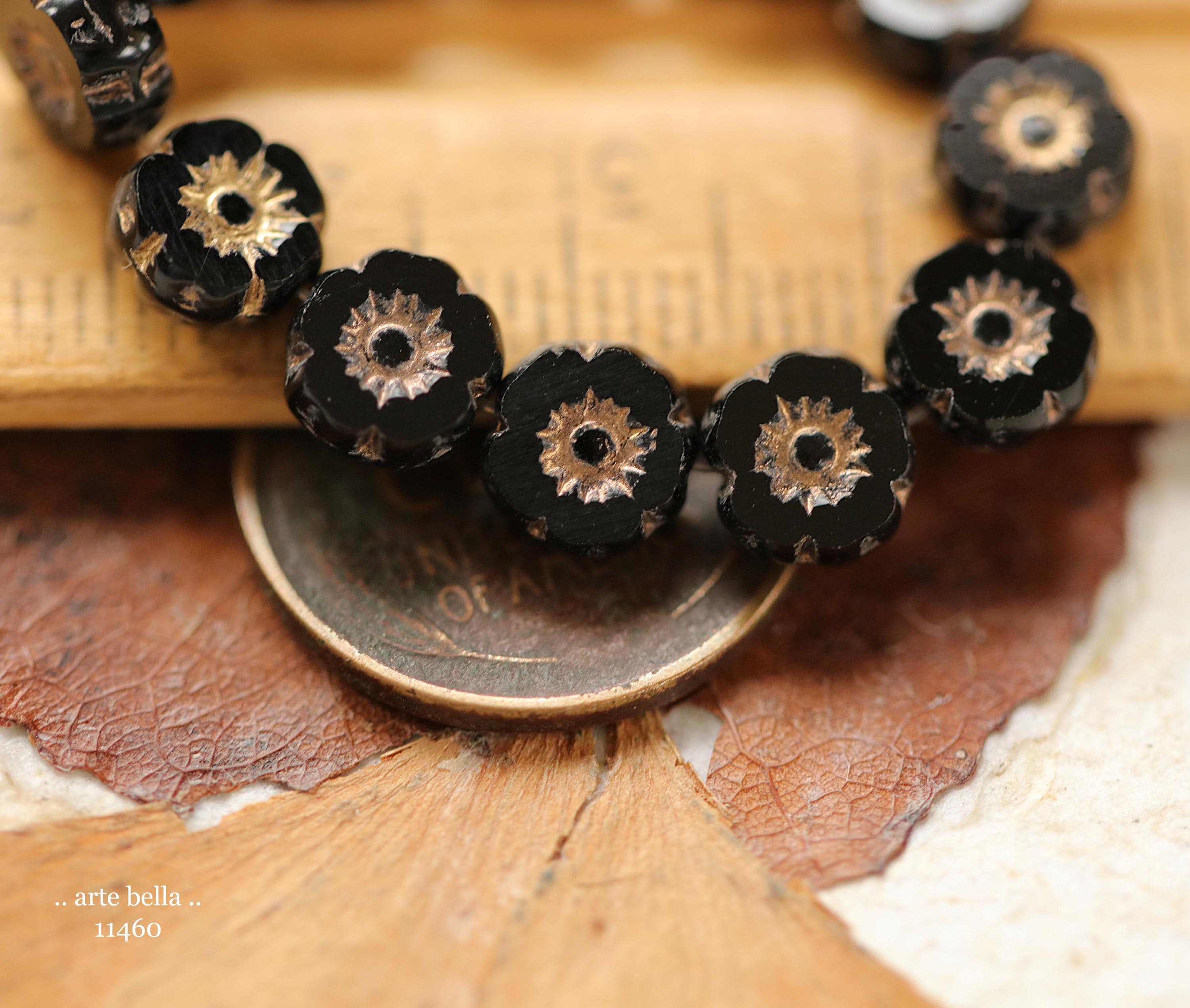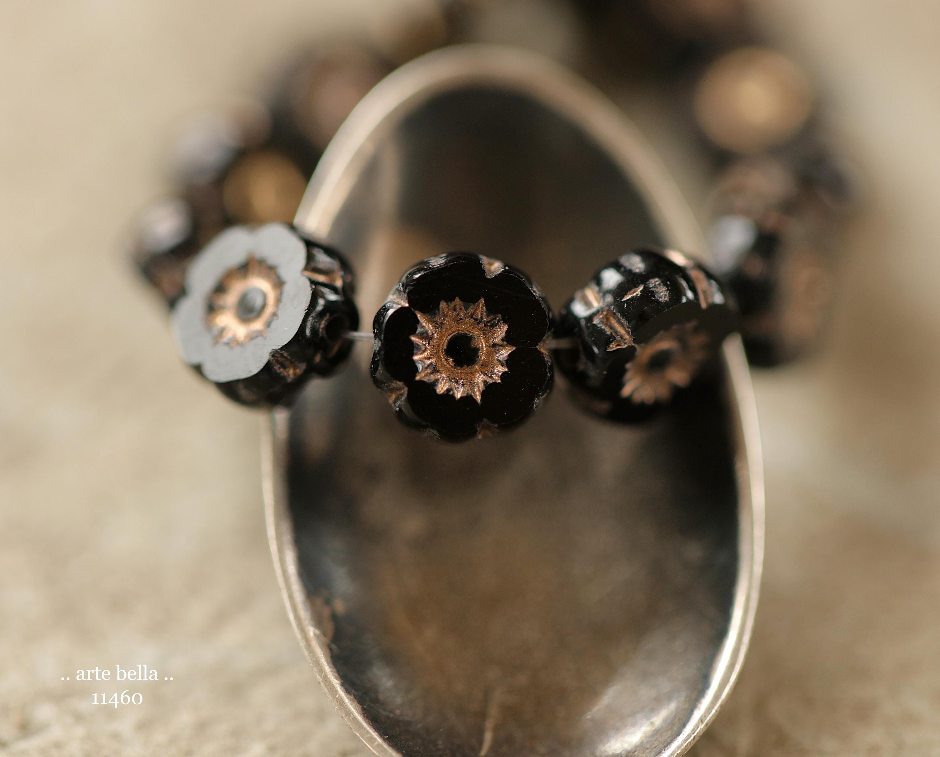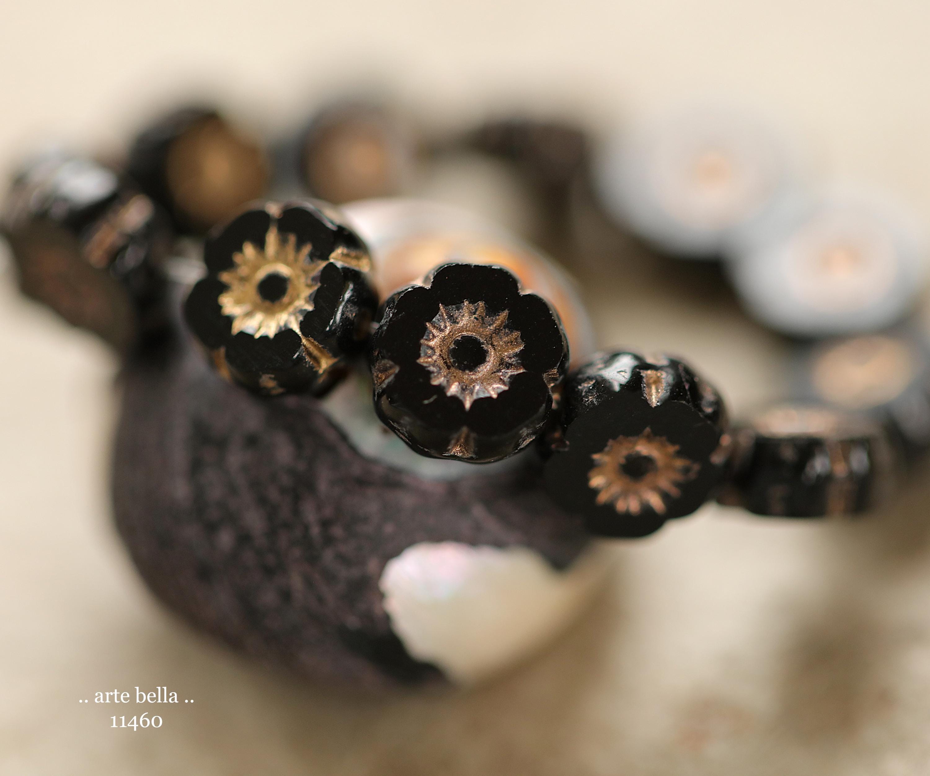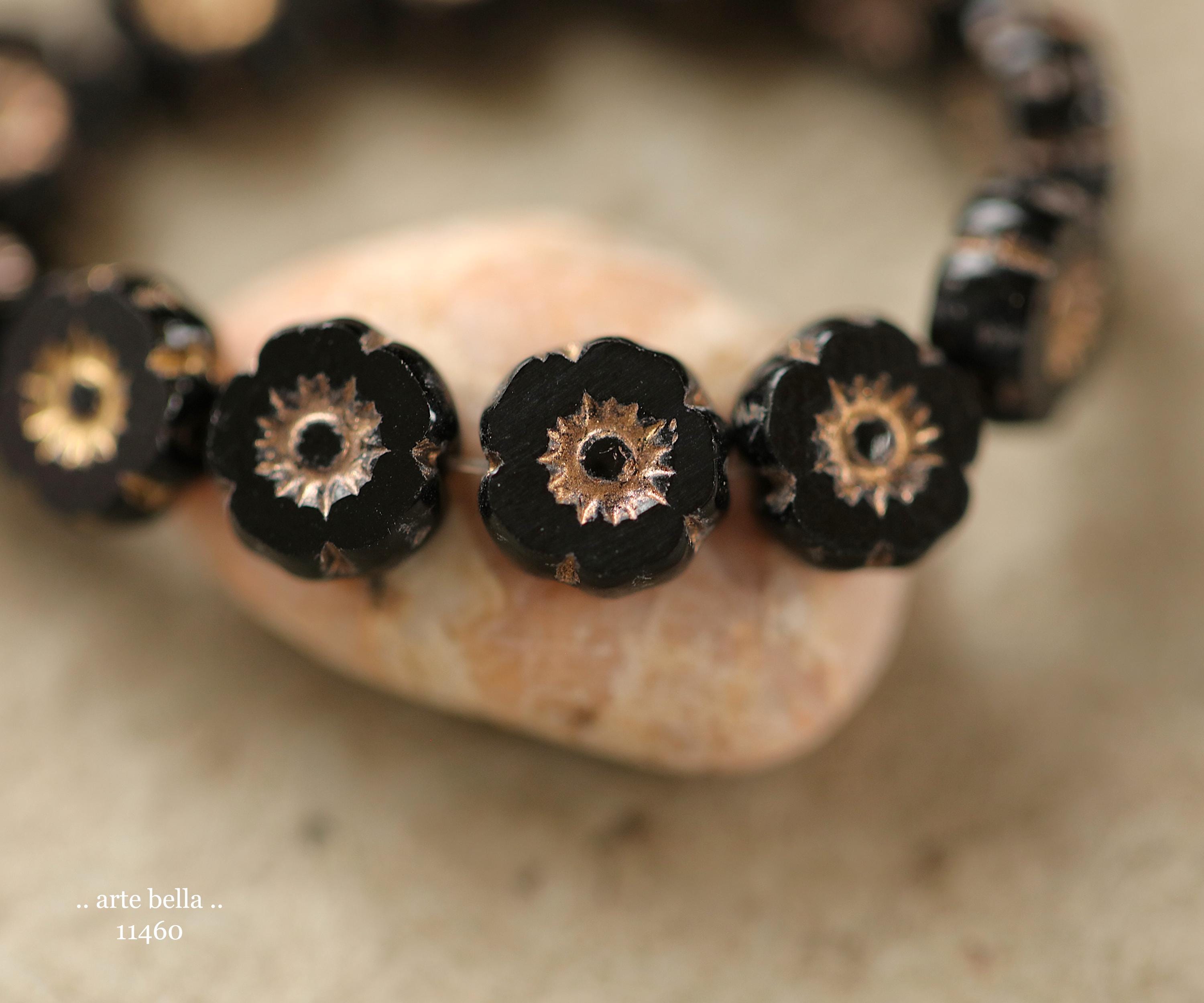 Pretty opaque black glass with a gold and bronze metallic washes .. table cut and fire polished on the face of the beads. **You will receive a random mix of 12 beads.**