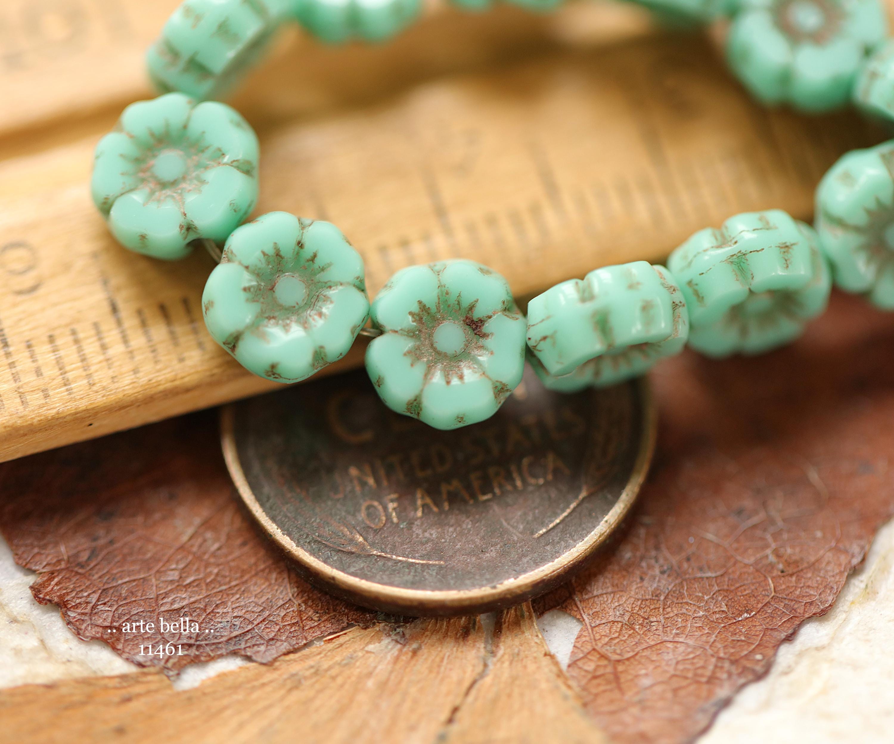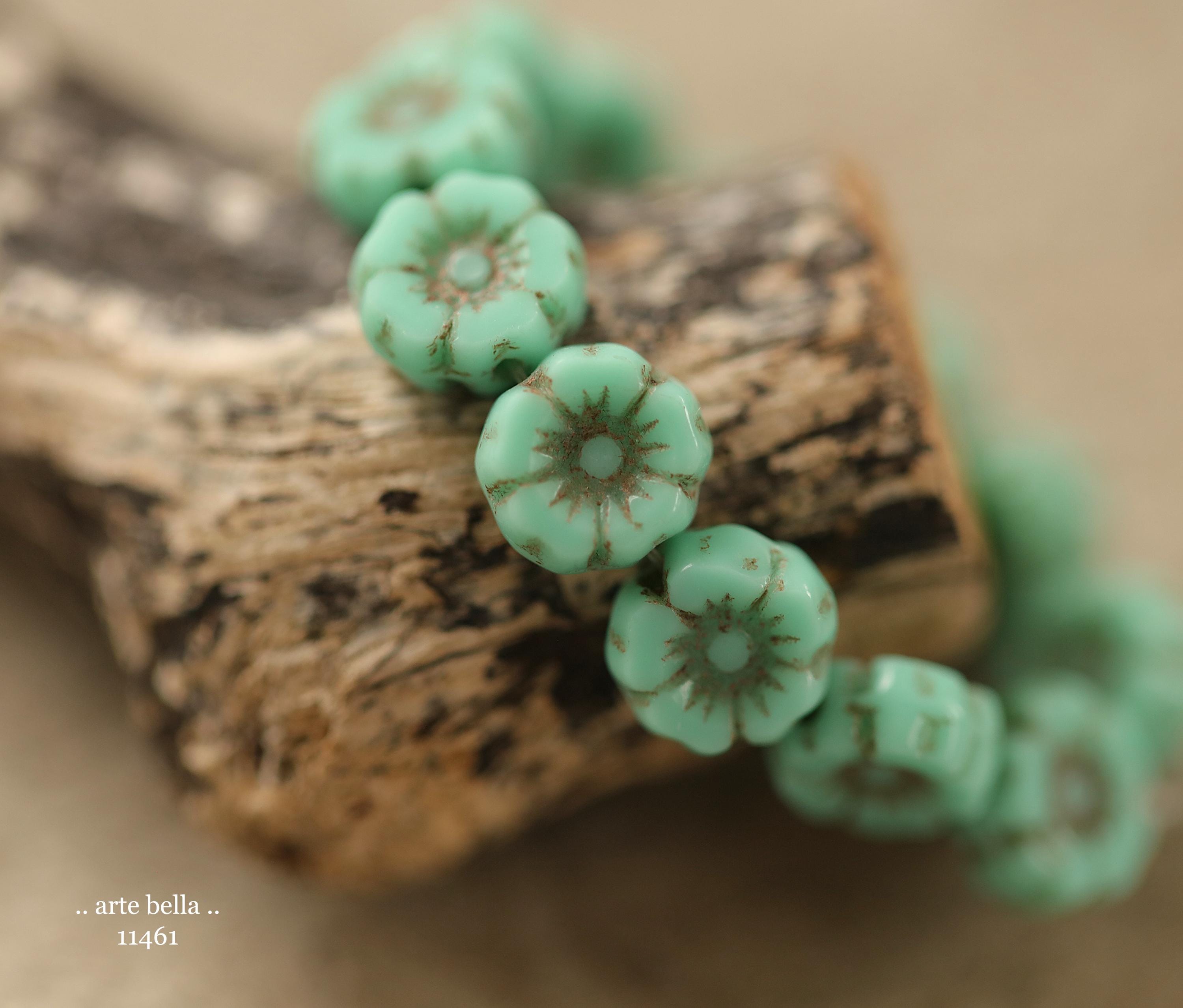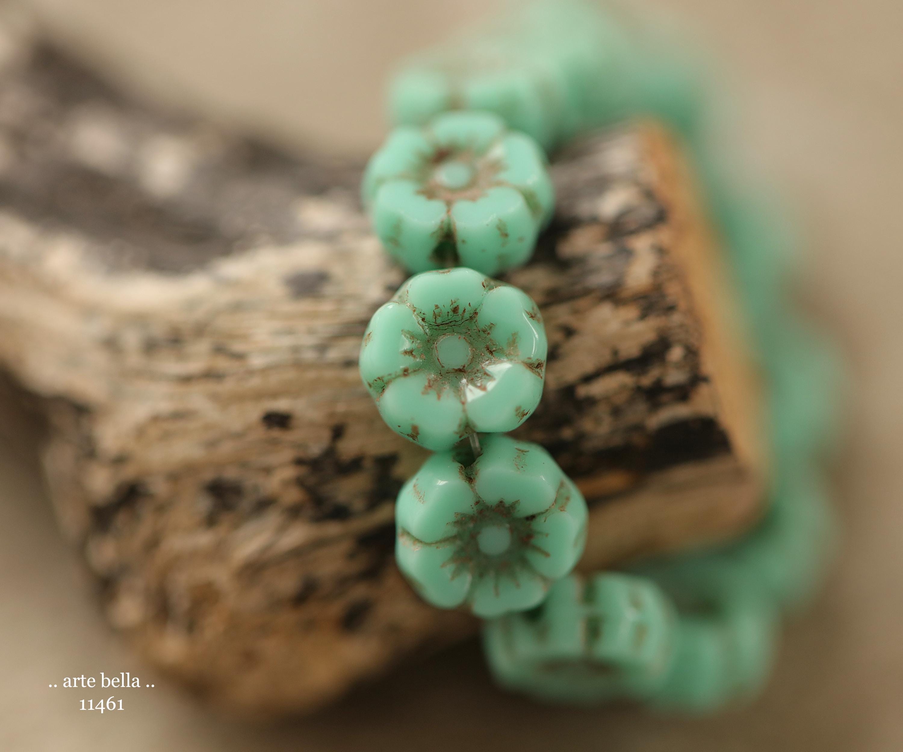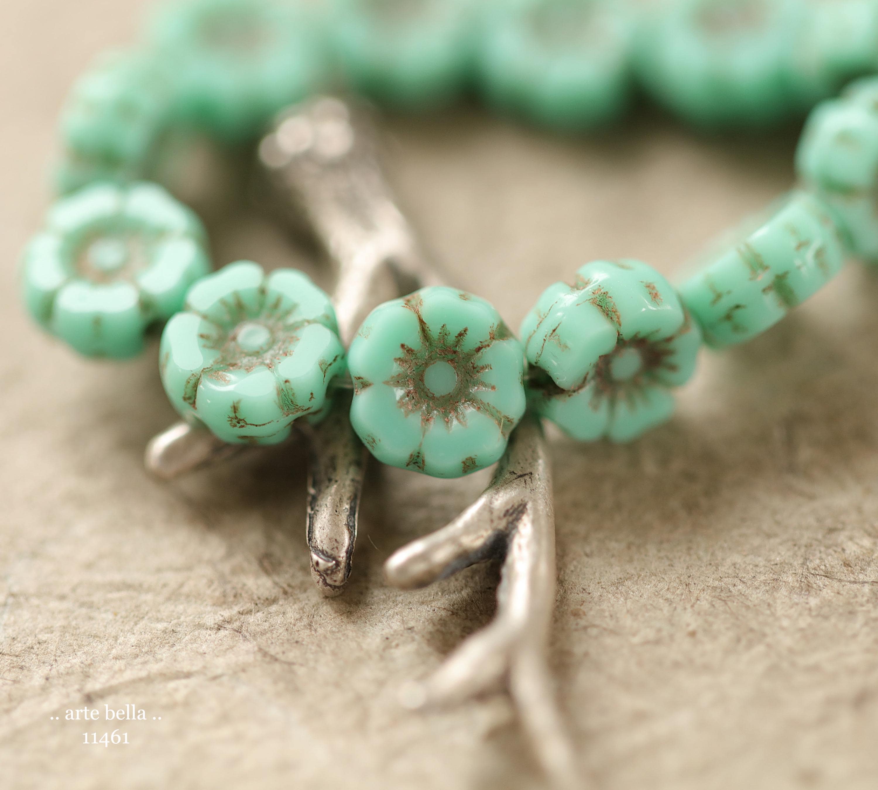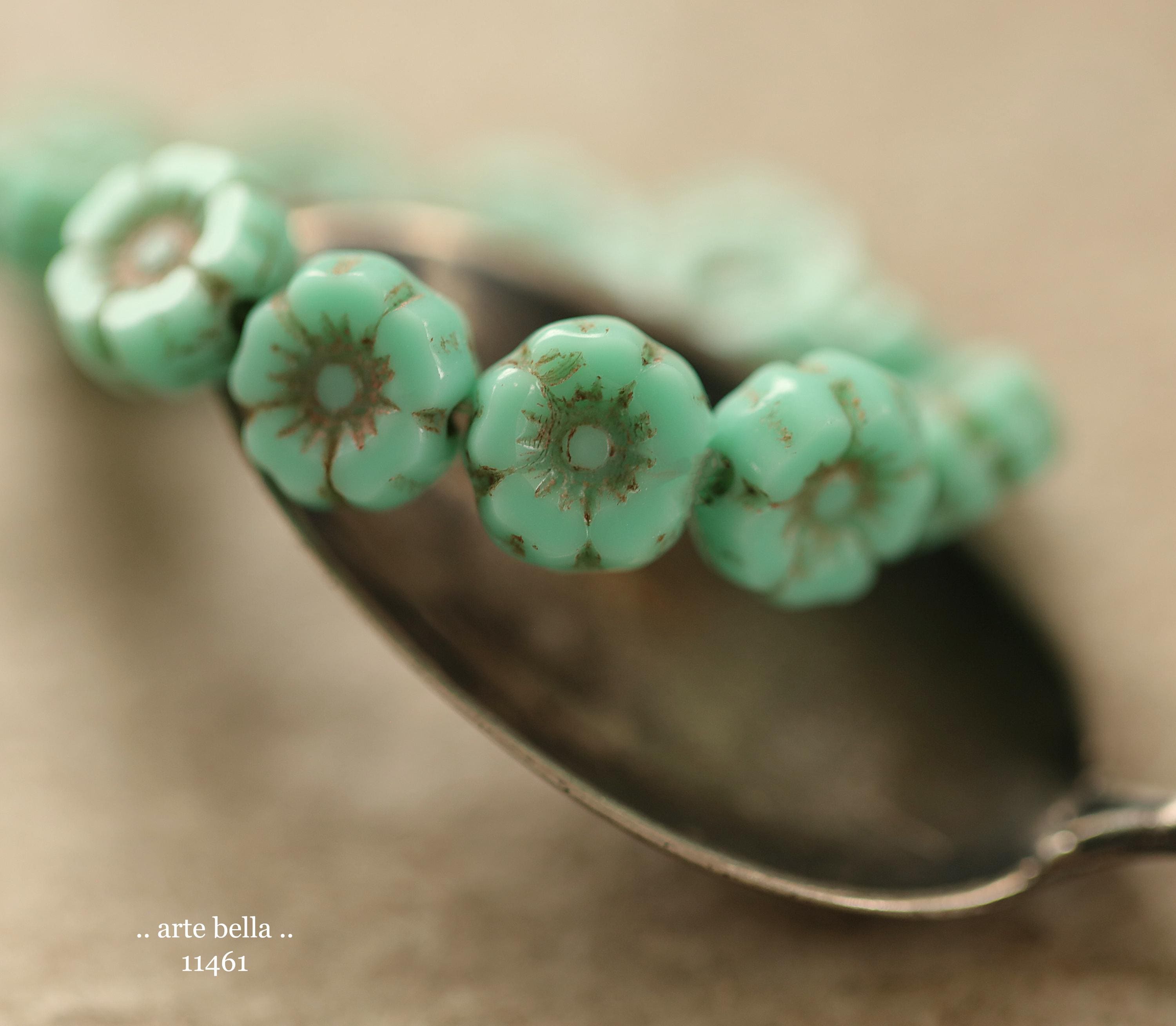 New .. TURQUOISE PANSY 7mm .. 12 Premium Czech Glass Petite Hibiscus Flower Beads (11461-st) .. jewelry supplies