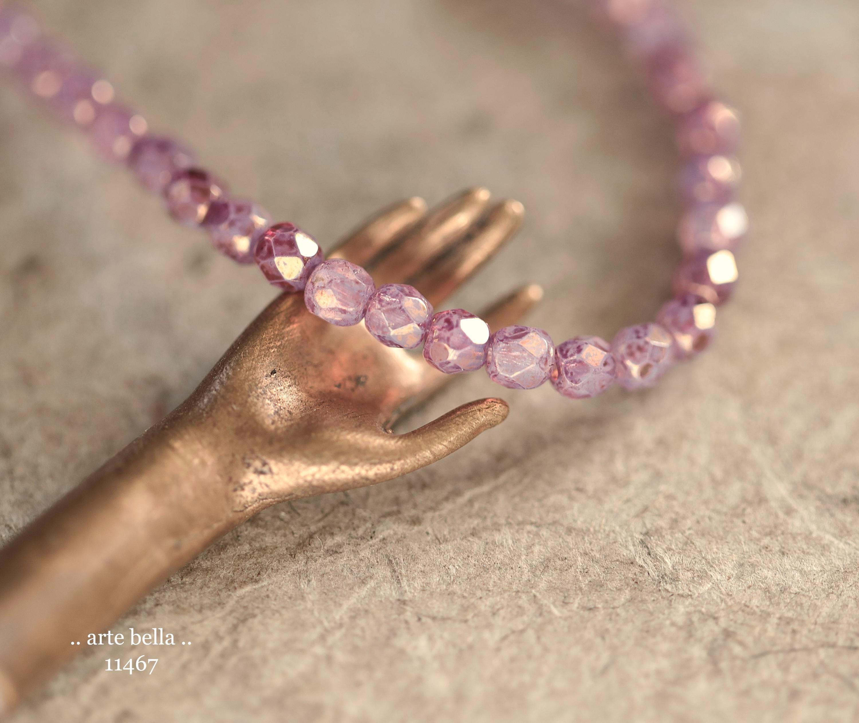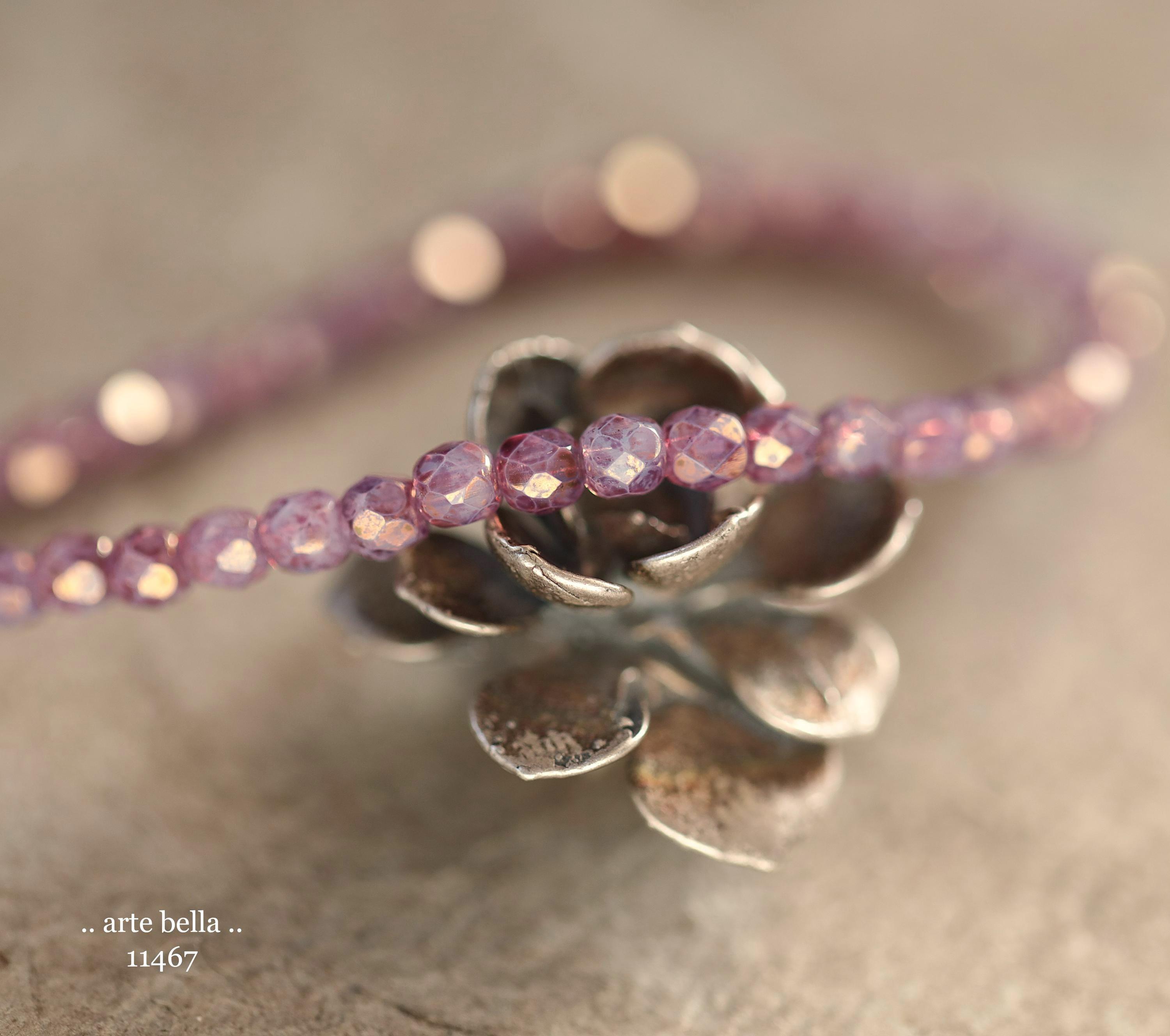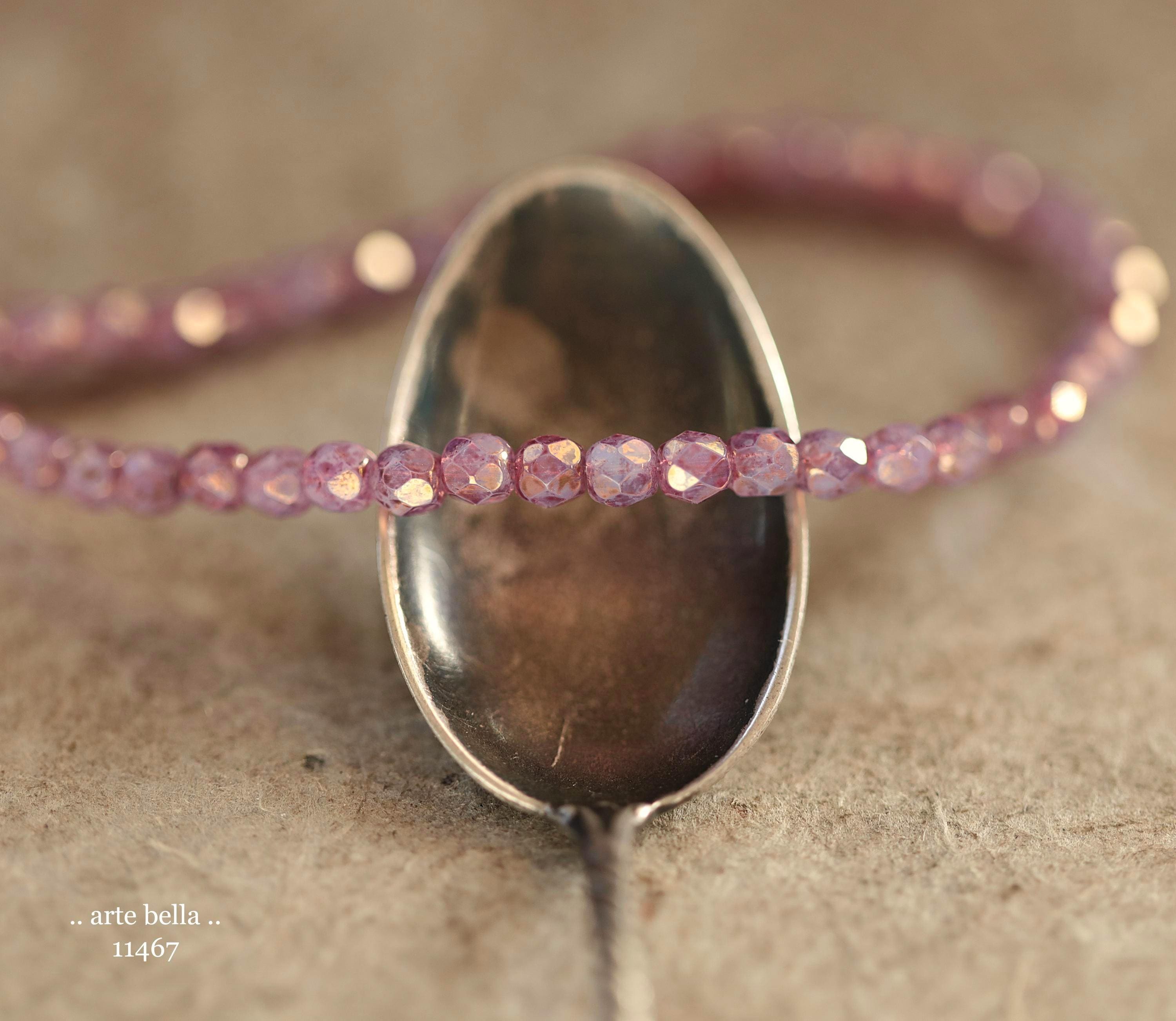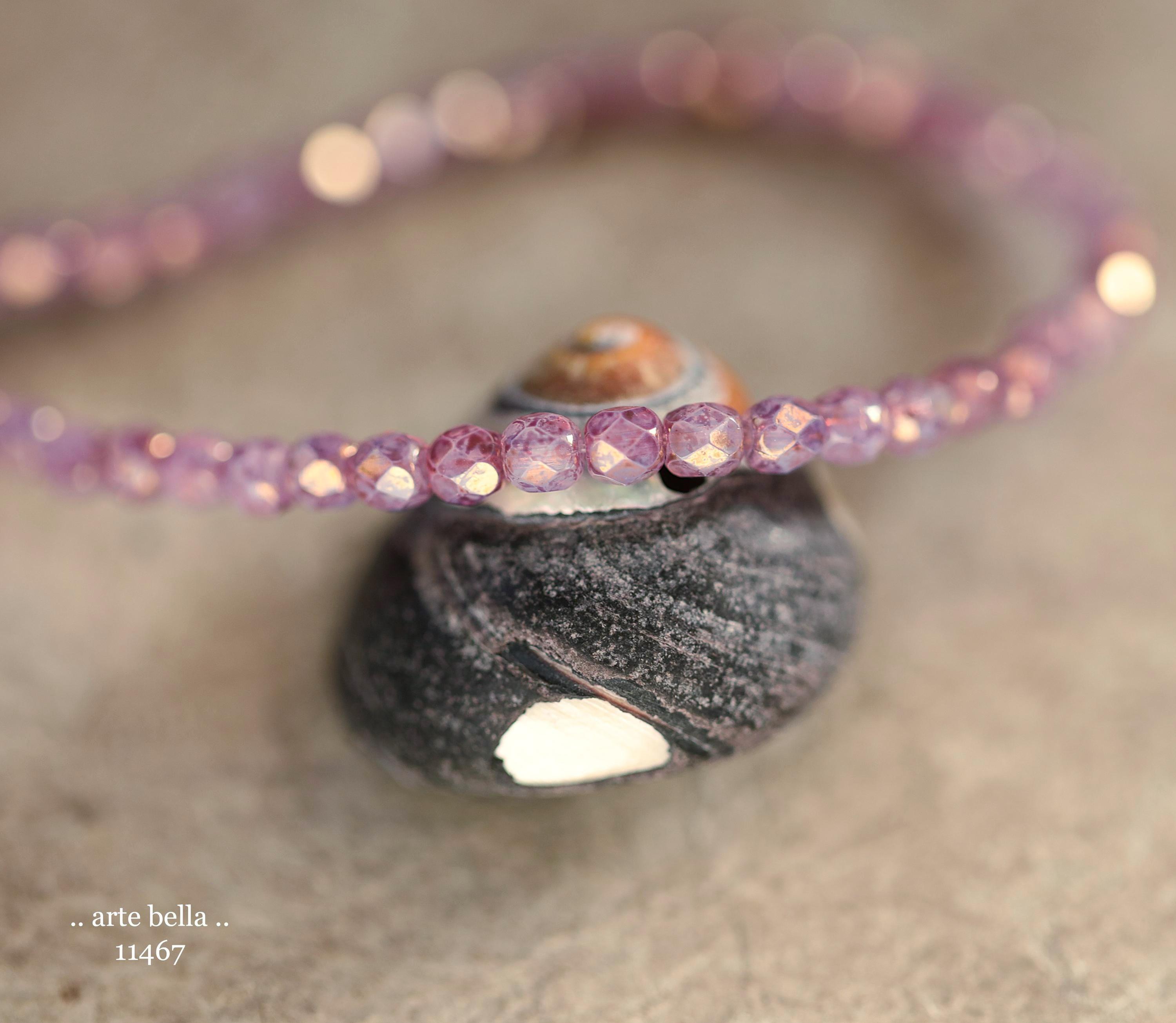 Tiny faceted rounds in thistle purple opaline glass and a gold metallic luster finish.