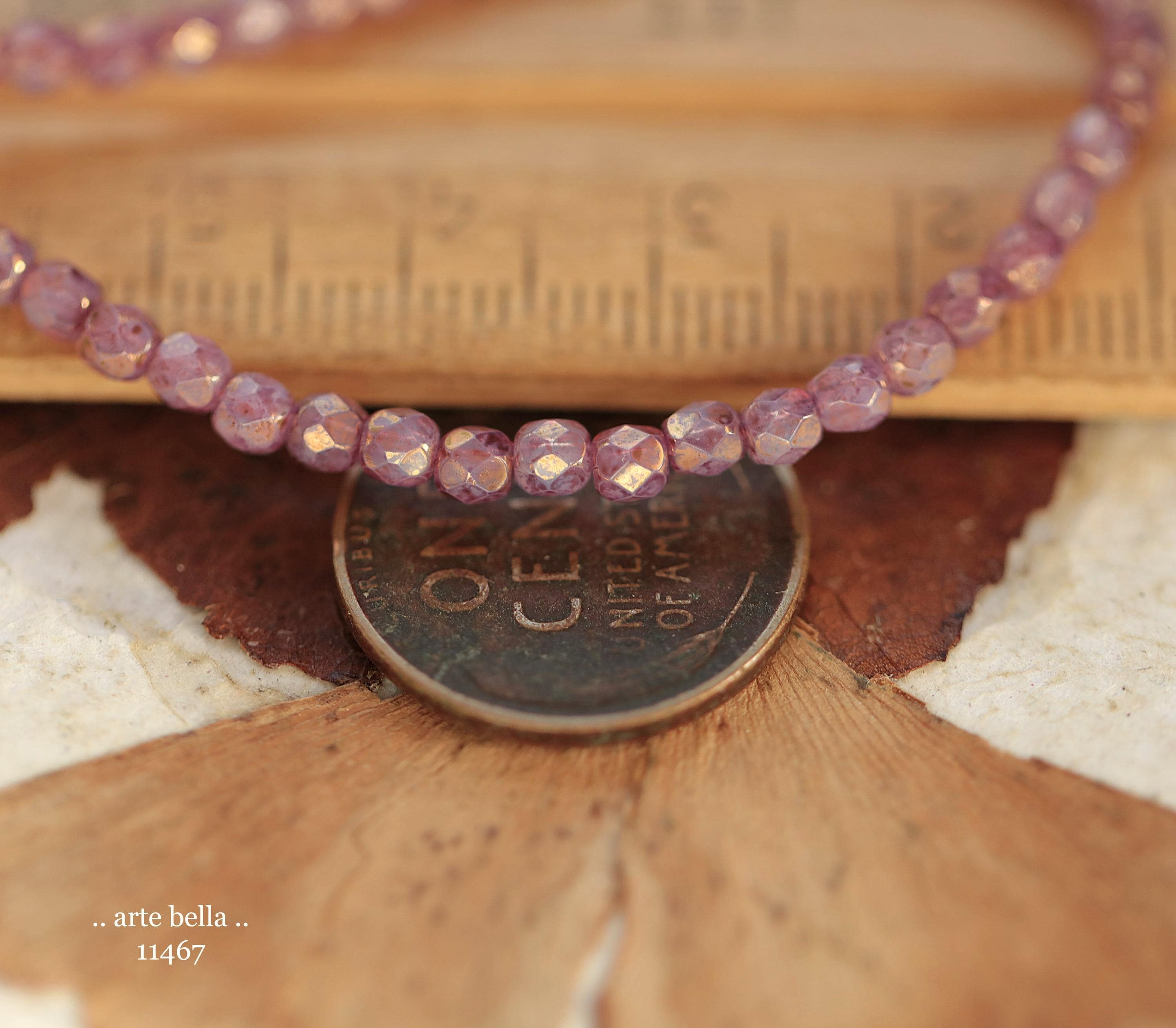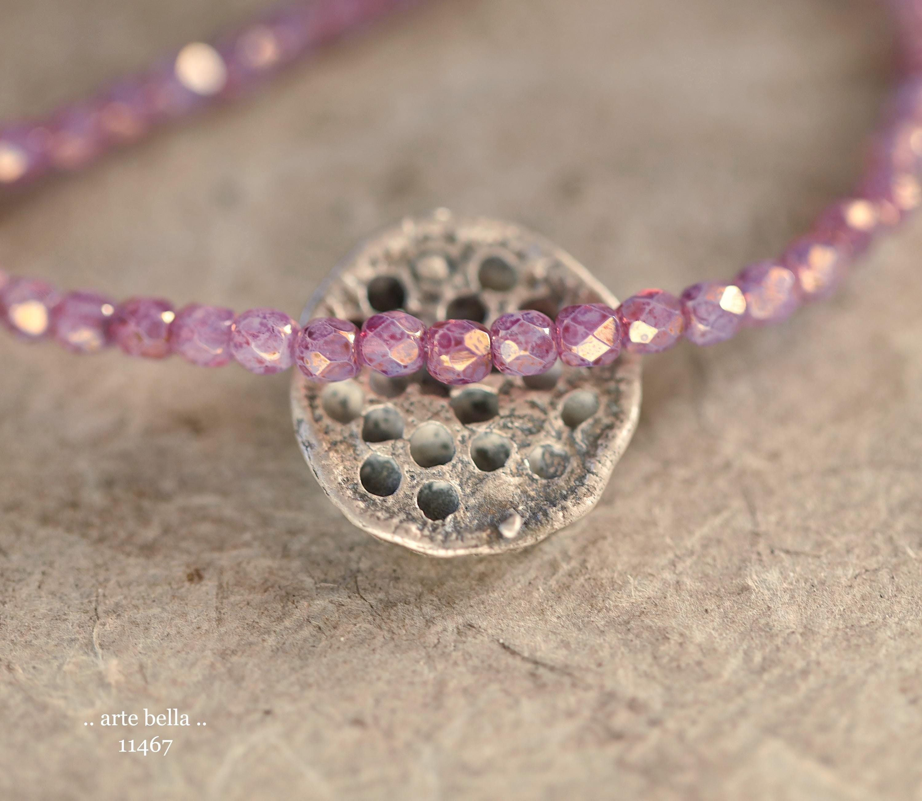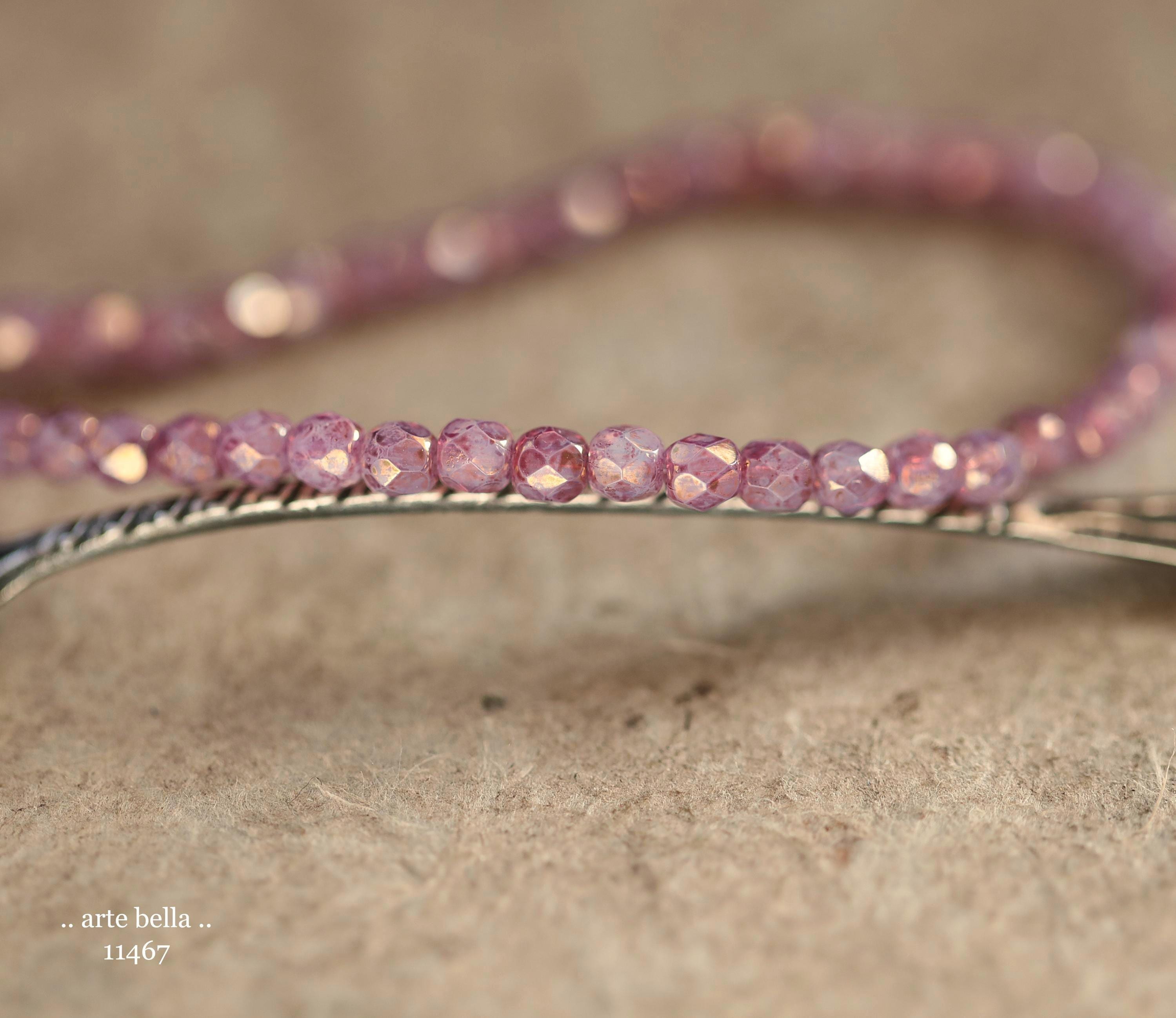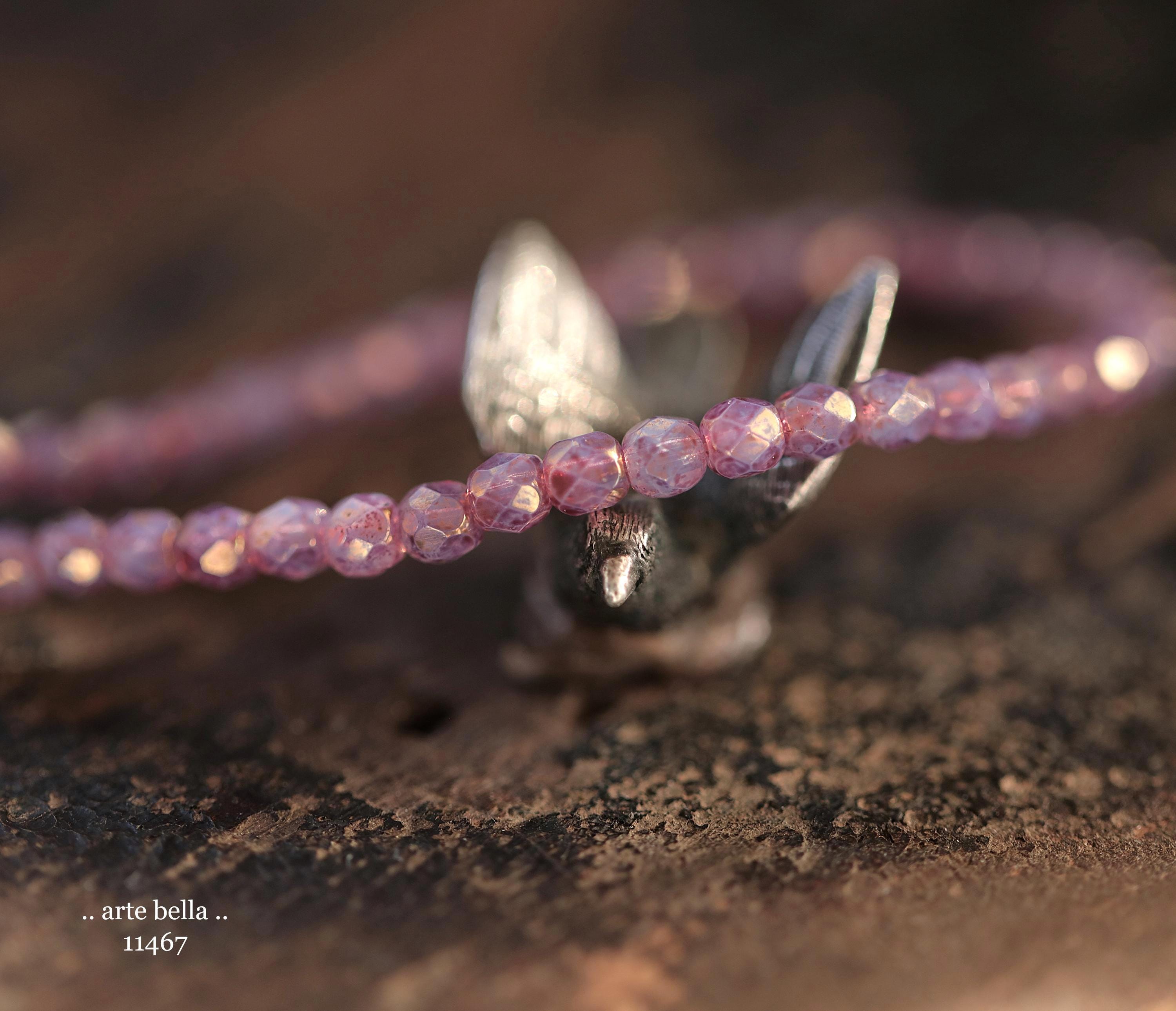 Tiny faceted rounds in thistle purple opaline glass and a gold metallic luster finish.