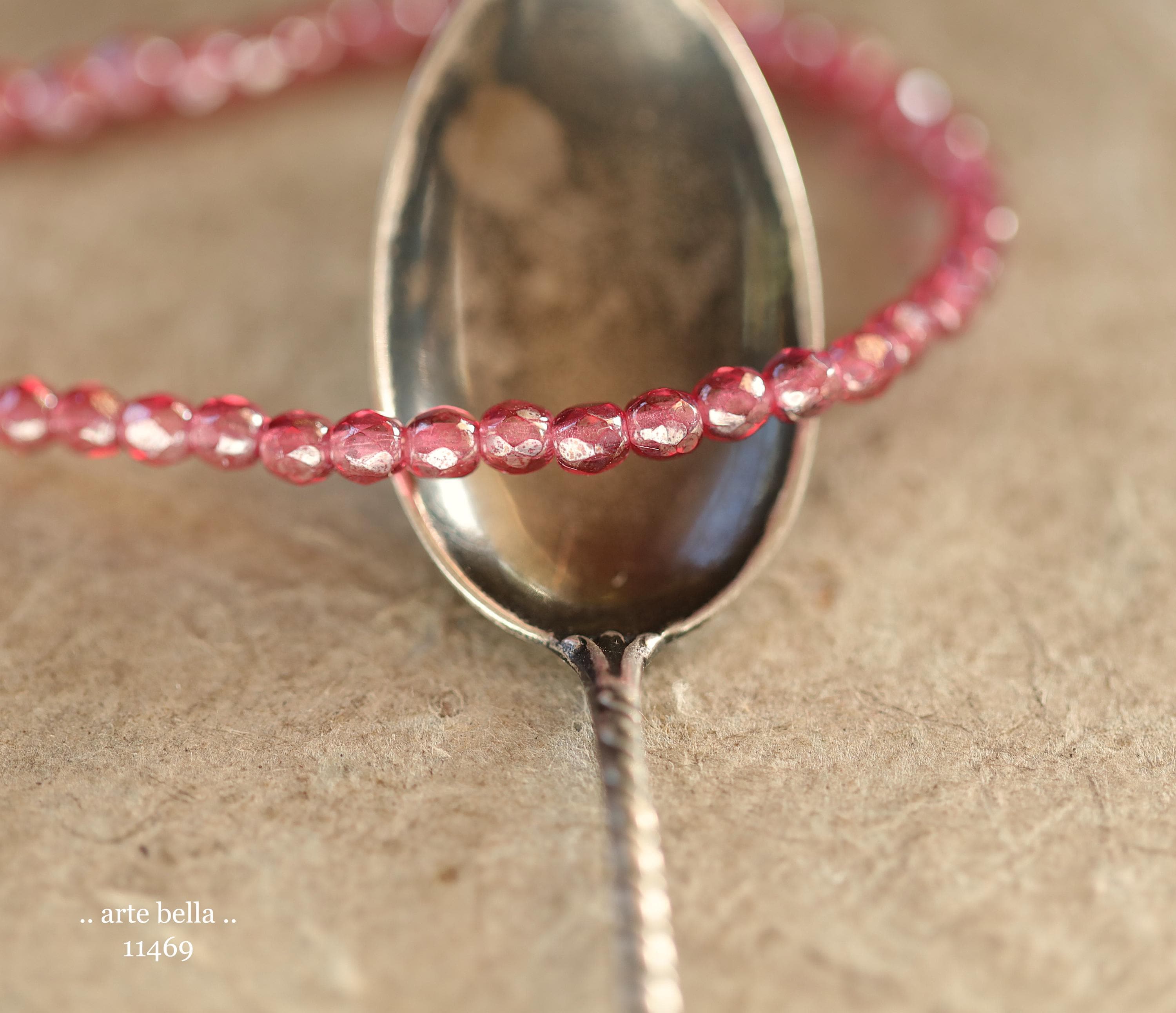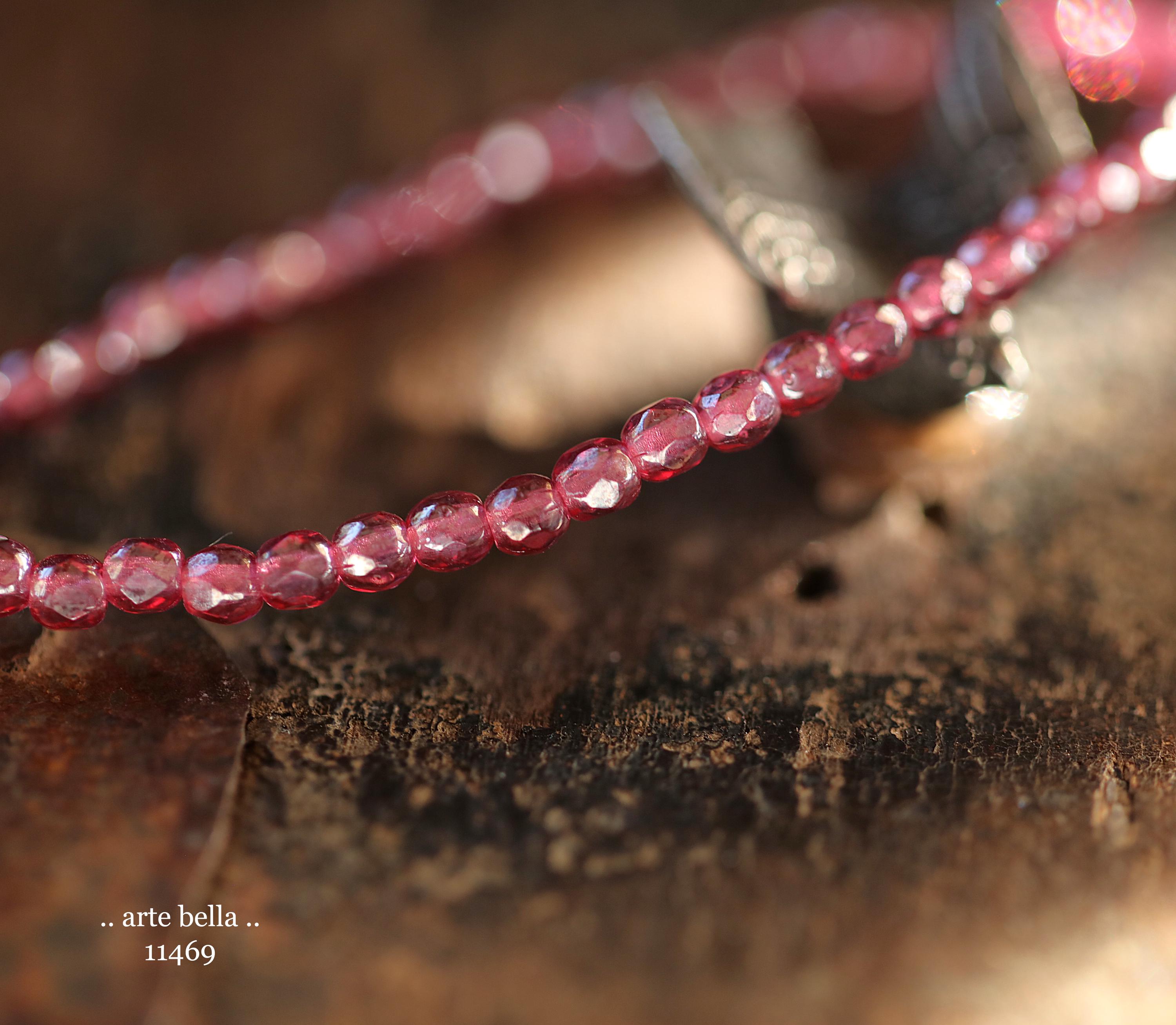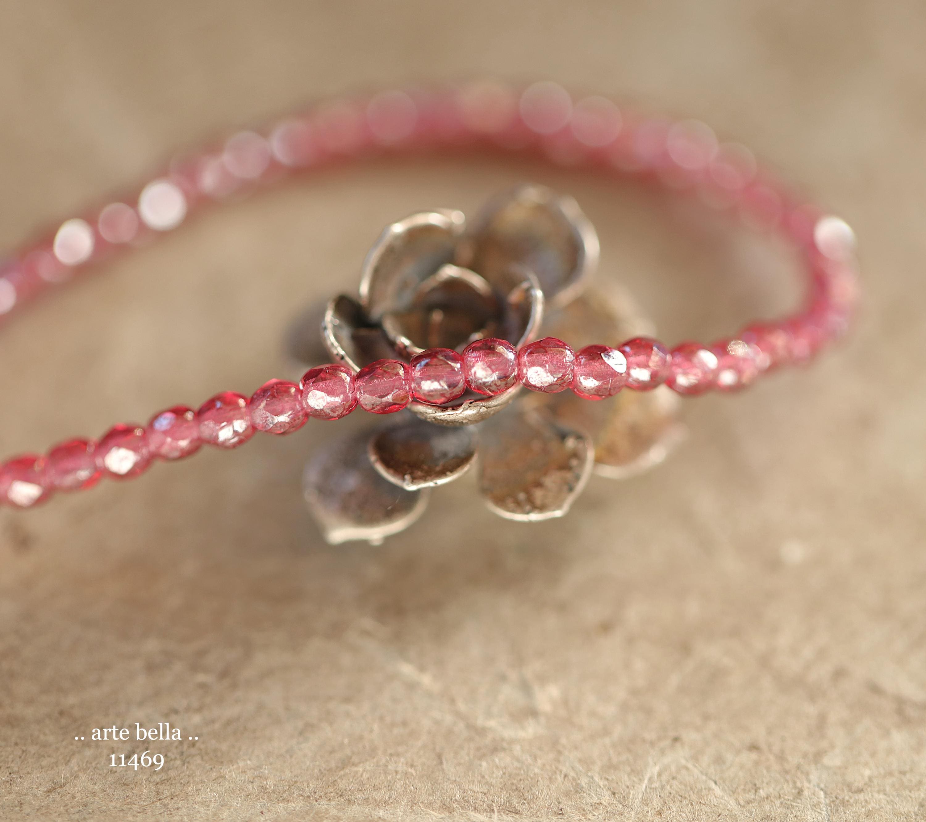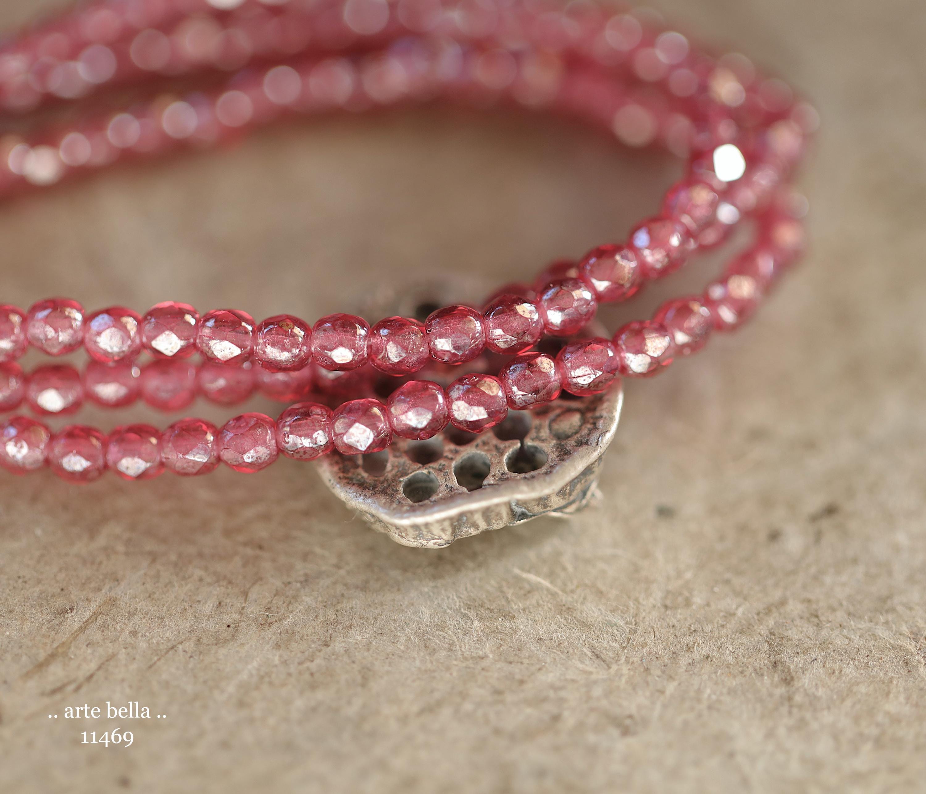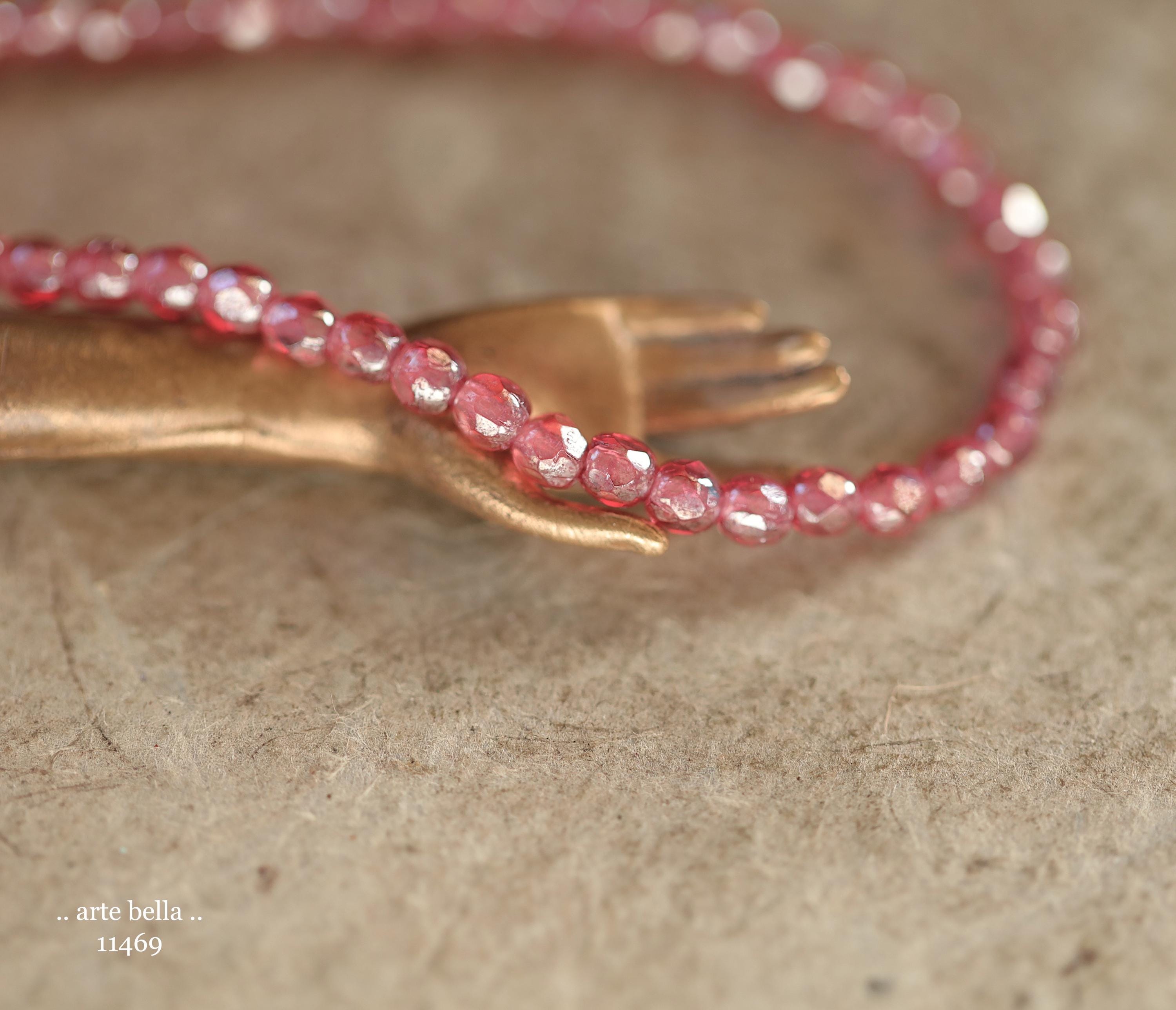 Tiny faceted rounds in fuchsia pink glass and a silver metallic luster finish.