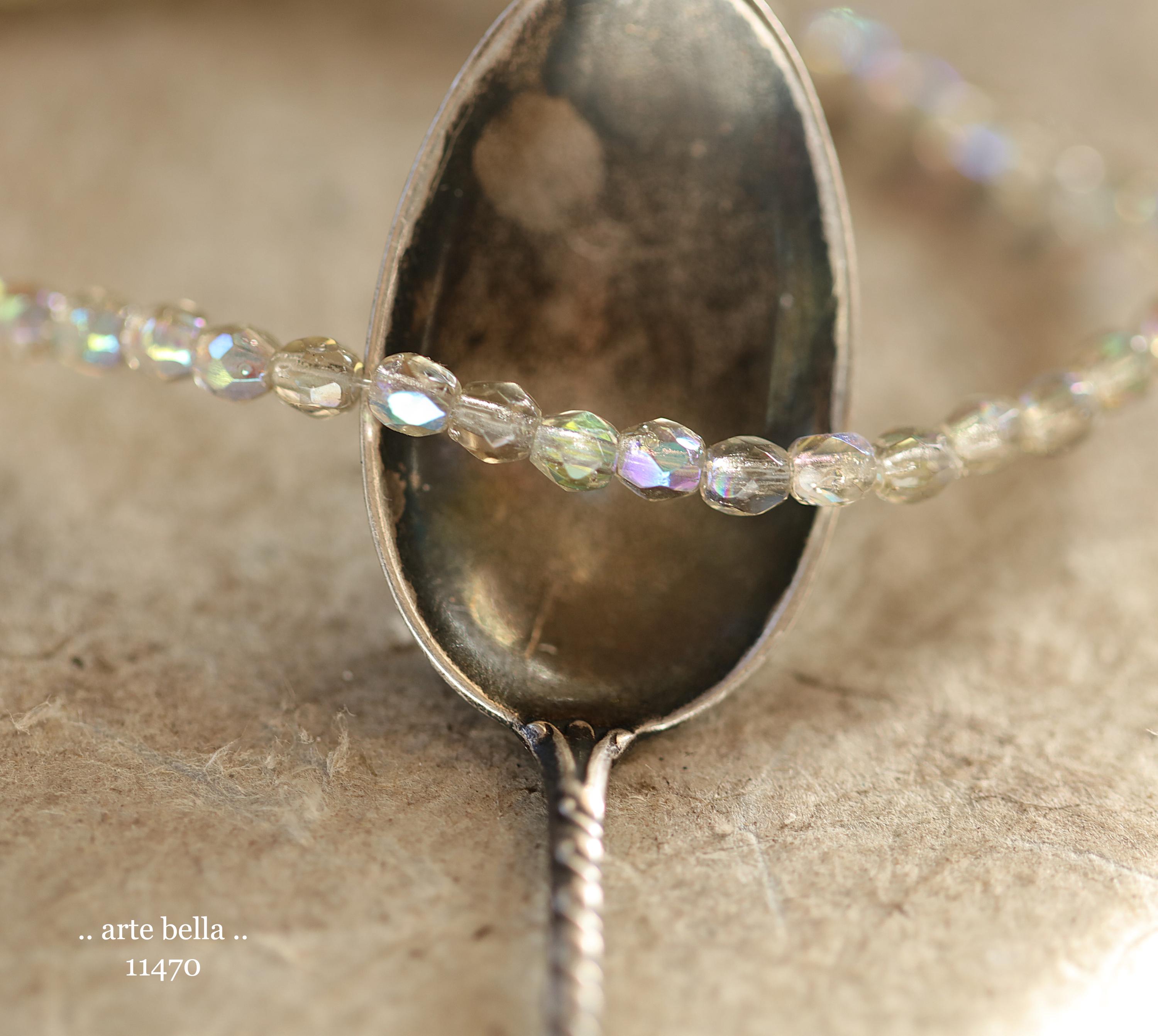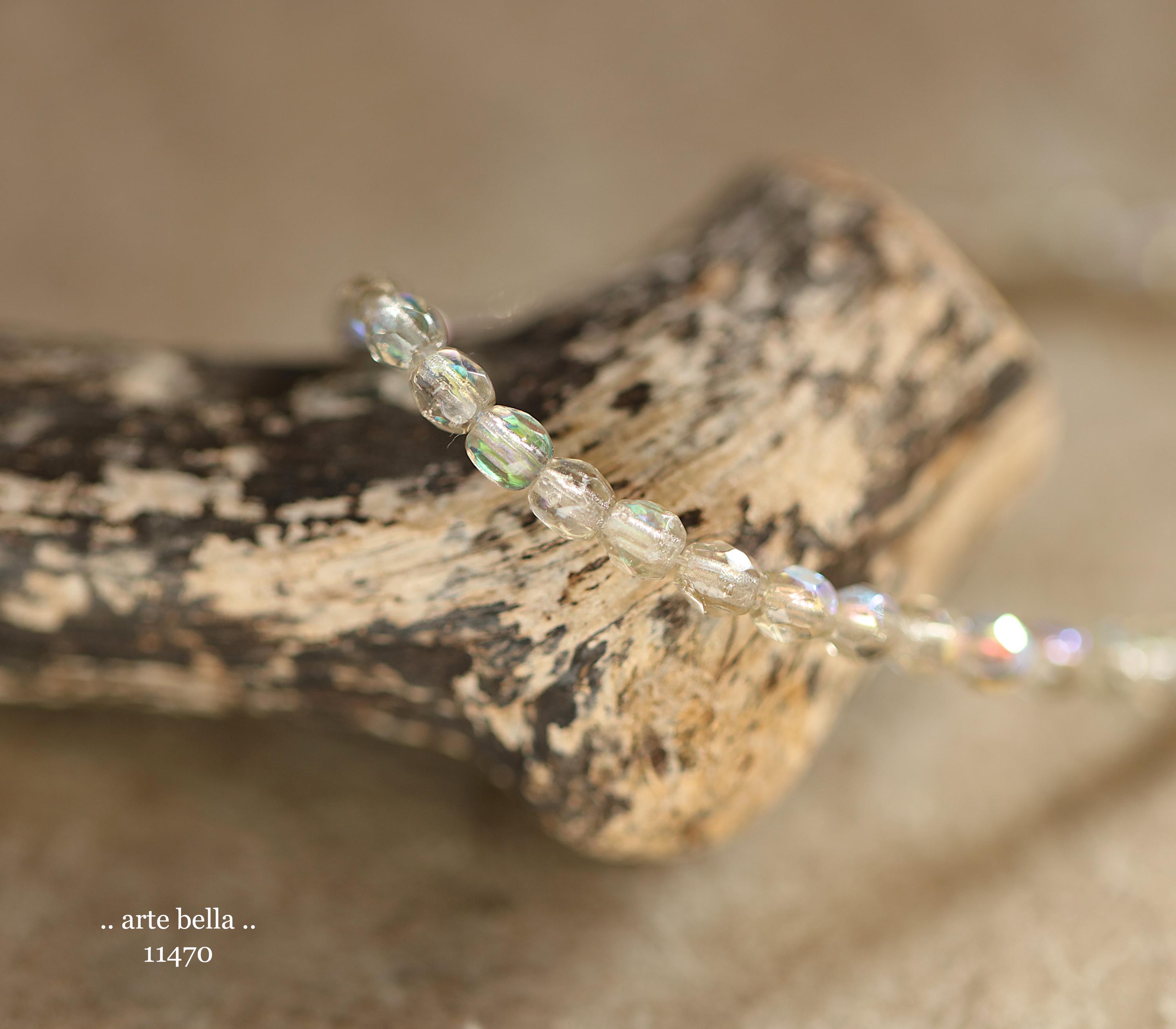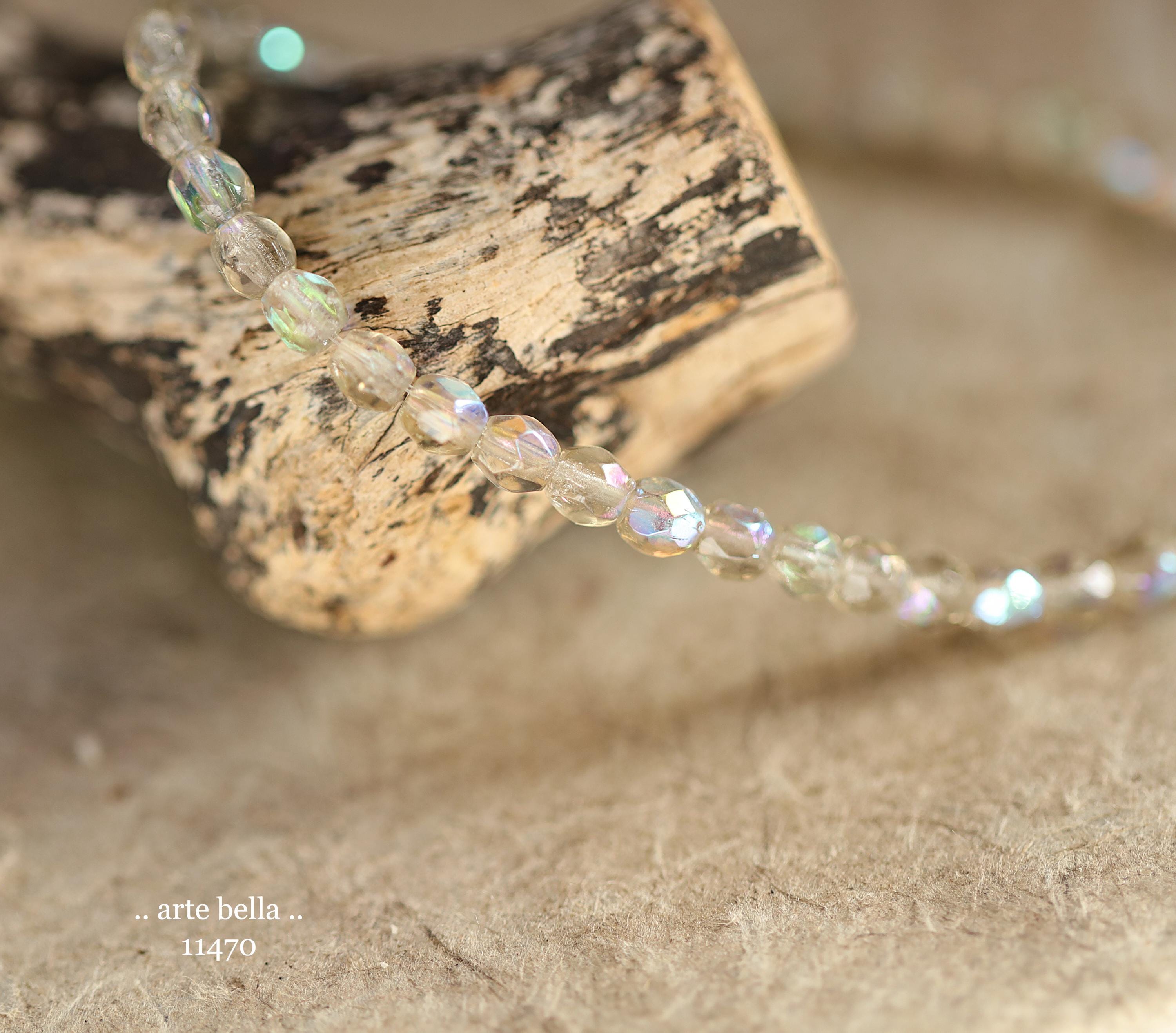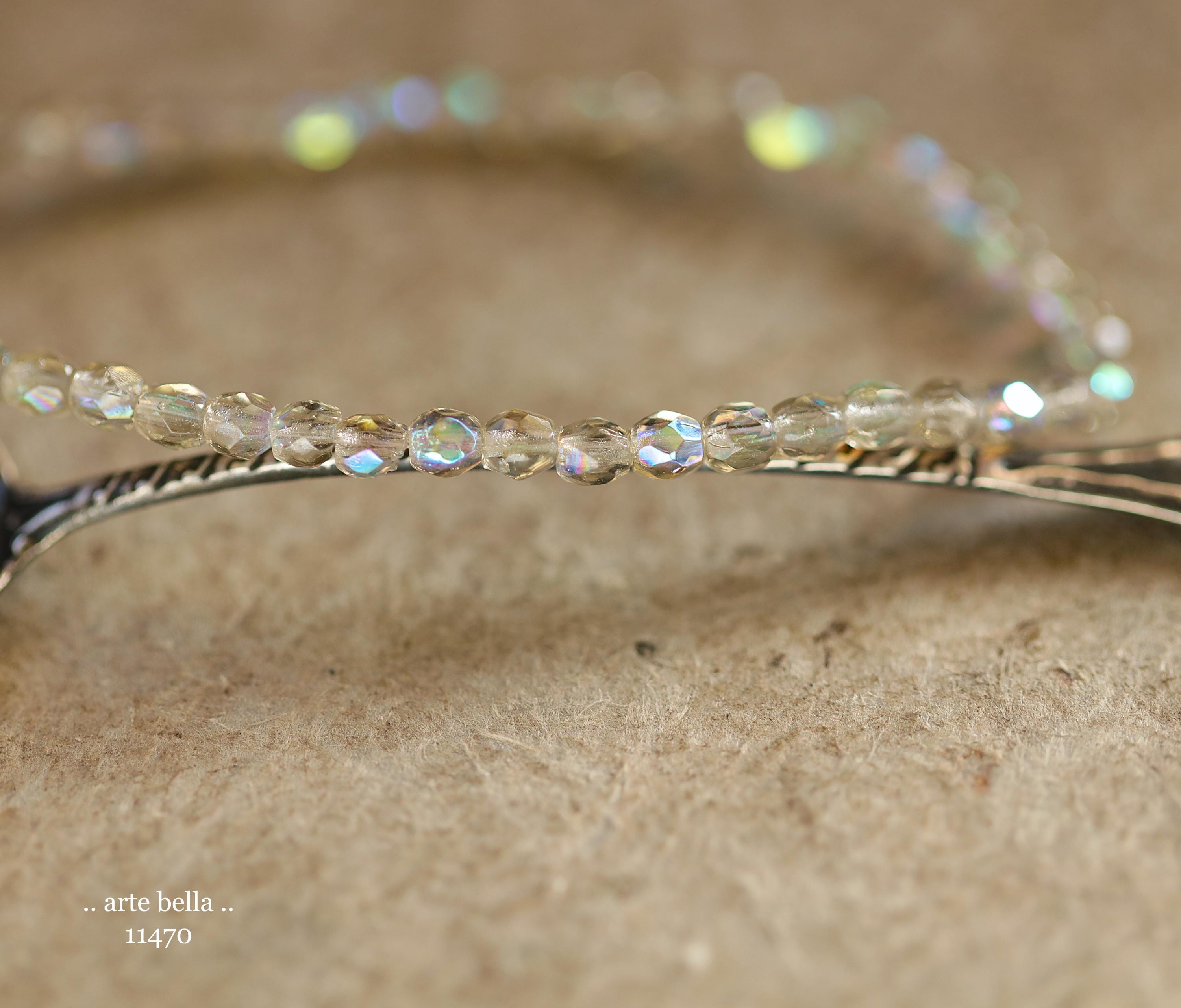 Tiny faceted rounds in light gray glass and a Aurora Borealis rainbow finish.
