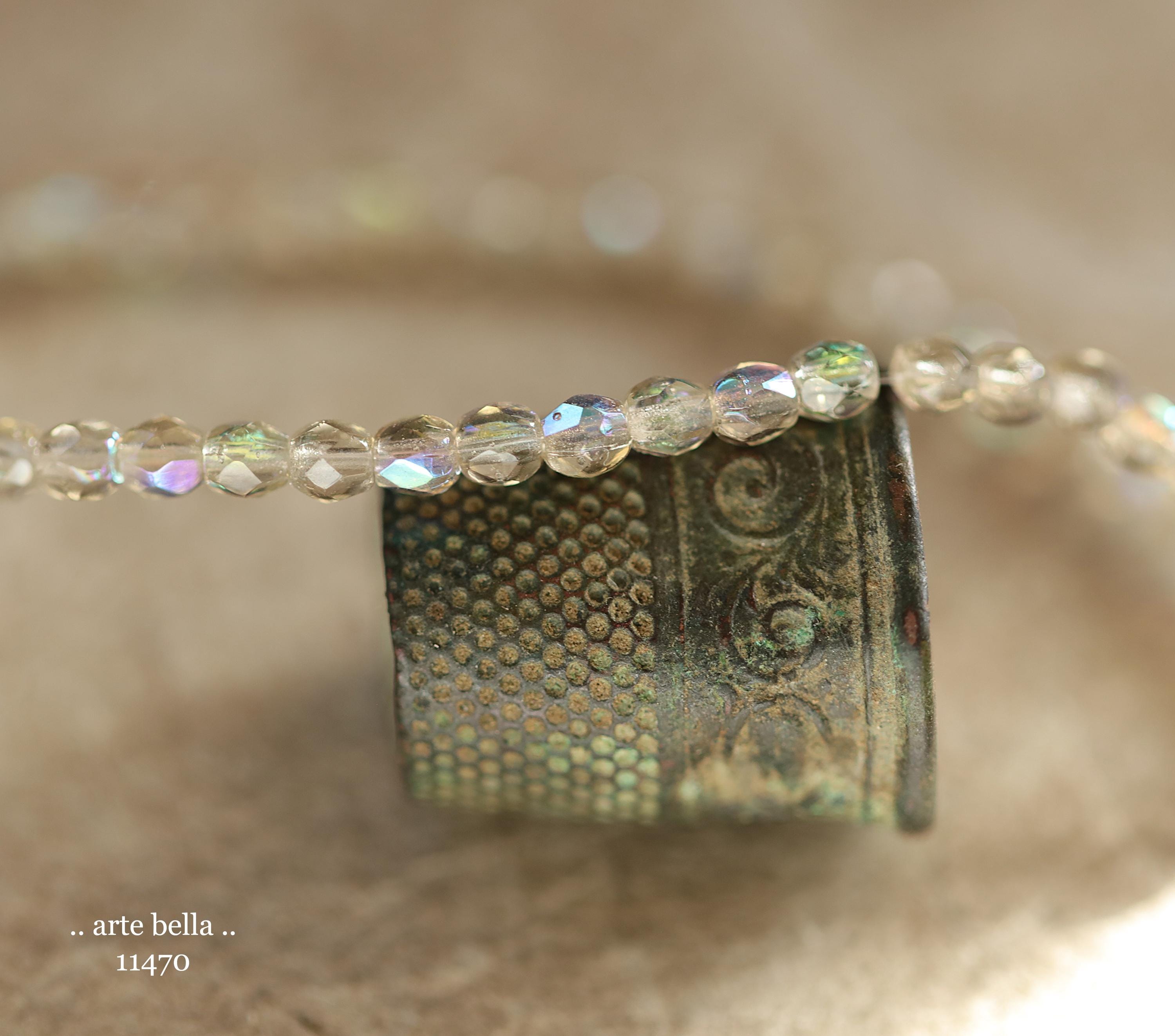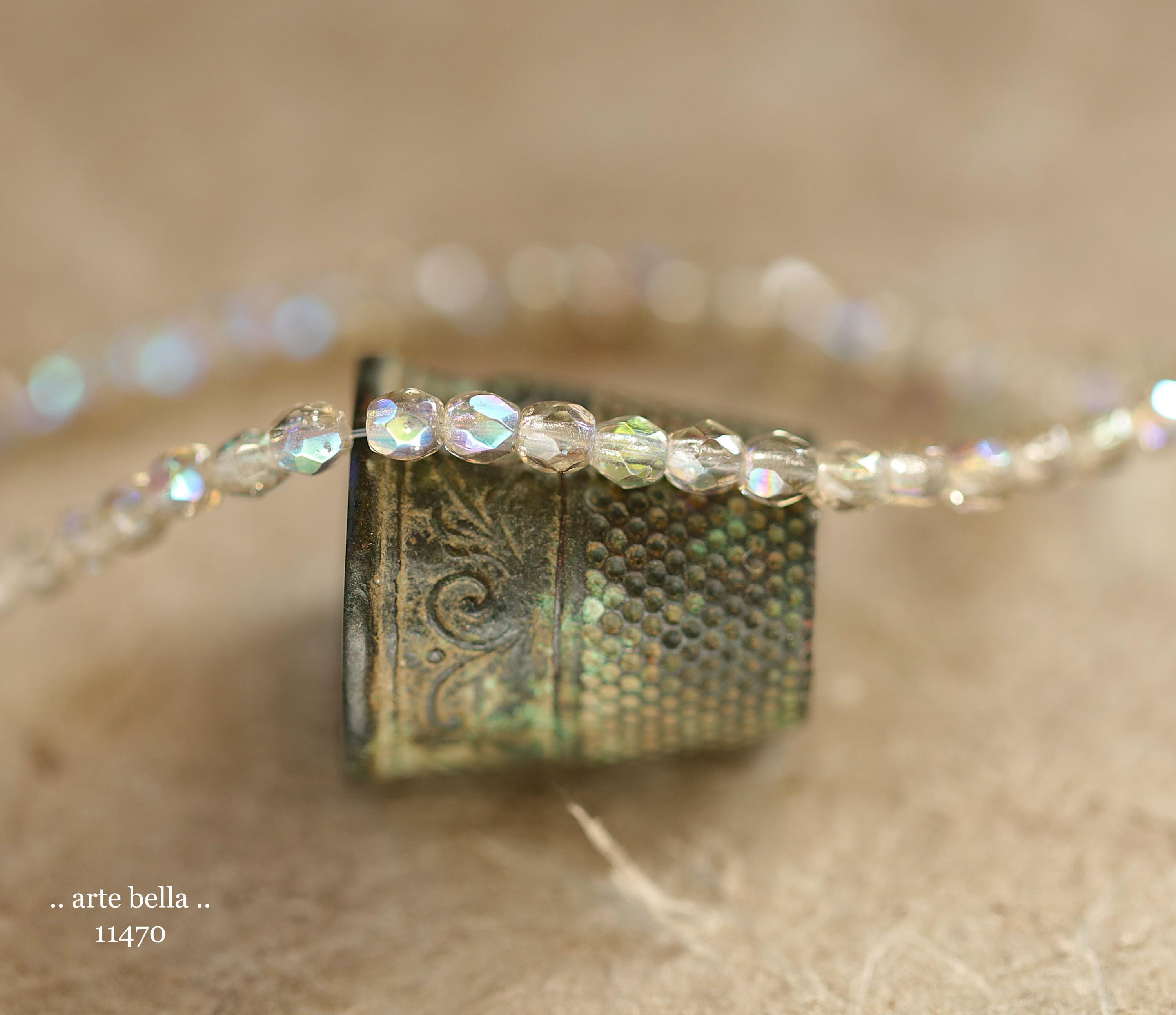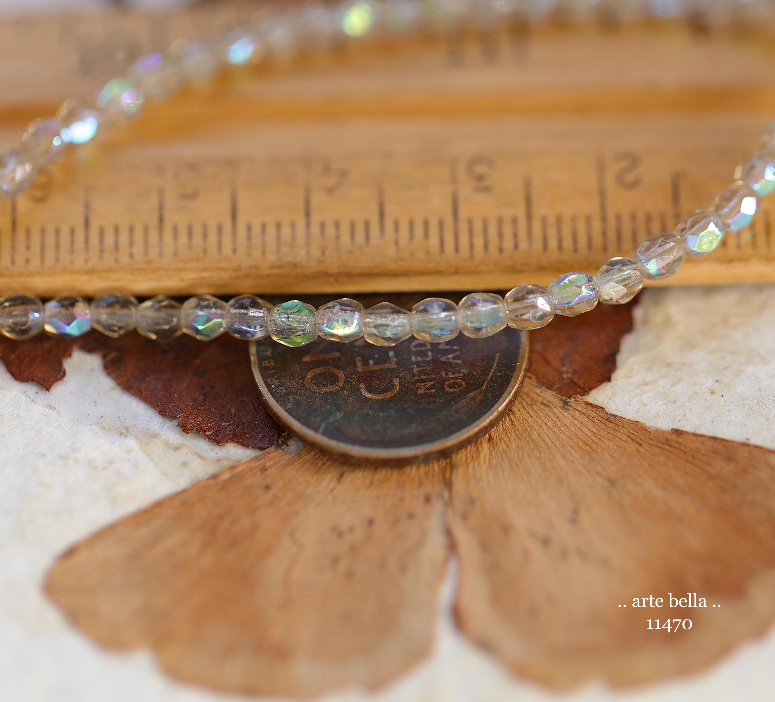 Tiny faceted rounds in light gray glass and a Aurora Borealis rainbow finish.