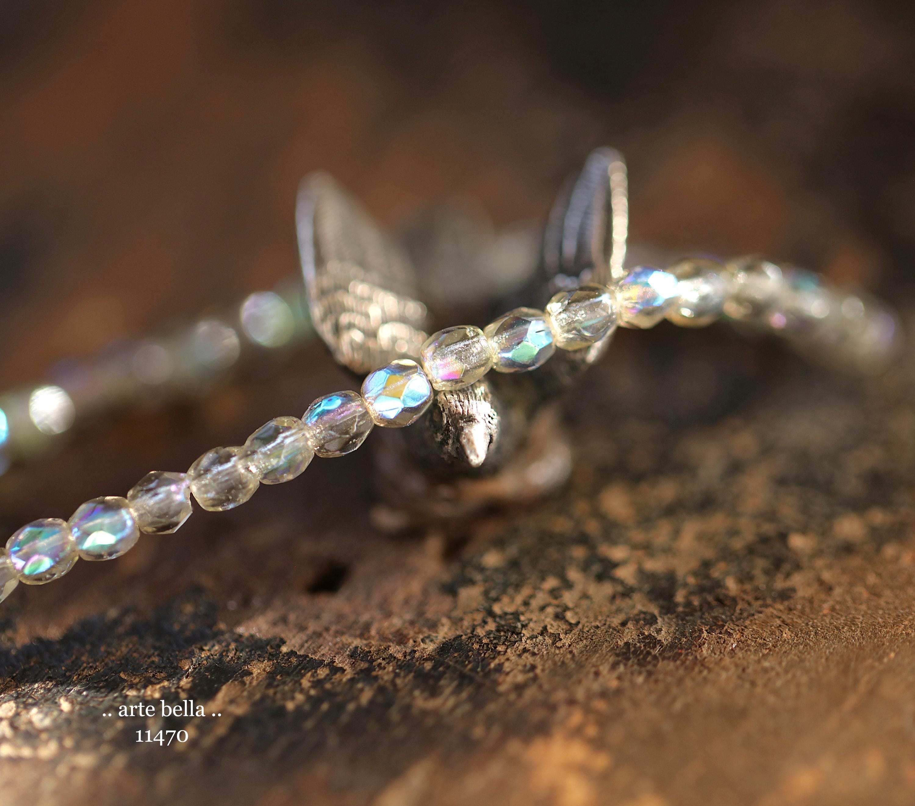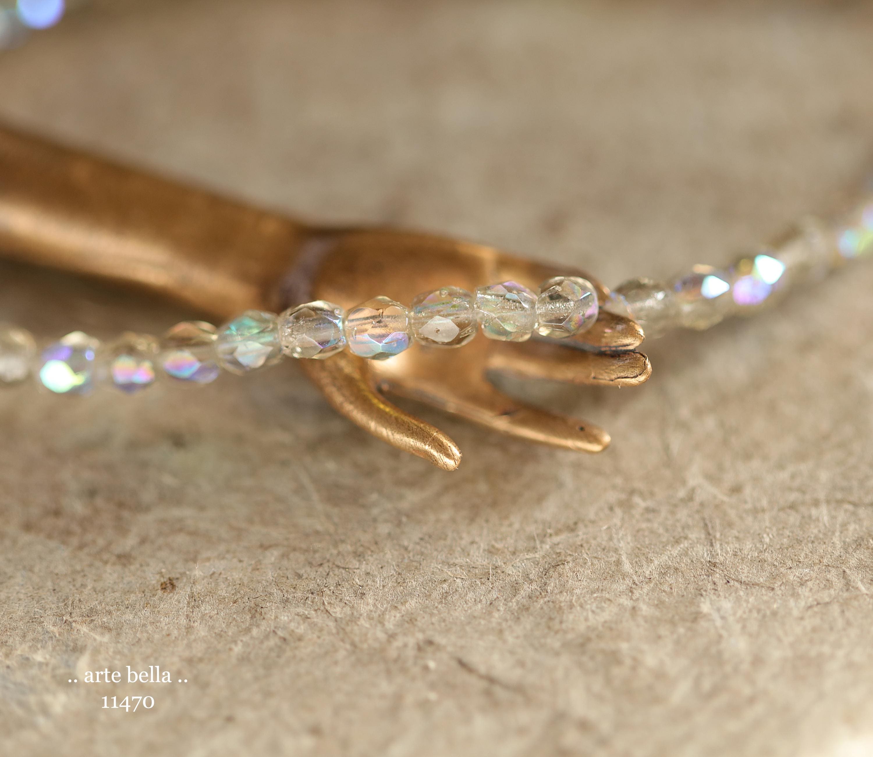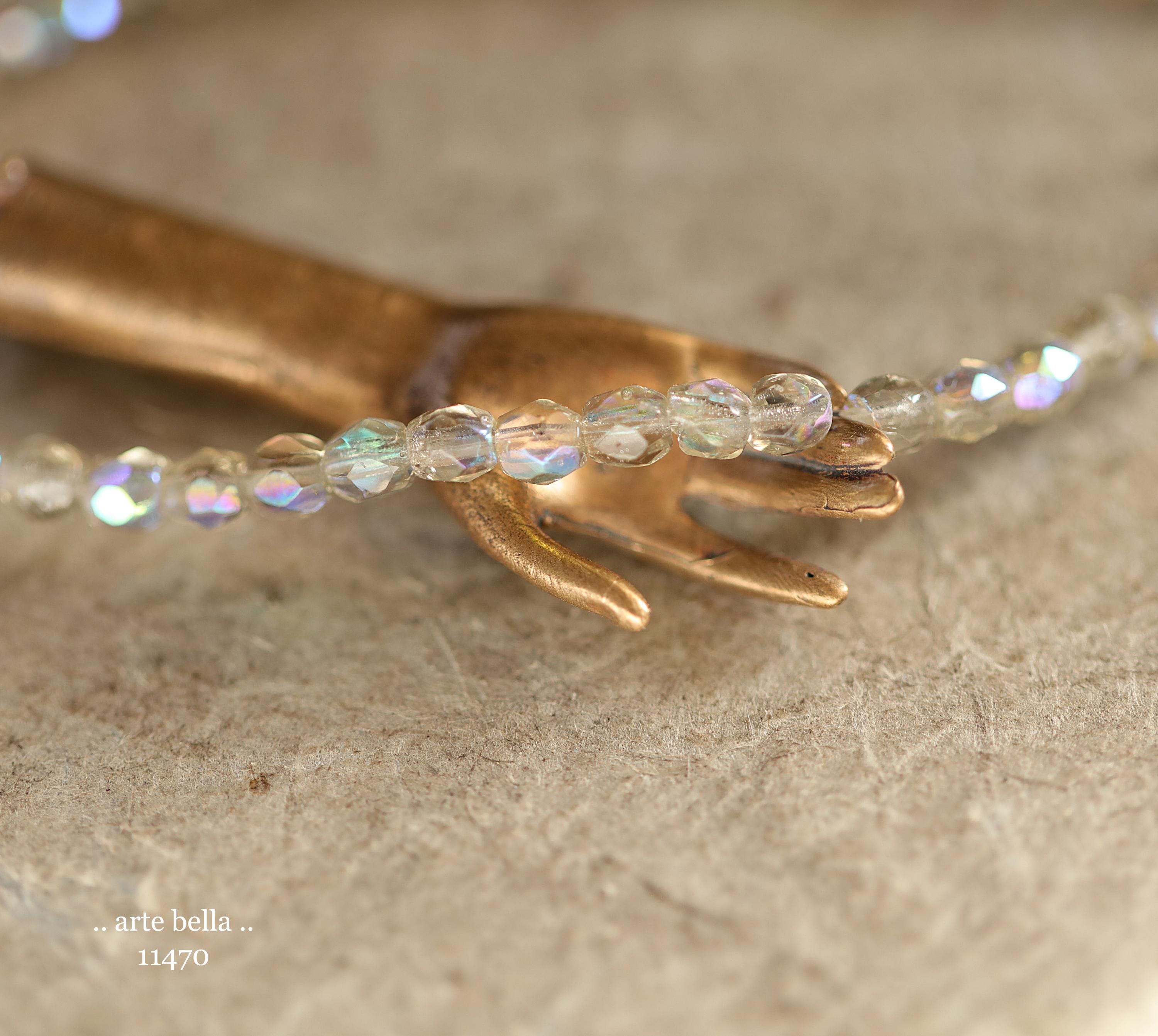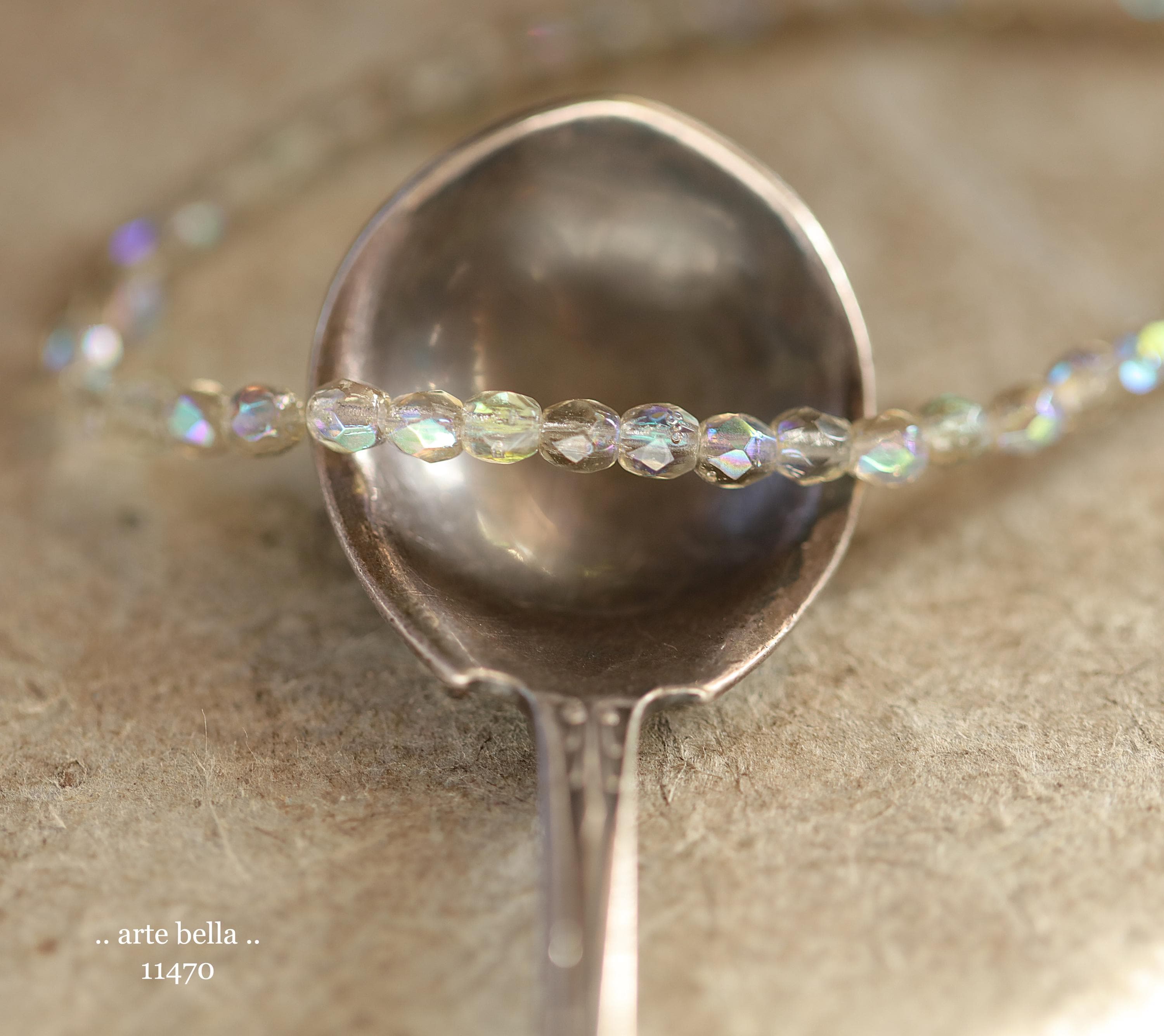 Tiny faceted rounds in light gray glass and a Aurora Borealis rainbow finish.
