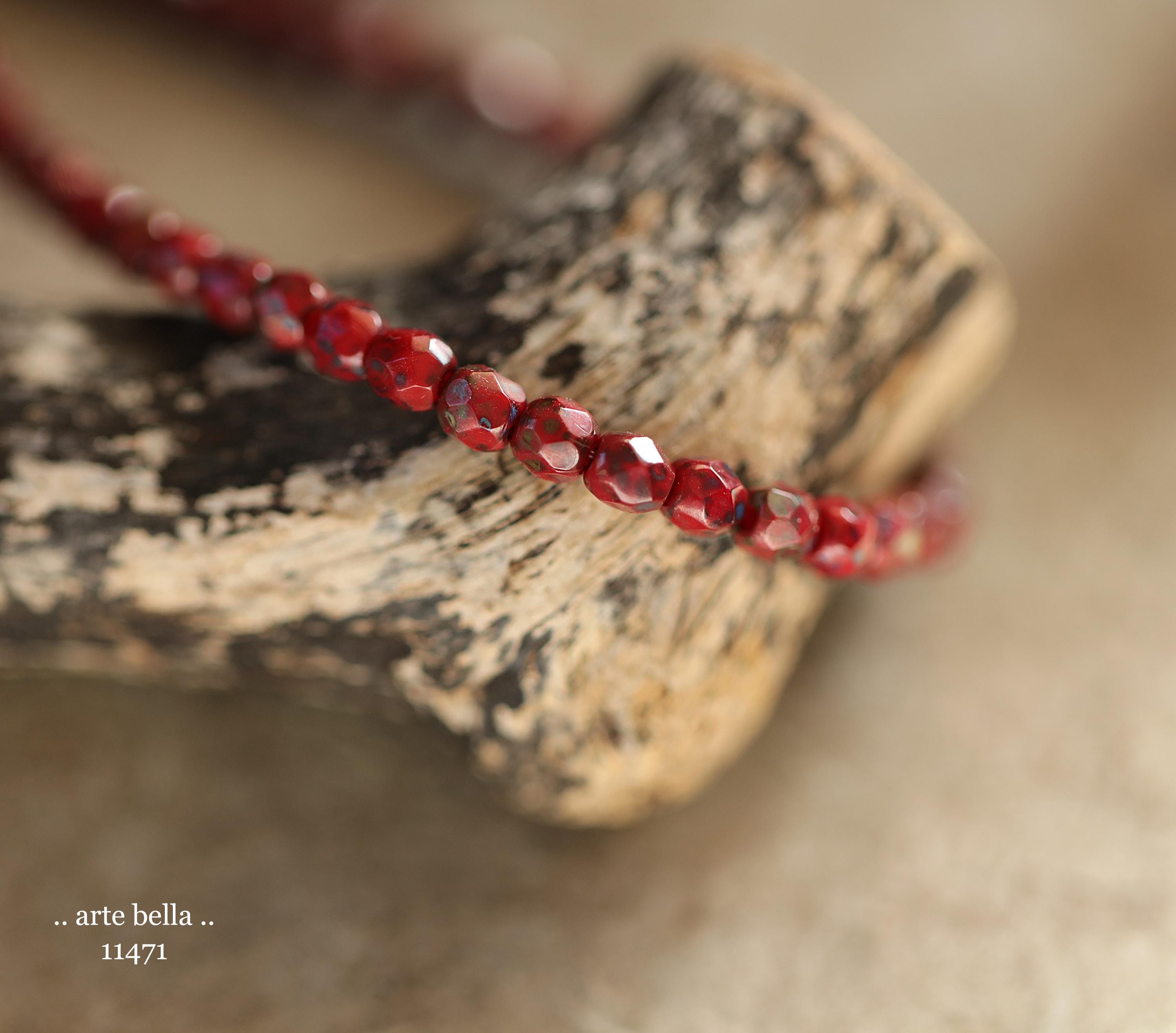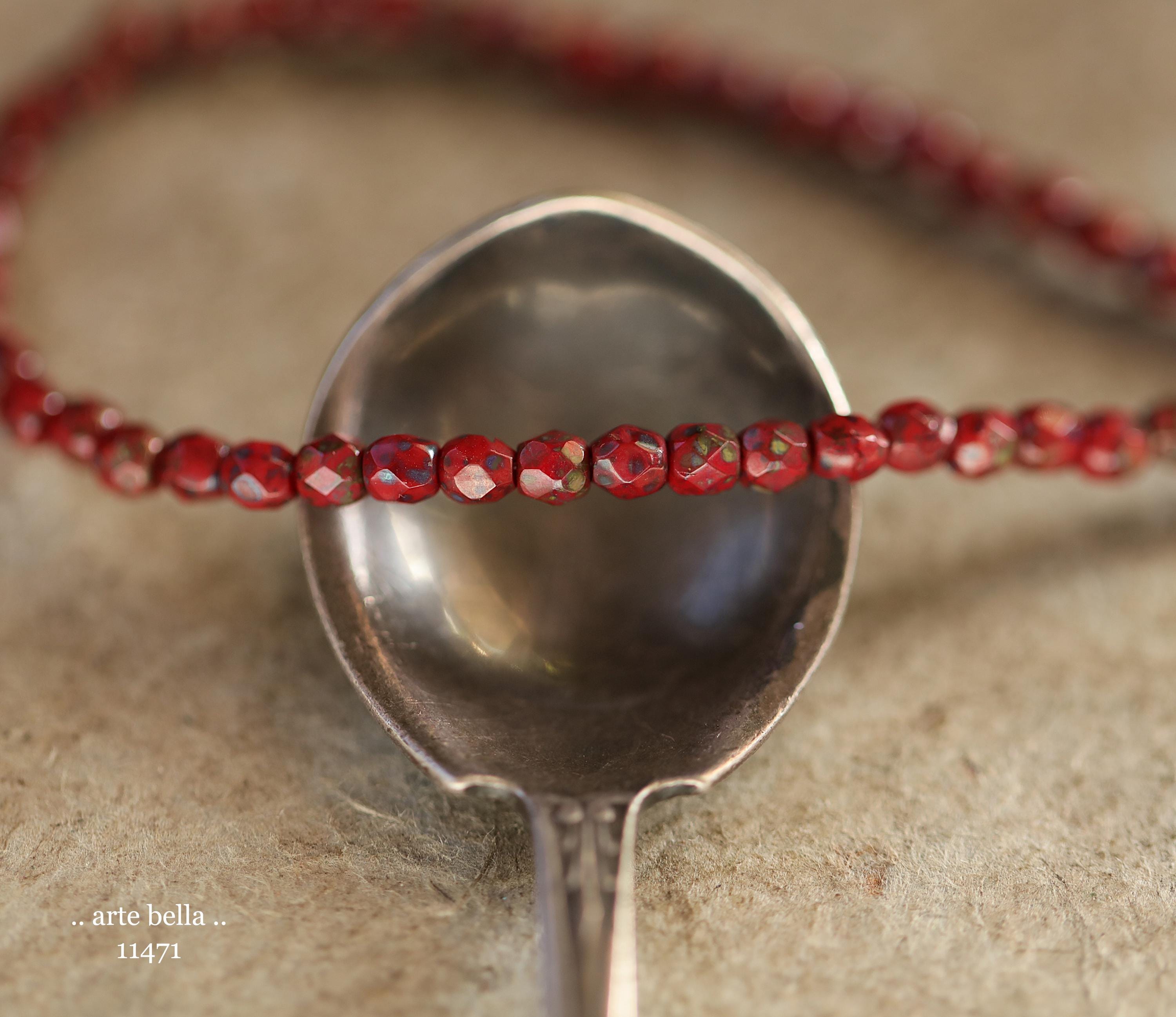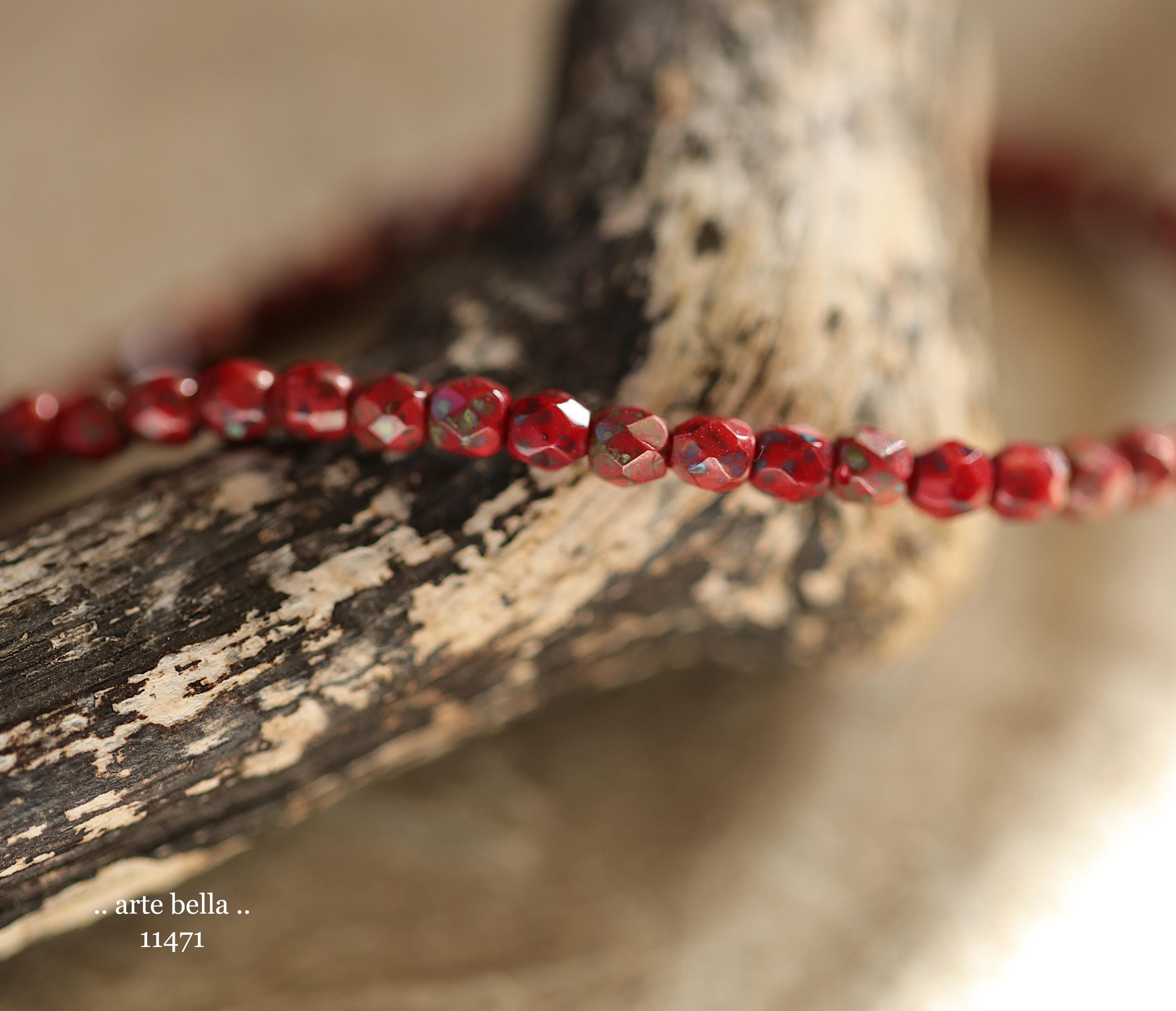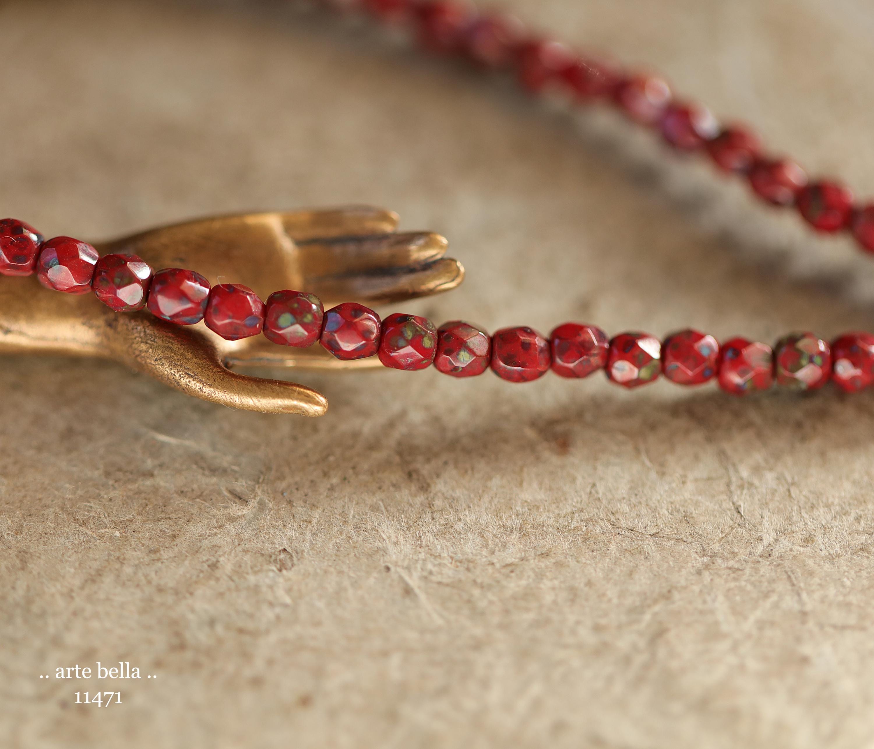 Tiny faceted rounds in opaque red glass with a light coating of Picasso and fire polished finishes.