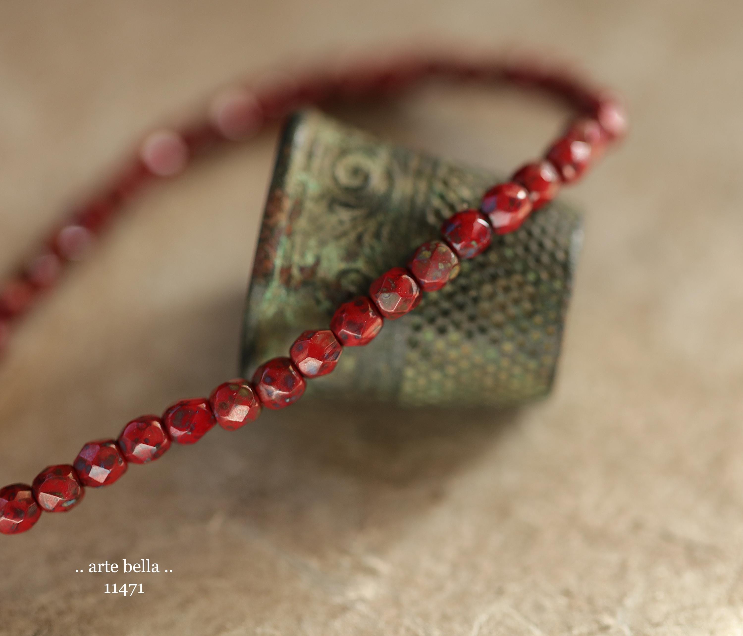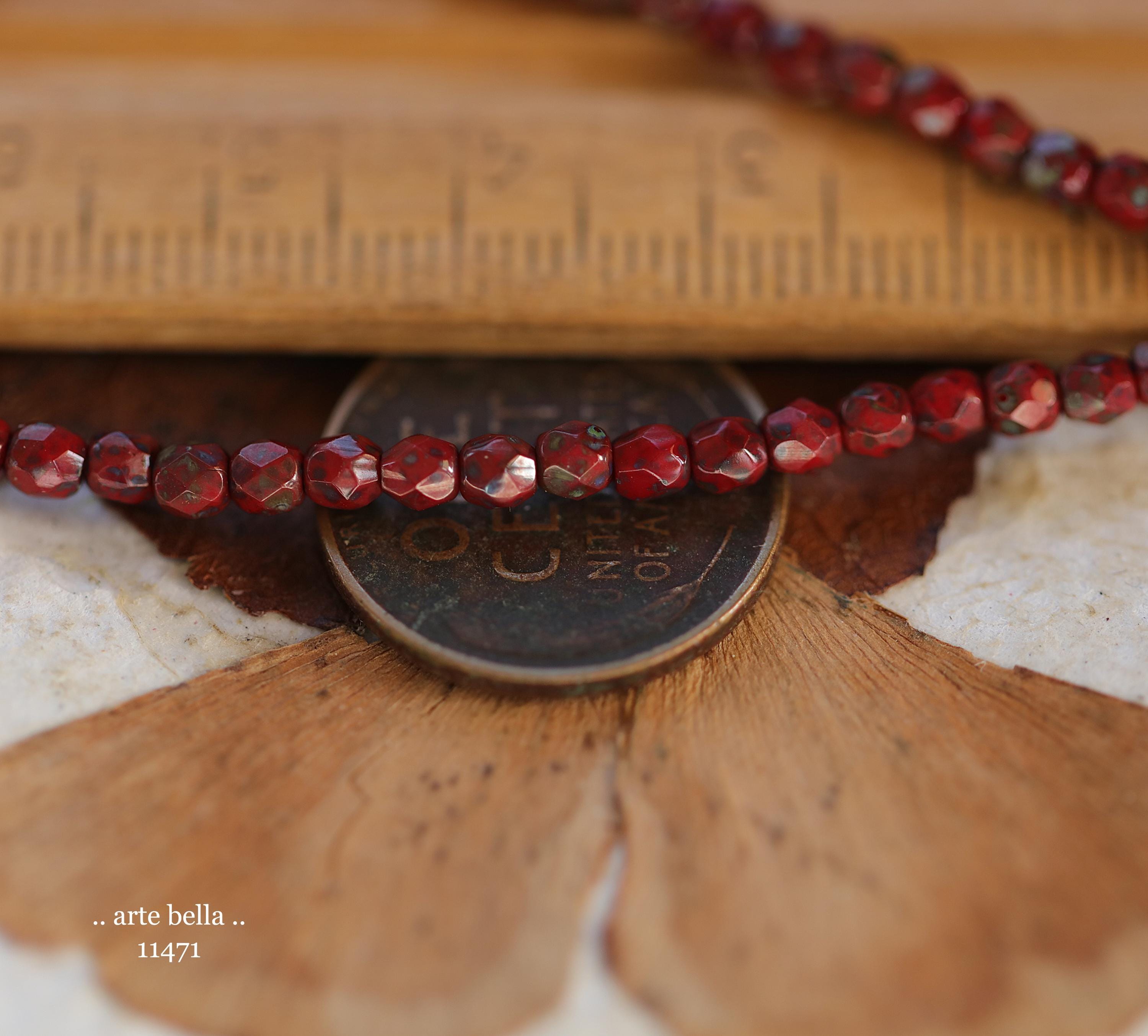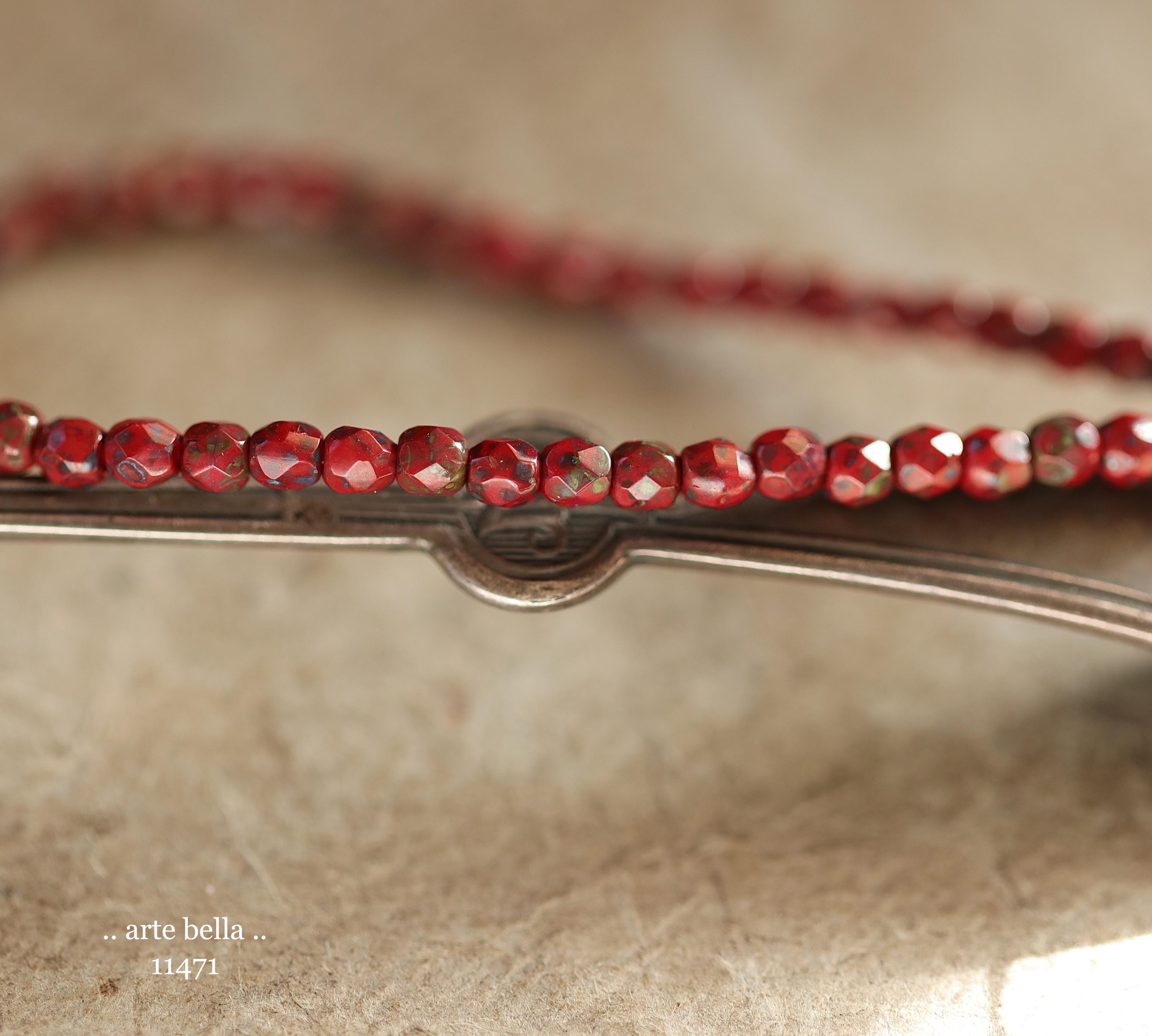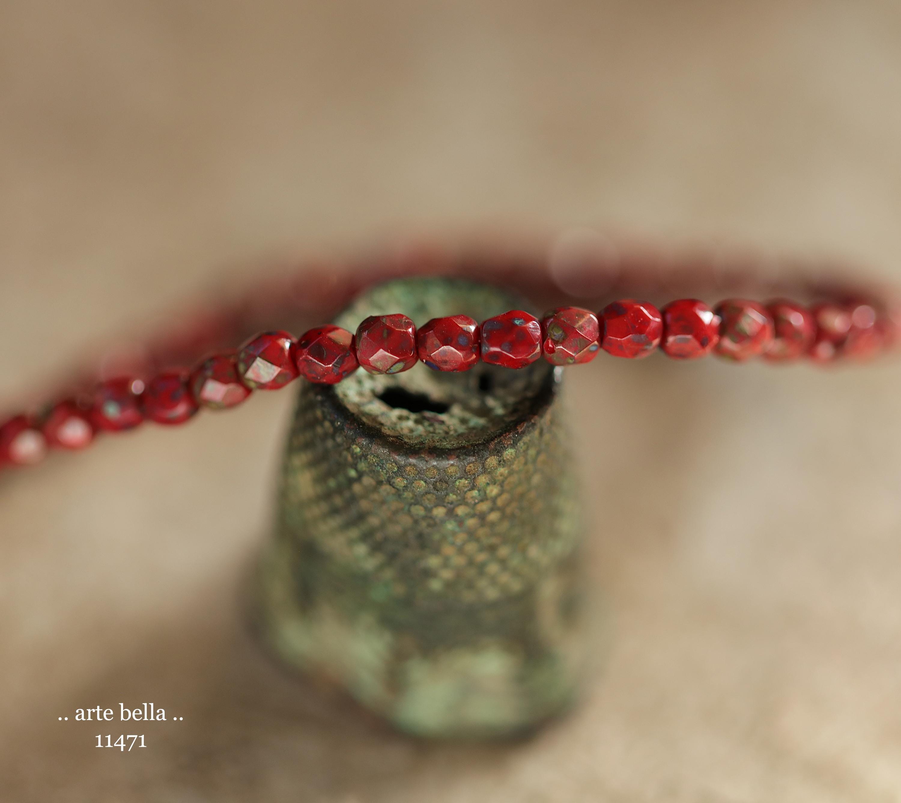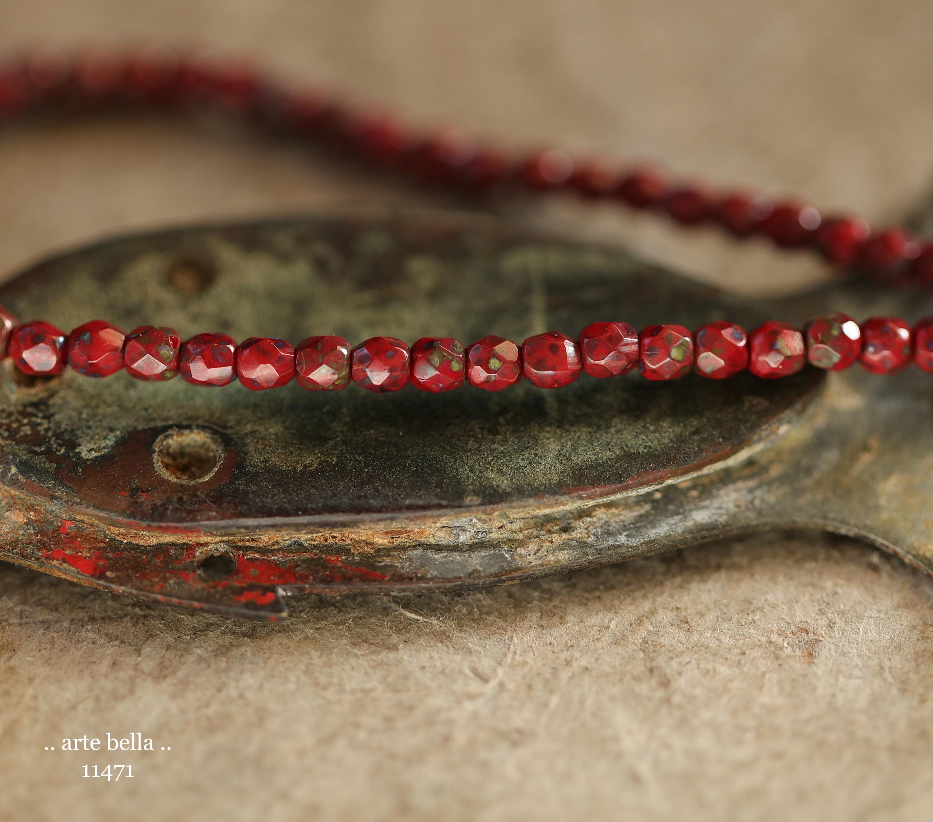 Tiny faceted rounds in opaque red glass with a light coating of Picasso and fire polished finishes.