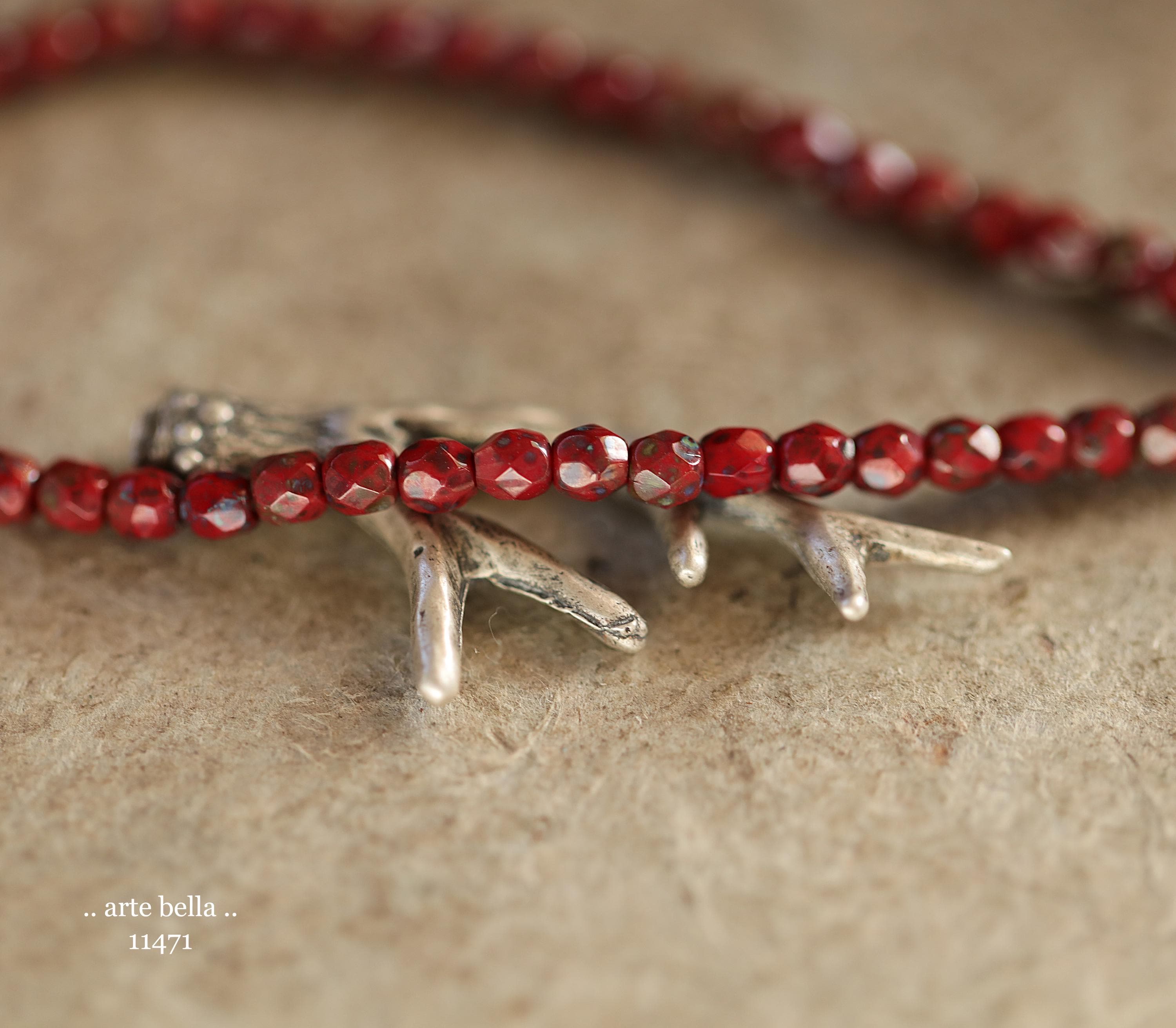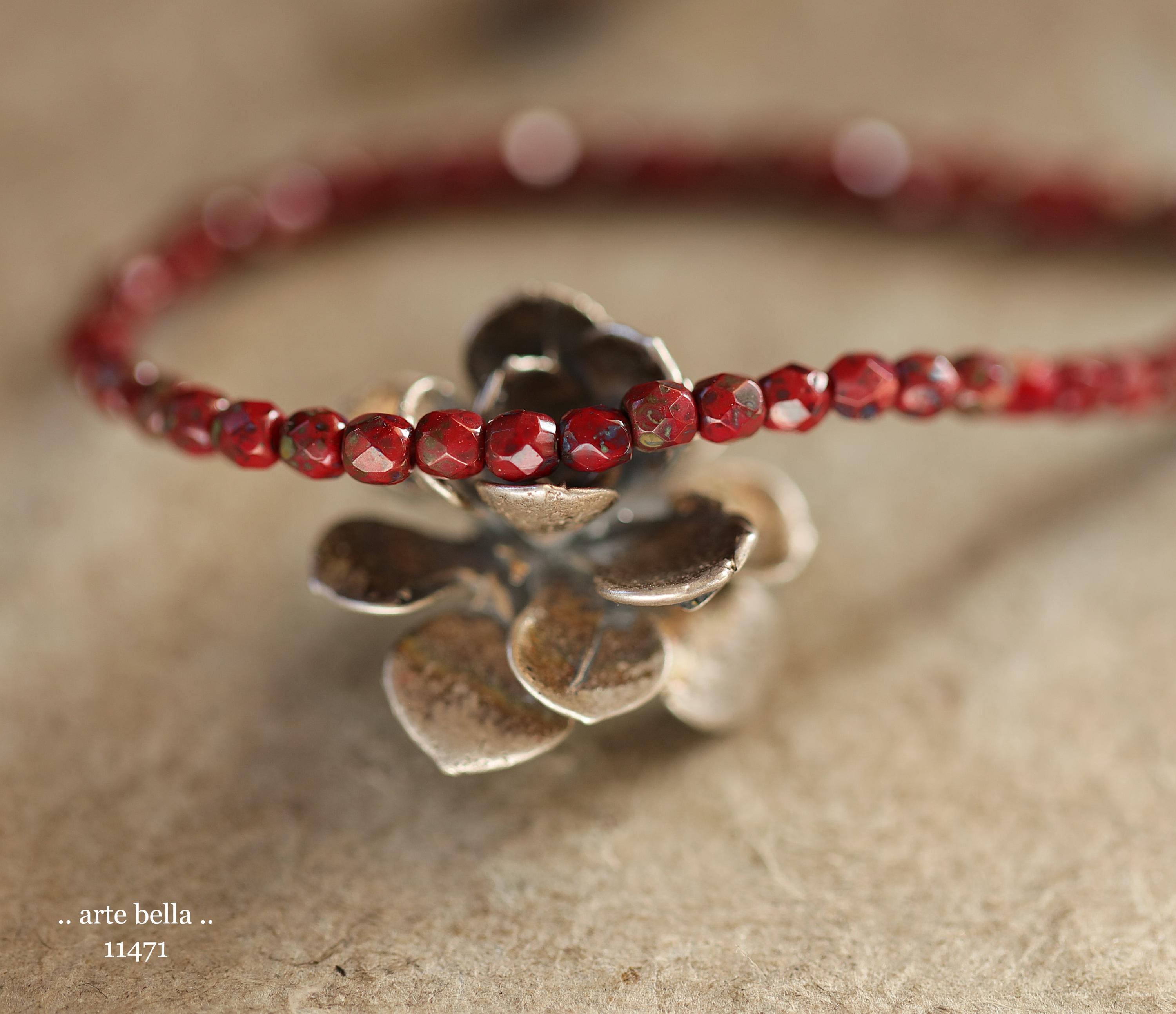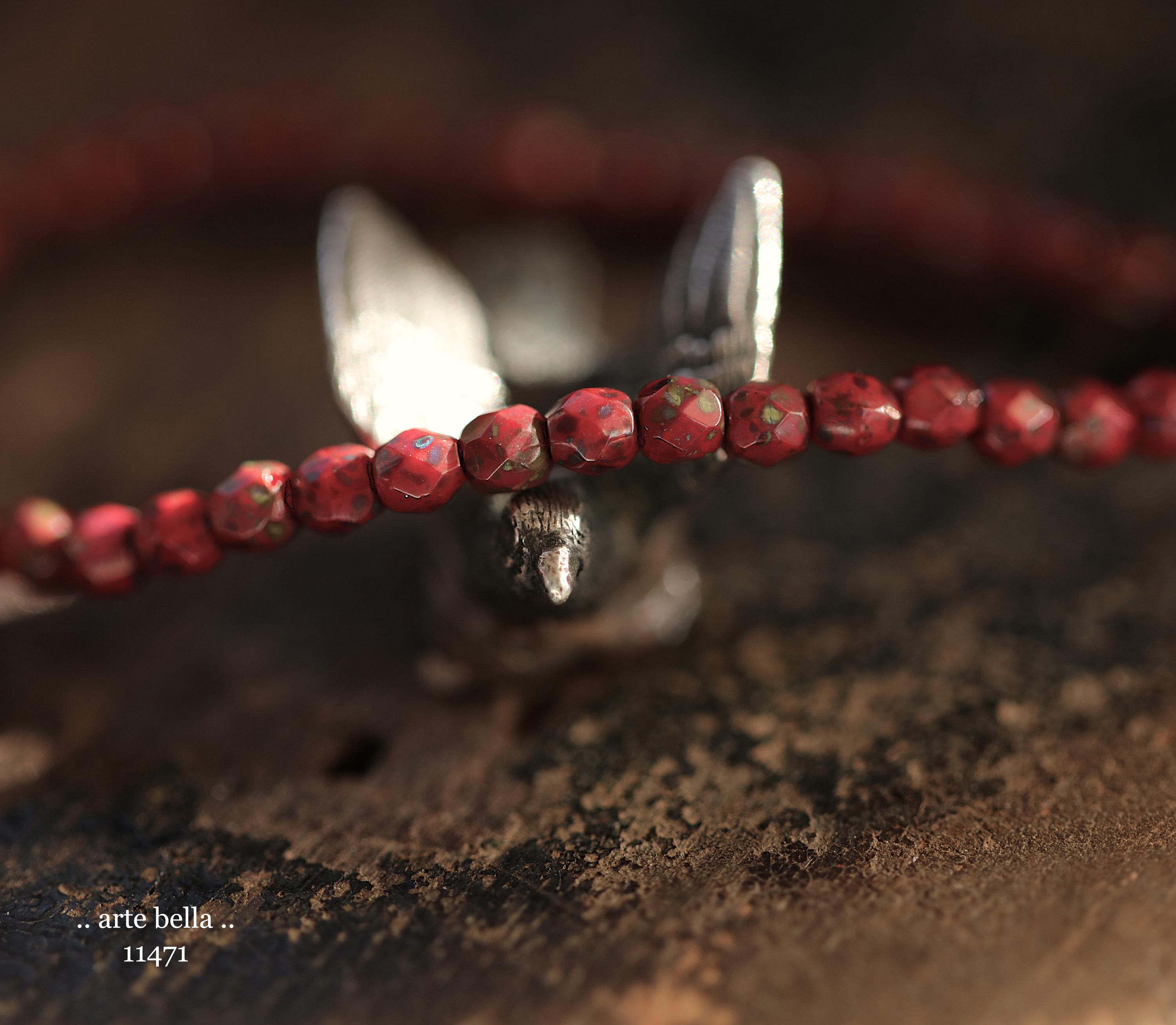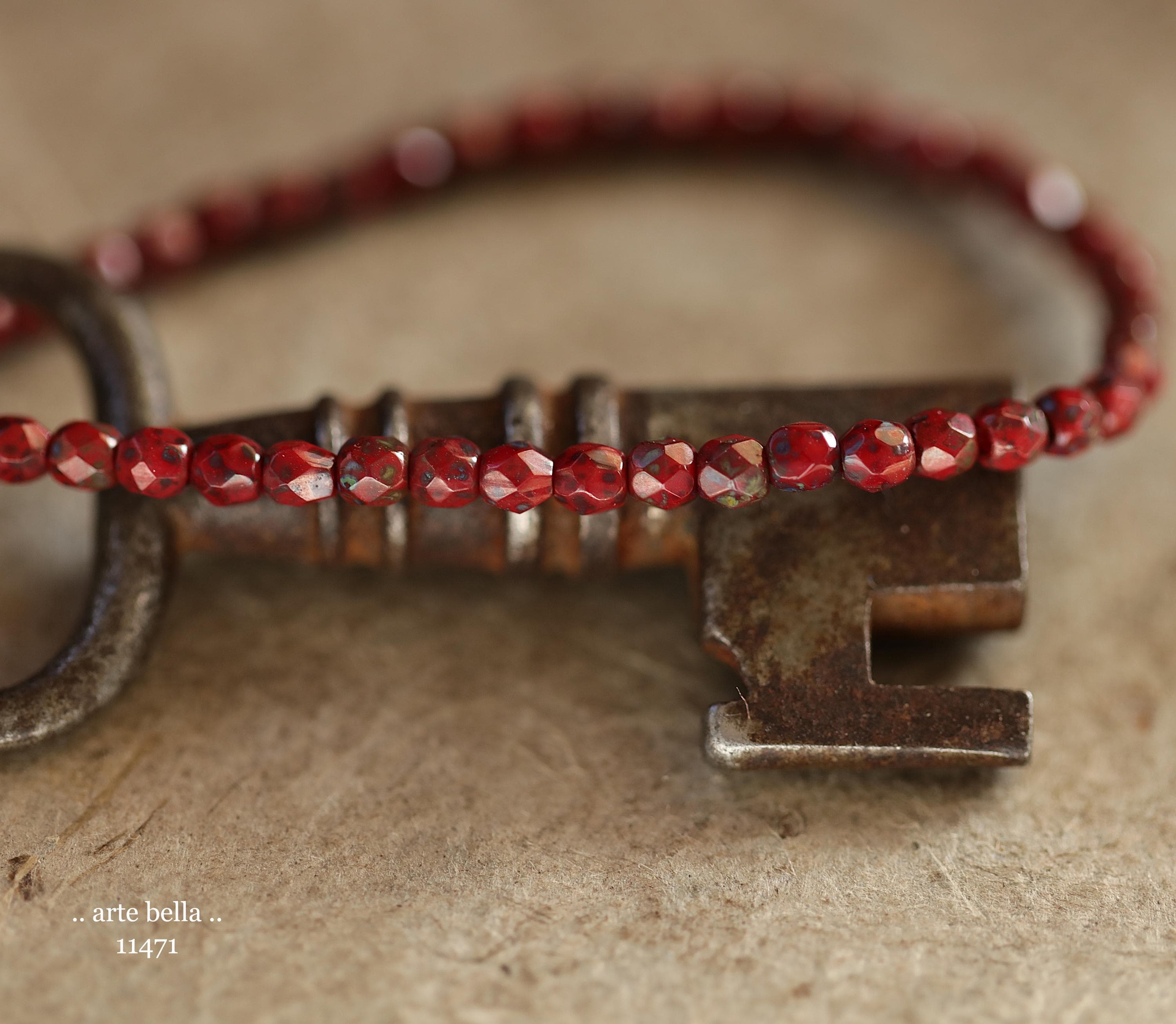 Tiny faceted rounds in opaque red glass with a light coating of Picasso and fire polished finishes.