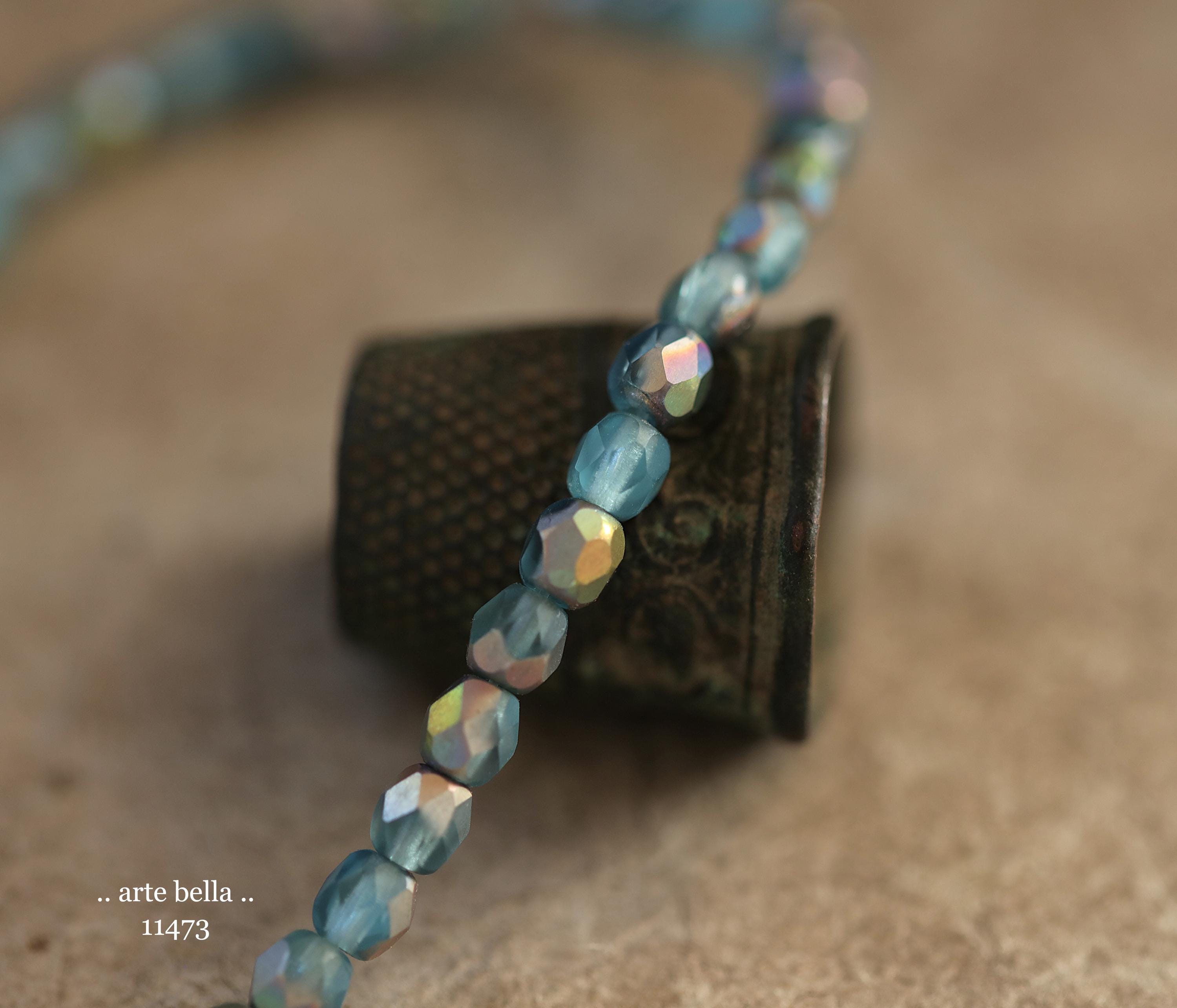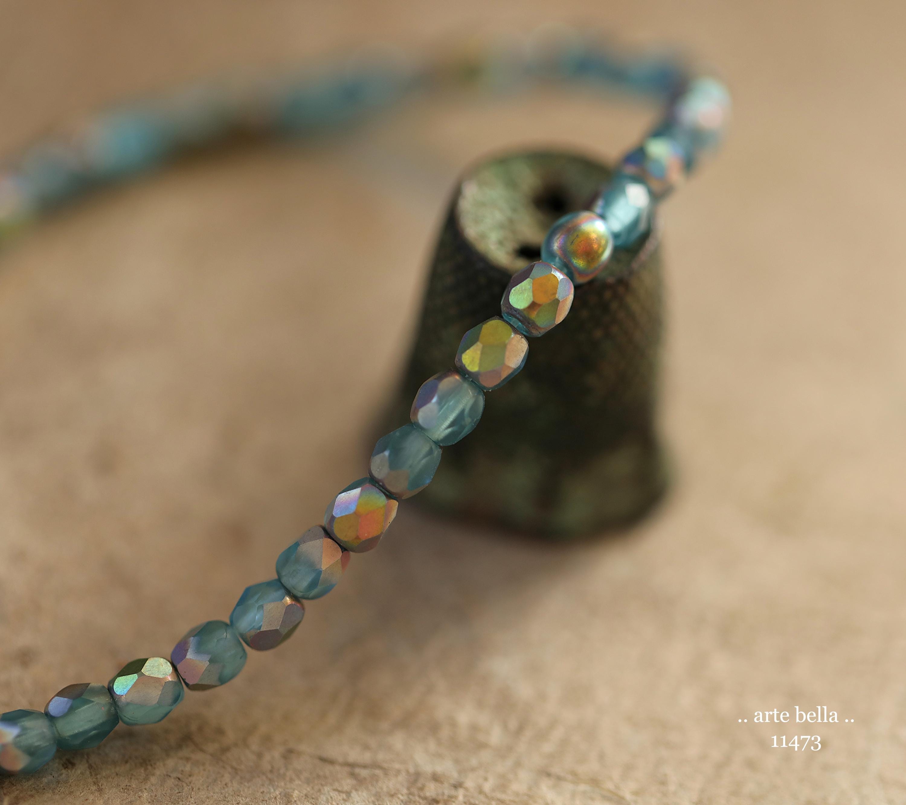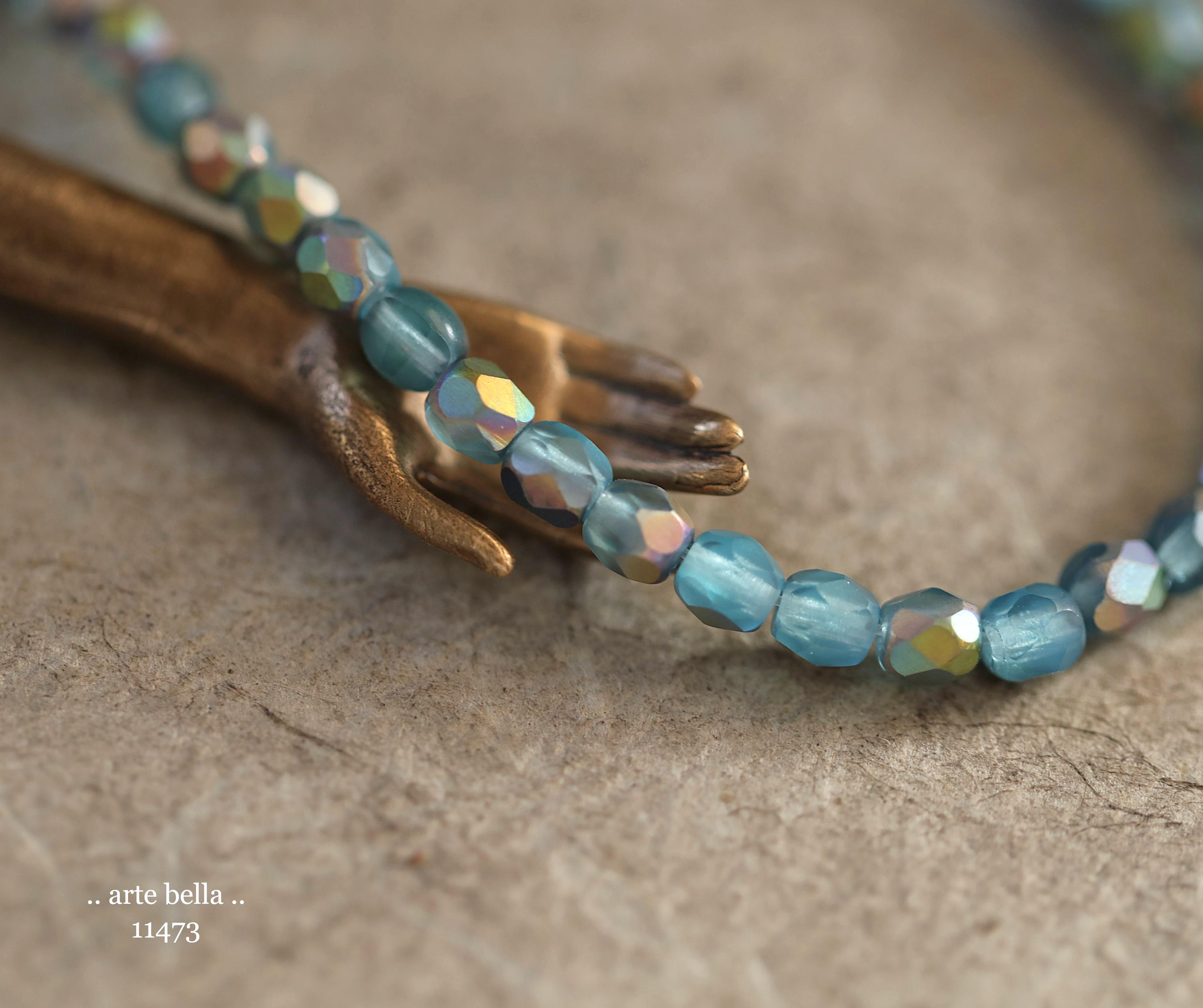Petite faceted rounds in matte Pacific blue glass and a mystic rainbow Aurora Borealis finish.