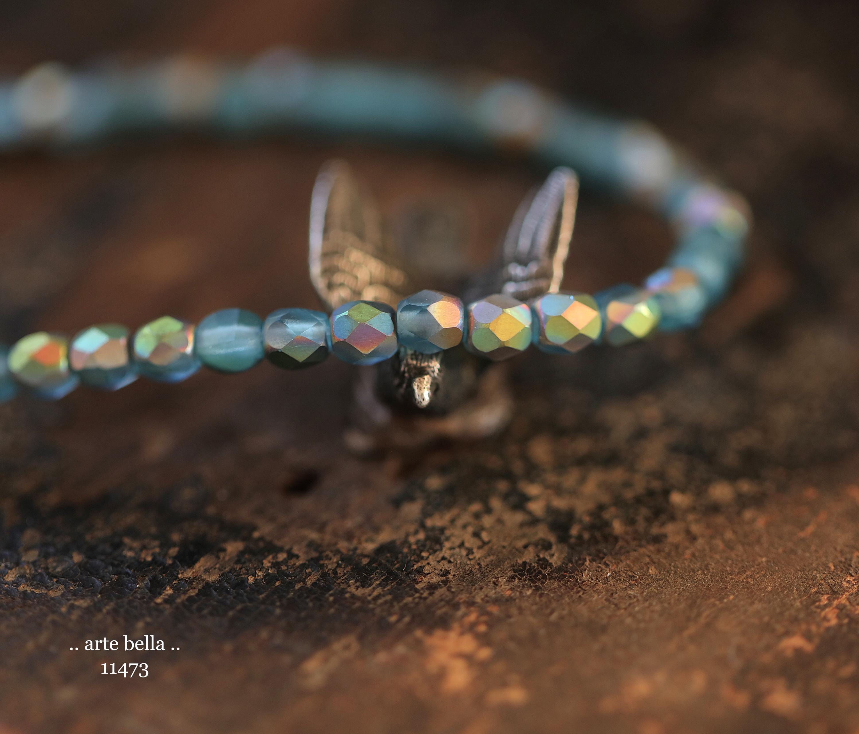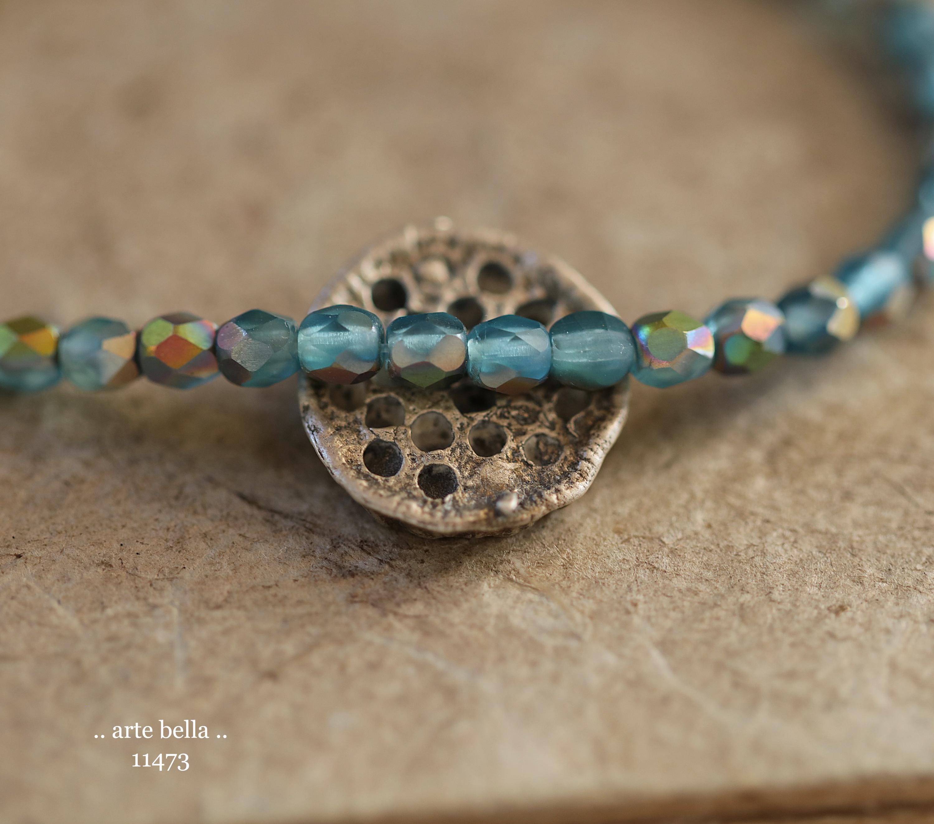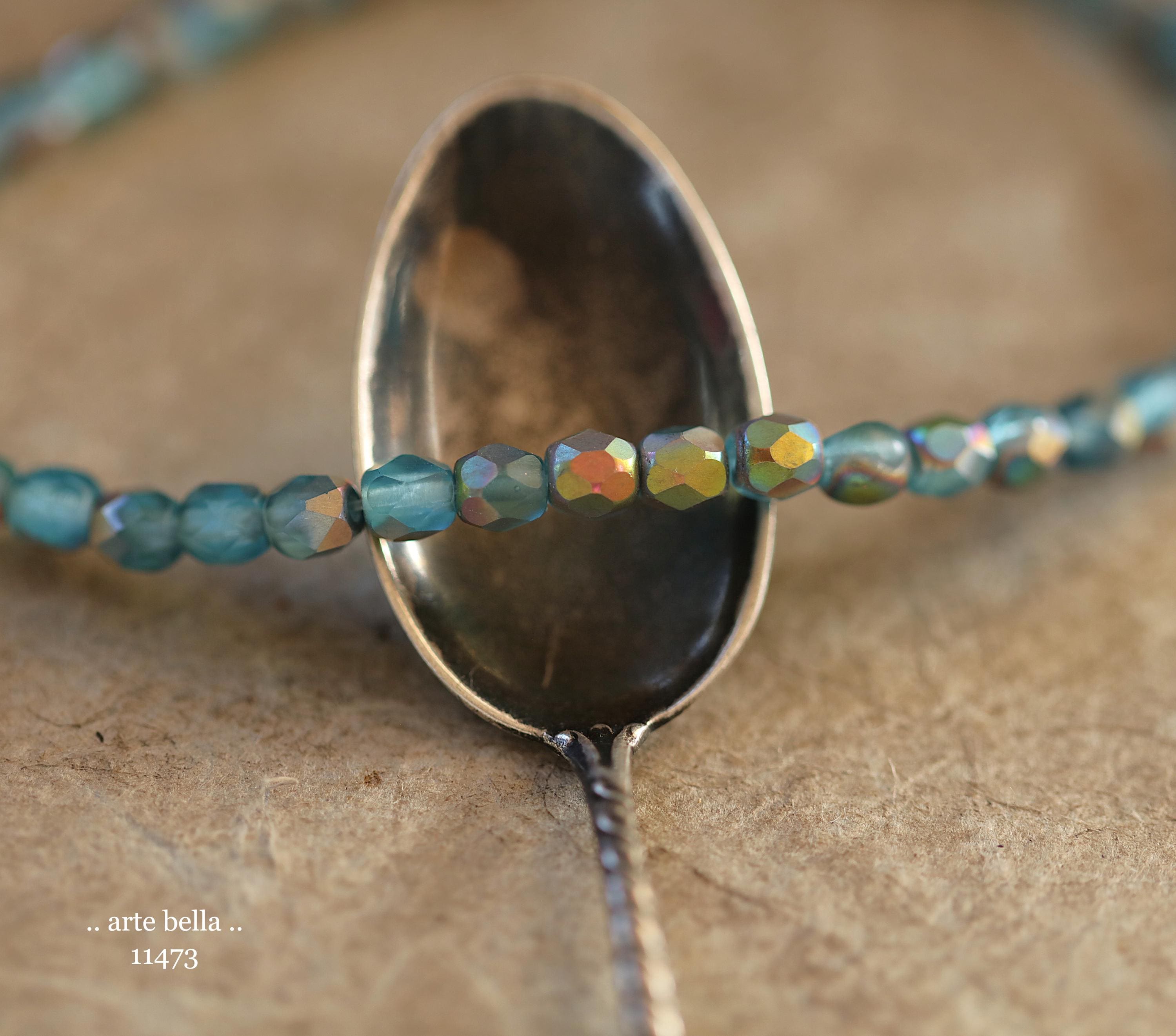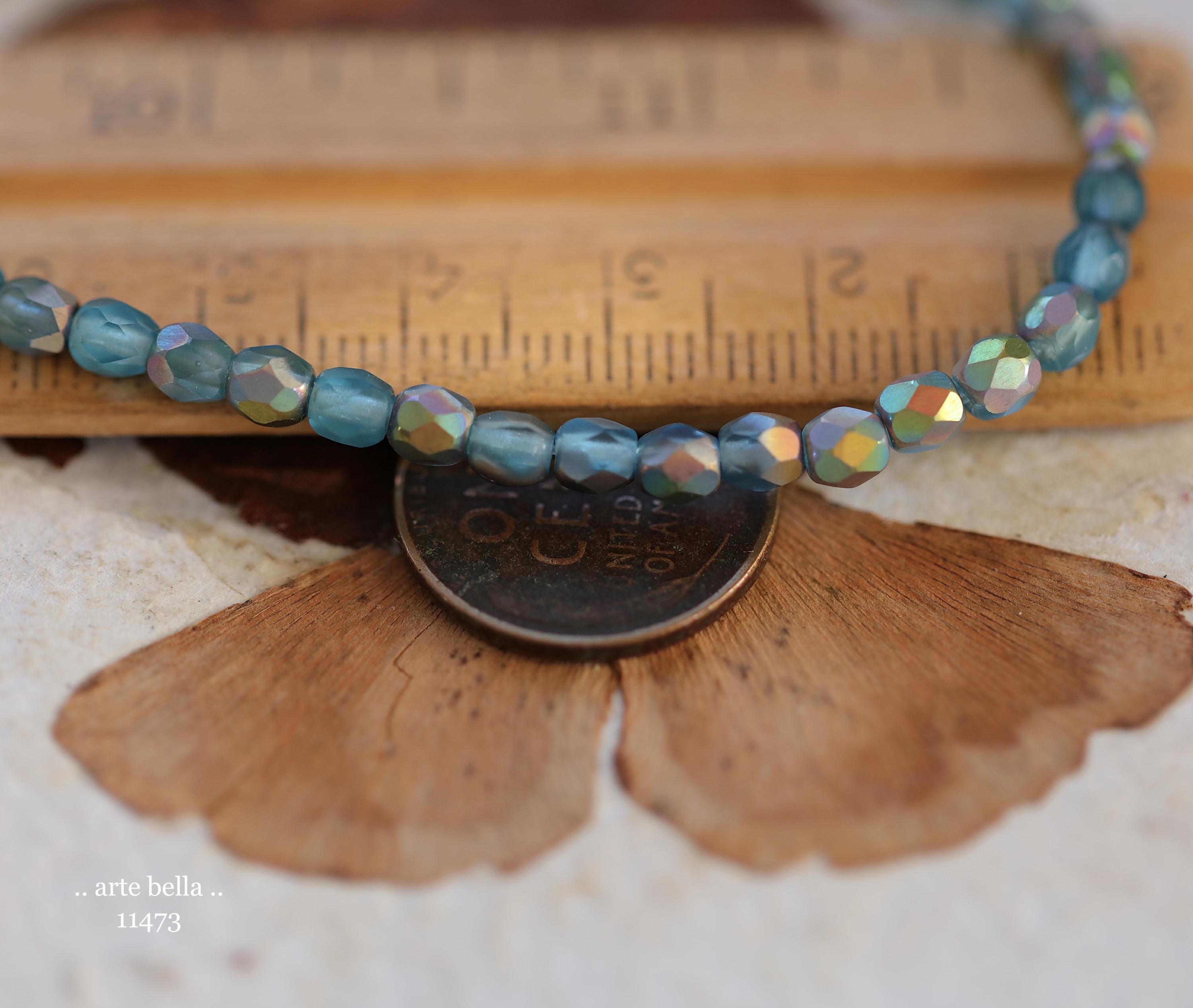 Petite faceted rounds in matte Pacific blue glass and a mystic rainbow Aurora Borealis finish.