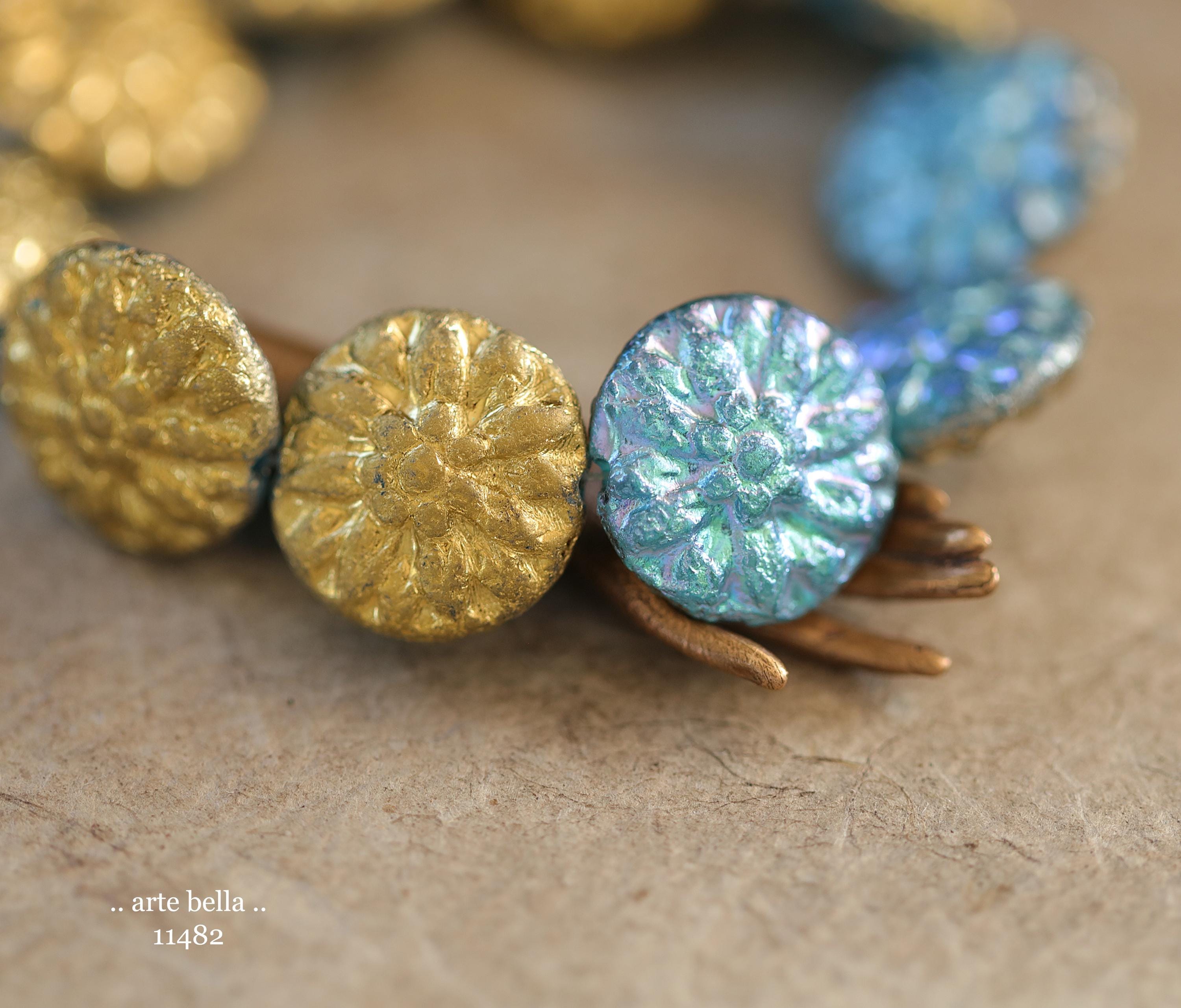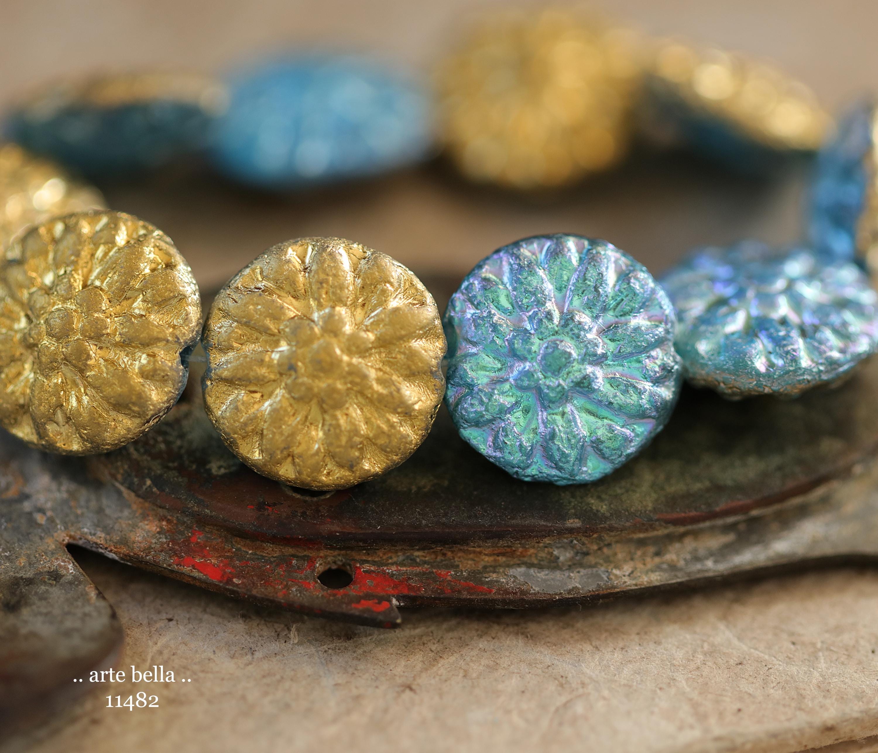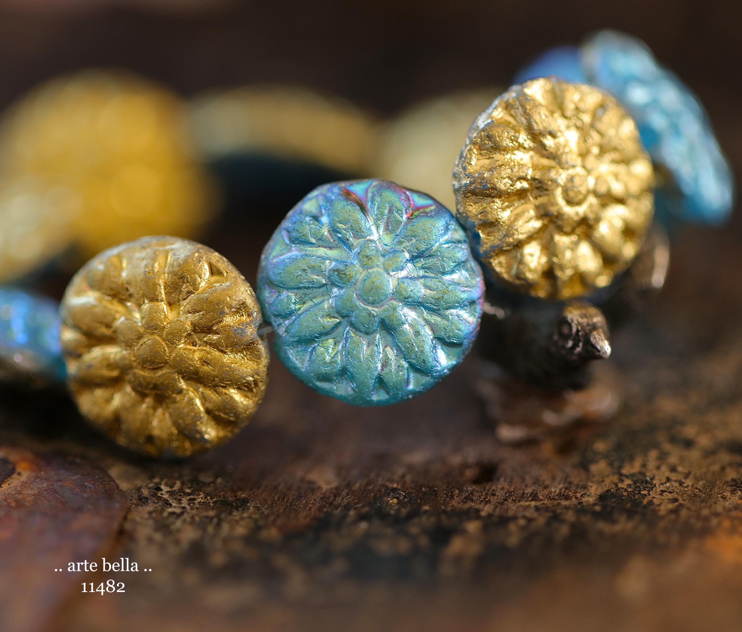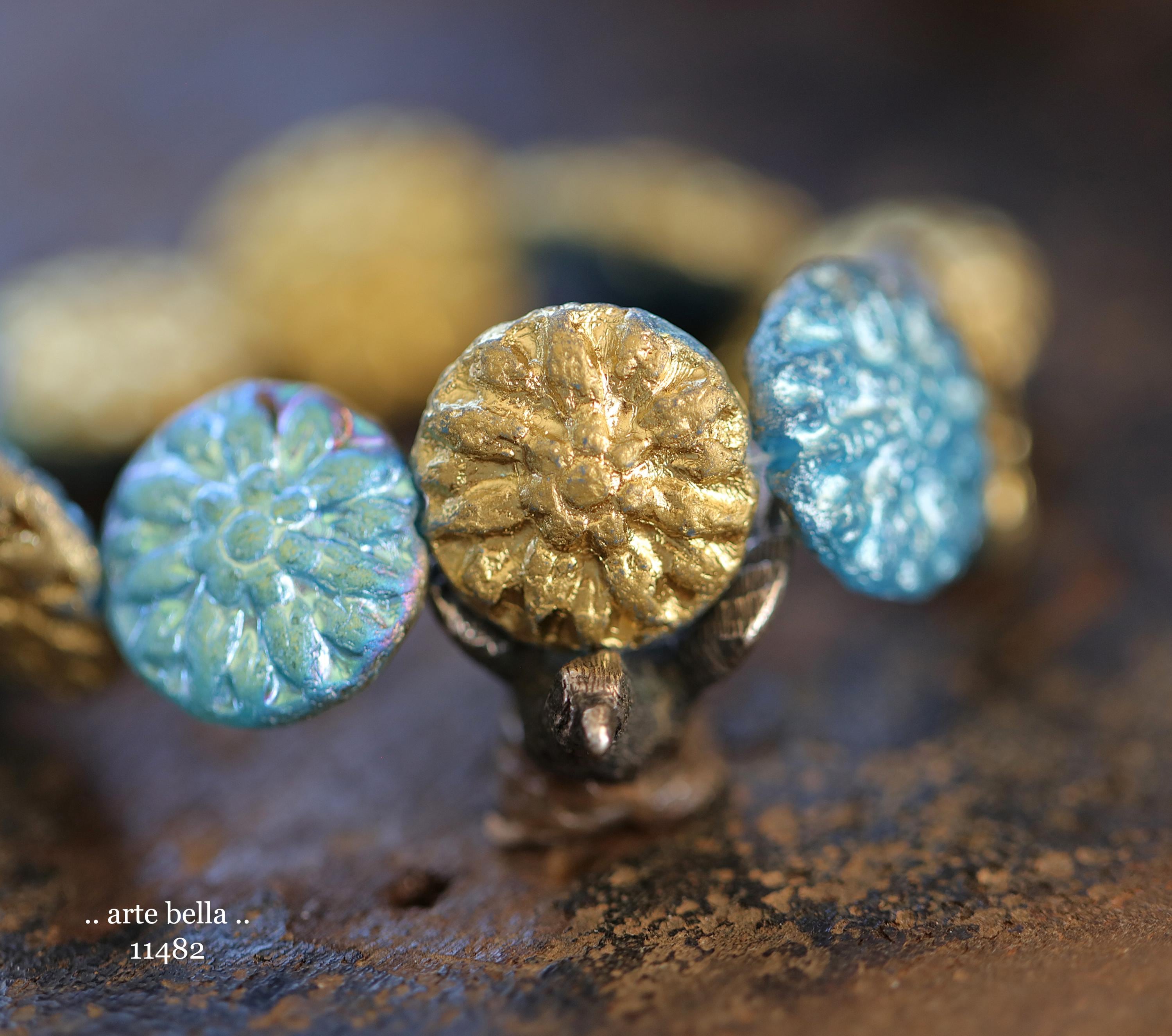 New .. GOLDEN SKY DAHLIAS .. 10 Premium Etched Czech Glass Dahlia Flower Beads 14mm (11482-st) .. jewelry supplies