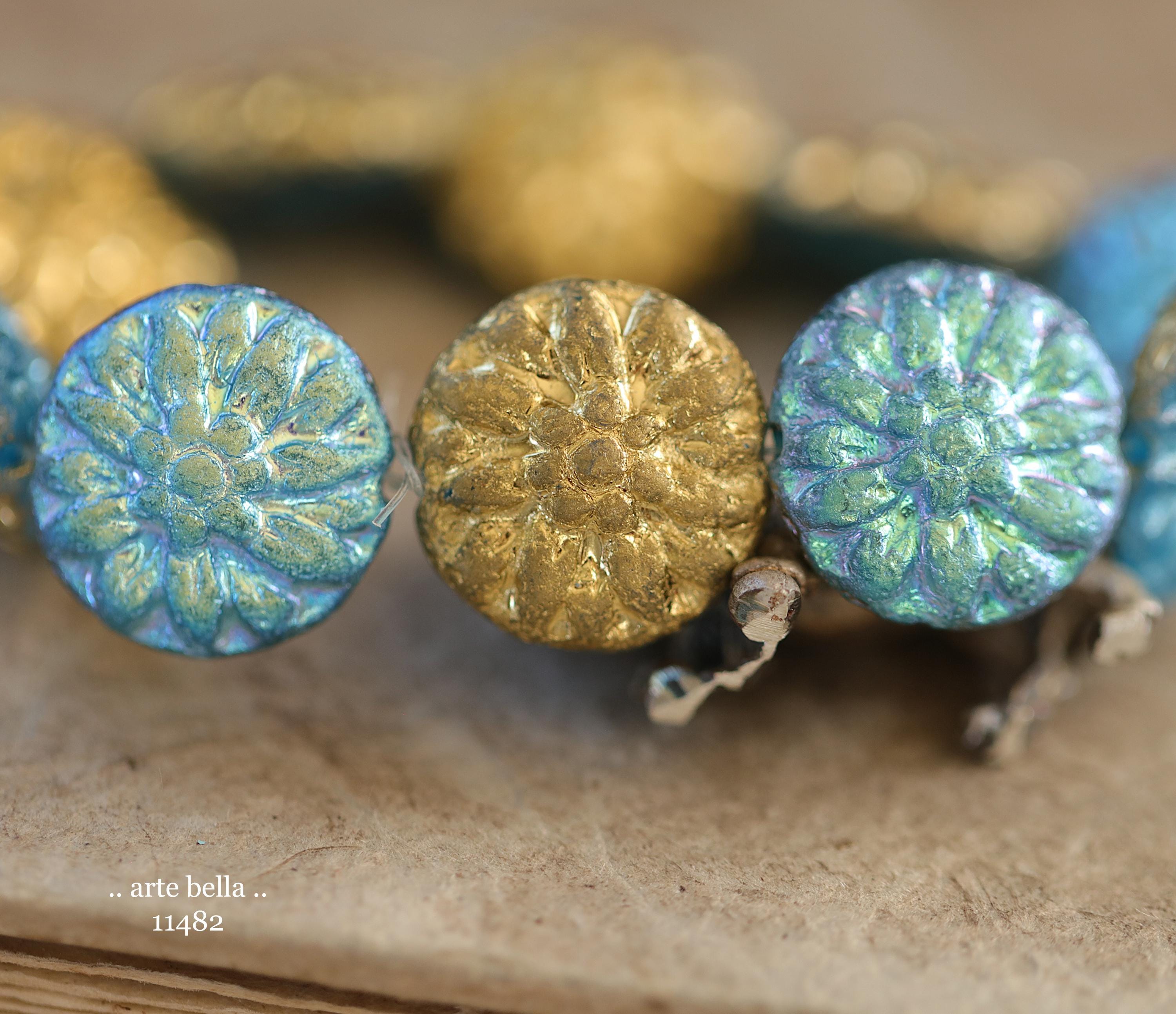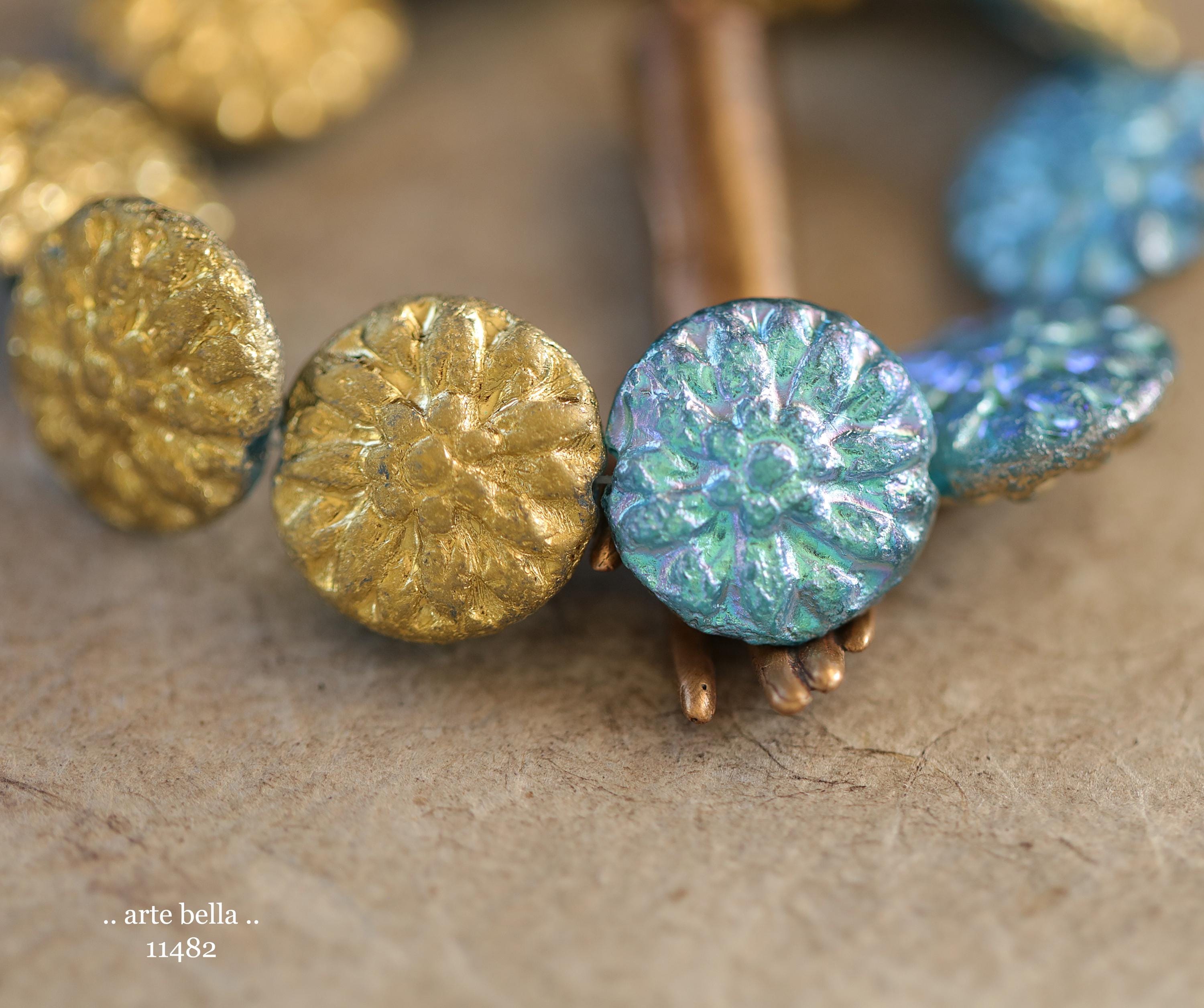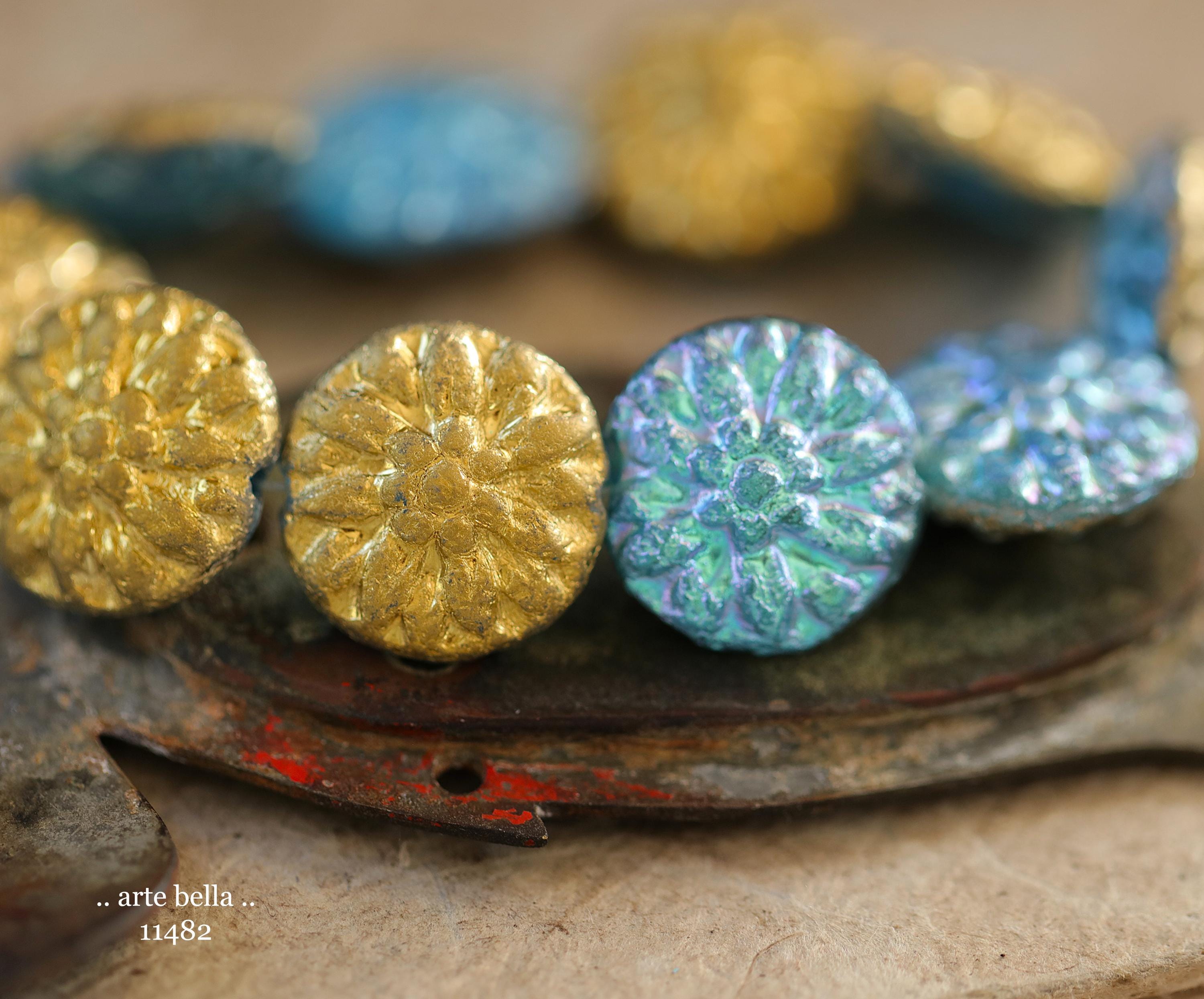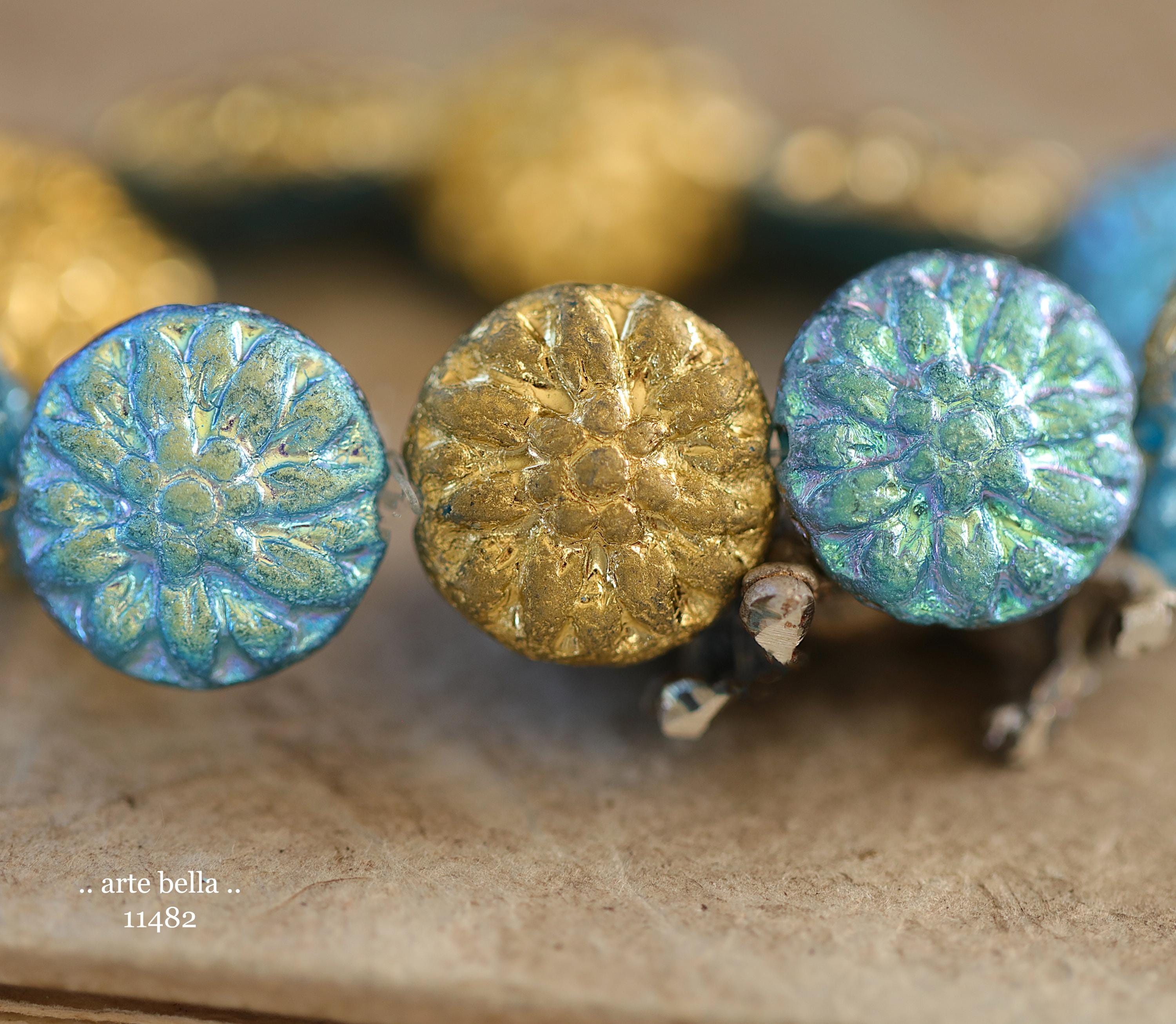 New .. GOLDEN SKY DAHLIAS .. 10 Premium Etched Czech Glass Dahlia Flower Beads 14mm (11482-st) .. jewelry supplies