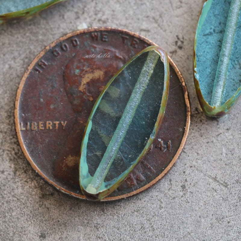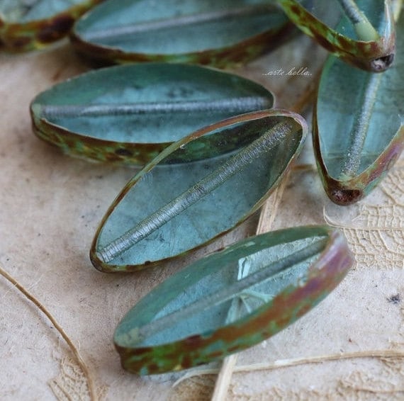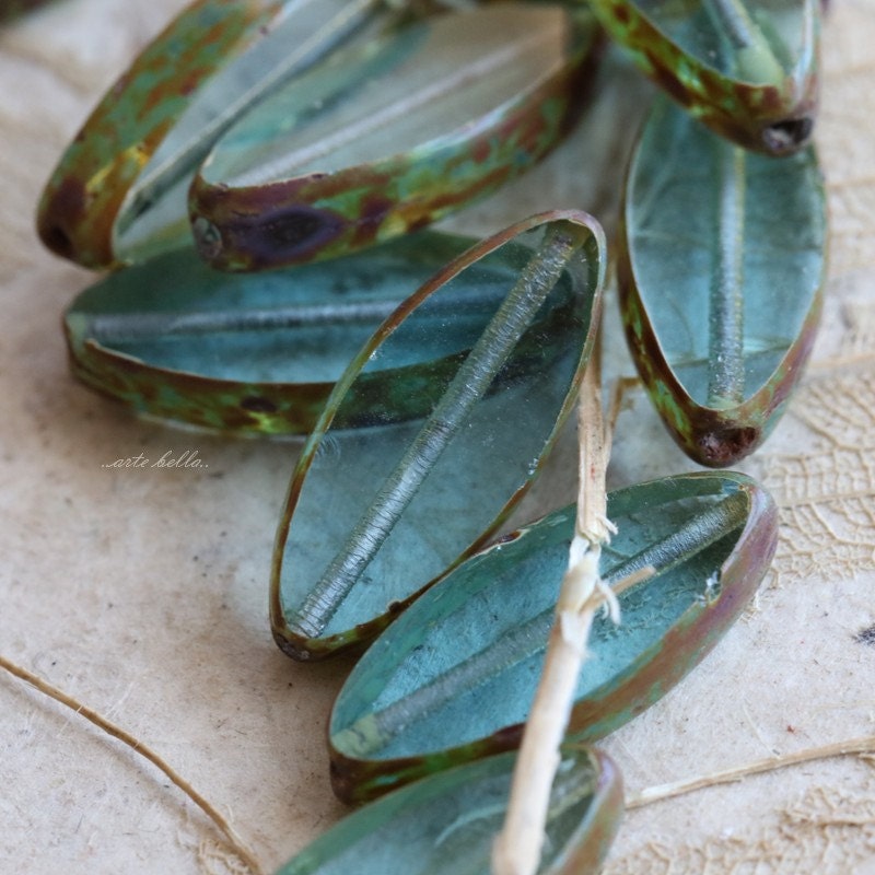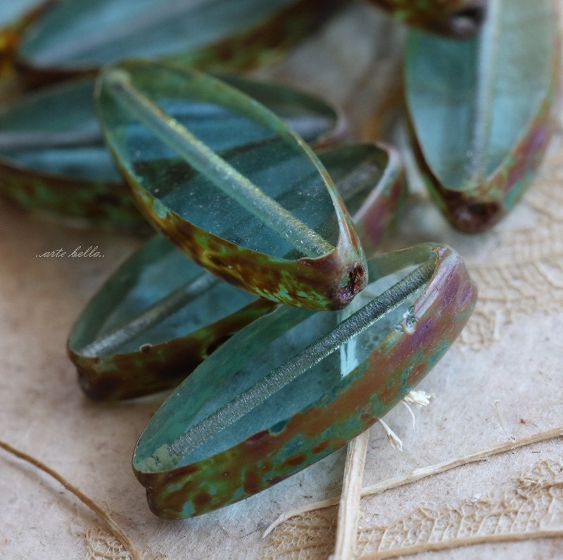 back in stock .. EARTHY AQUA PETALS .. 10 Premium Picasso Rustic Czech Glass Spindle Beads 7x18mm (5339-st) .. jewelry supplies