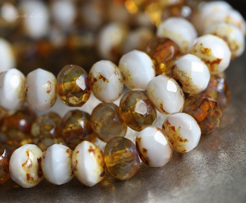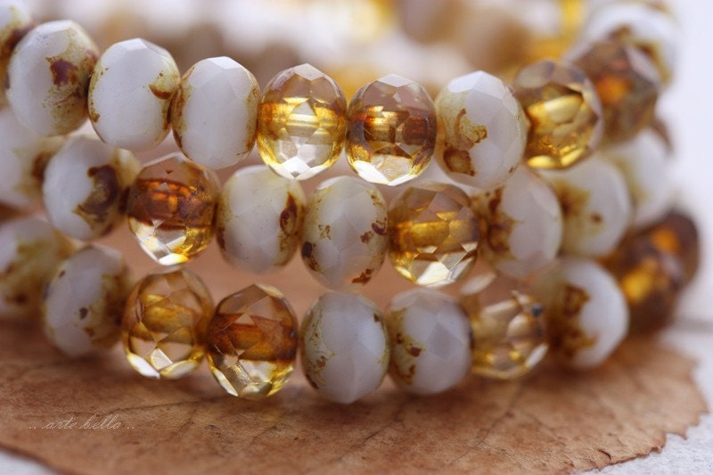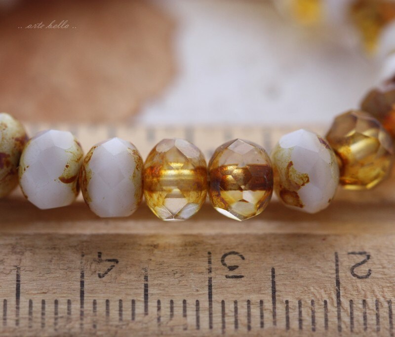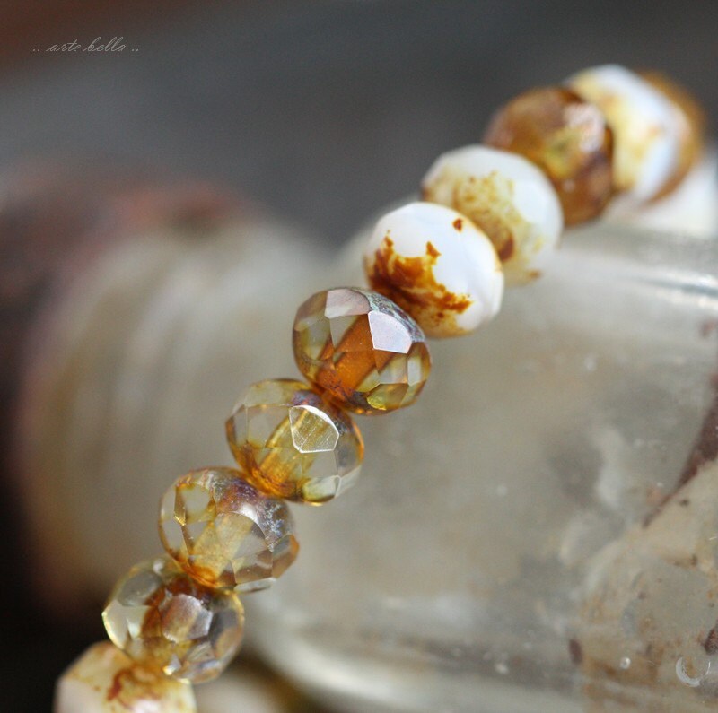 Random mix of clear, golden amber and white glass beads with an golden amber Picasso finish and fire polished facets.
