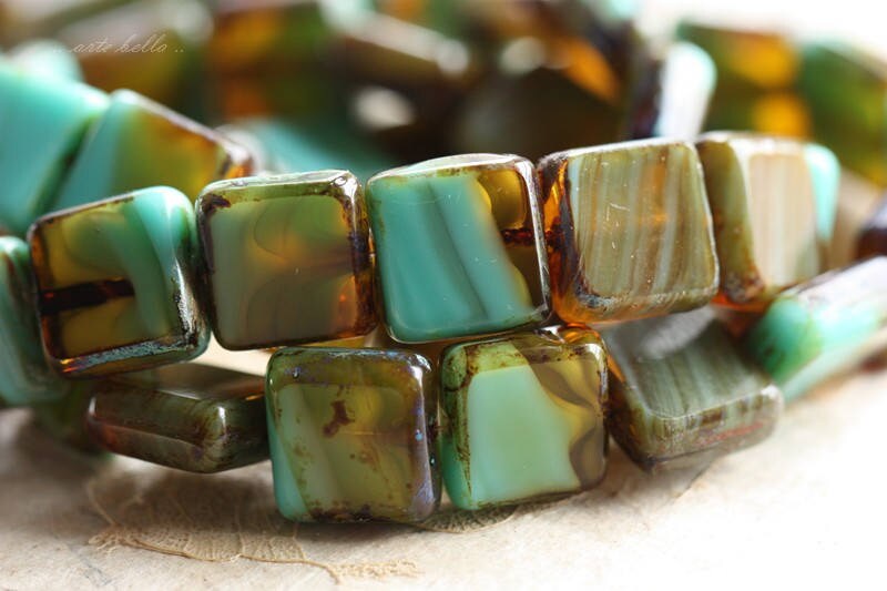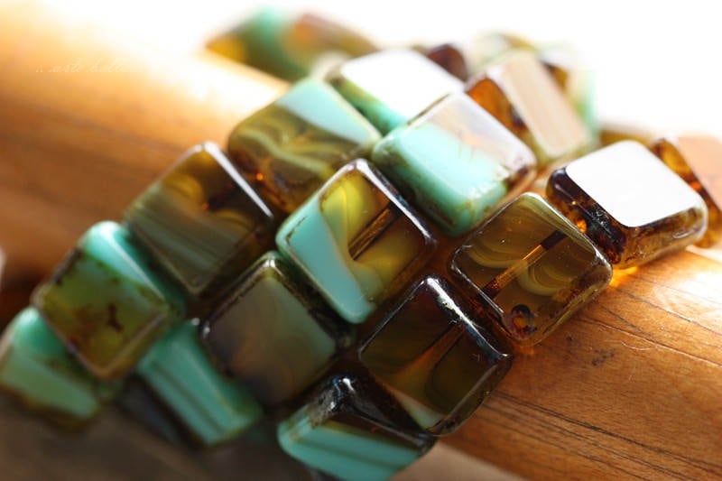 back in stock .. AMBER TURQUOISE SQUARES .. 15 Premium Picasso Czech Glass Square Beads 11x5mm (1009-st) .. jewelry supplies