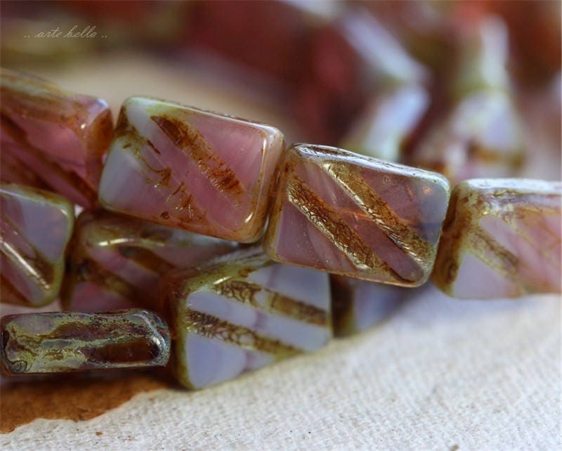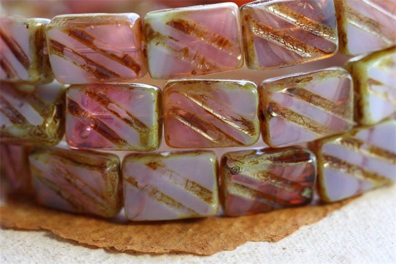 Translucent pink and milky opal lilac pressed glass with a light Picasso finished remaining around the edges and in the recessed stripes. Fire polished on the face of the beads to reveal the gorgeous glass. **PLEASE NOTE: Some beads have visible bubbles as seen in my pictures.**