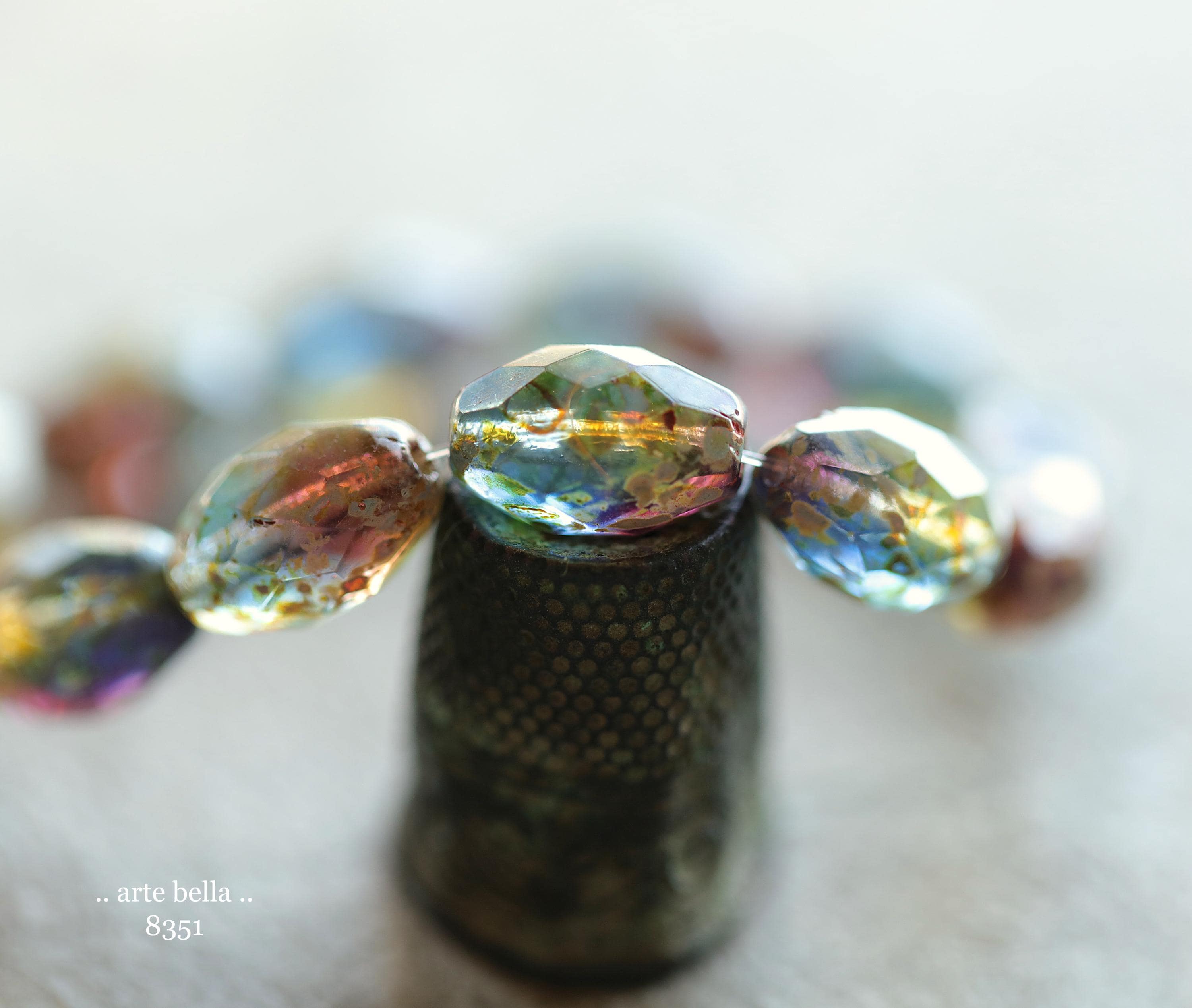 Beautiful mix of translucent blue, purple and clear glass with a heavy blue, moss green and beige Picasso finish. As with all mixed glass beads, each bead is unique and one of a kind as seen in my pictures.