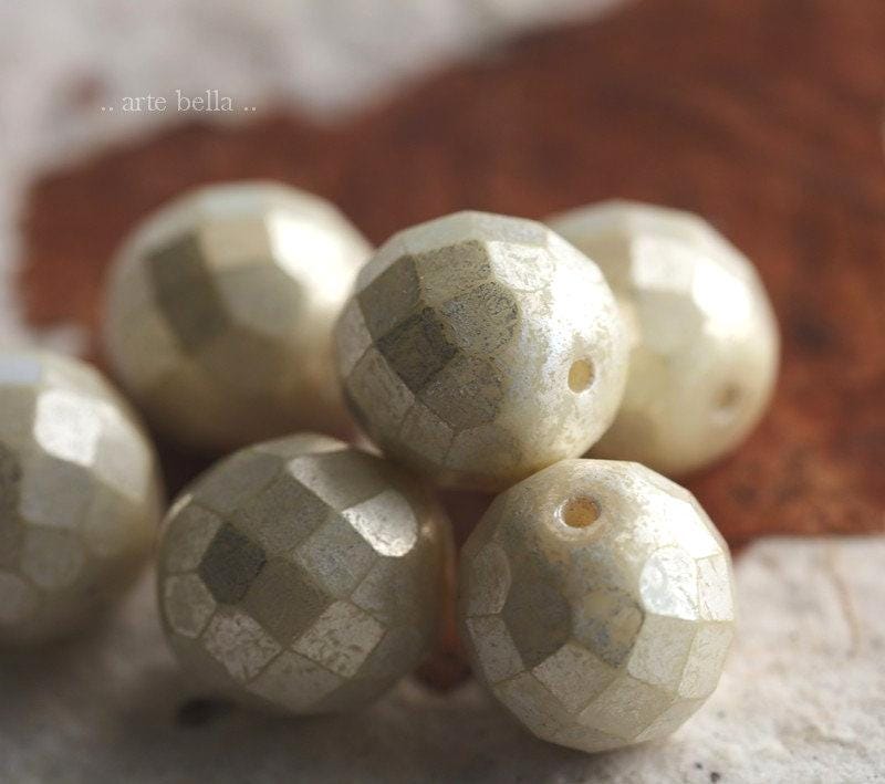back in stock .. SILVERED CREAM PLUMPS .. 6 Premium Luster Picasso Czech Glass Faceted Round Glass Bead Mix 12mm (6717-6)