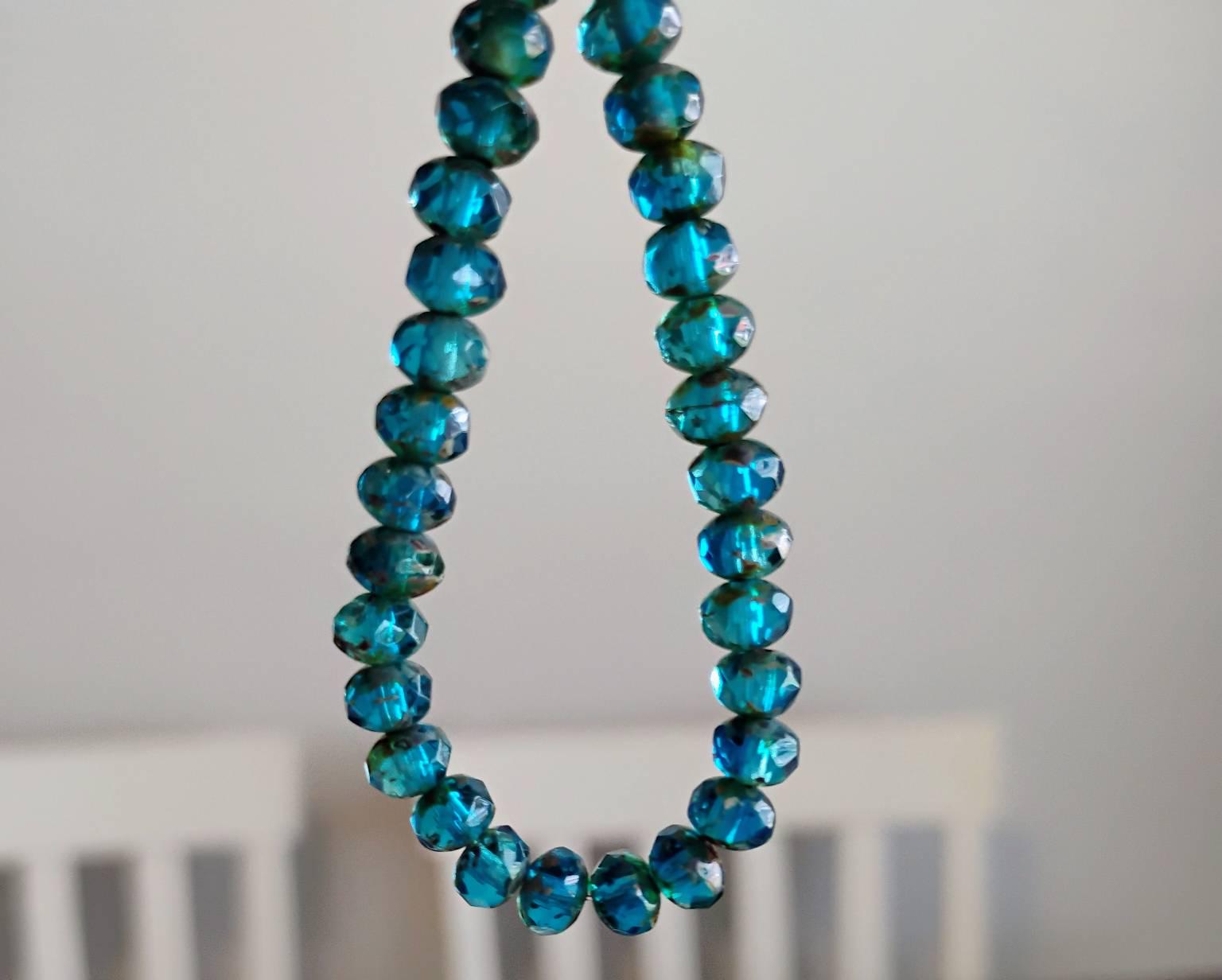 Gorgeous shades of capri blue with an earthy Picasso finish, fire polished facets.