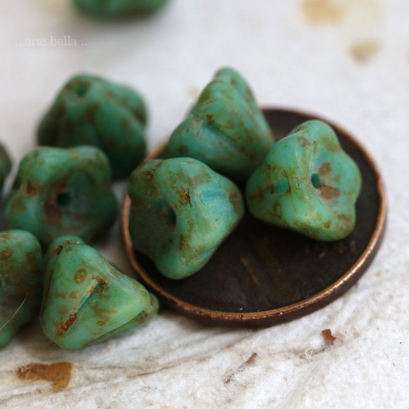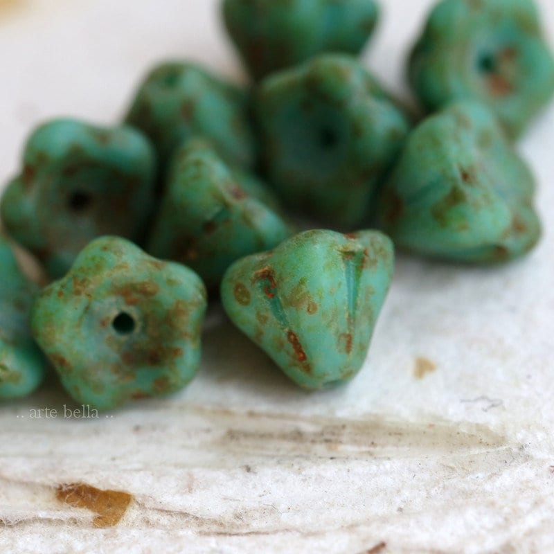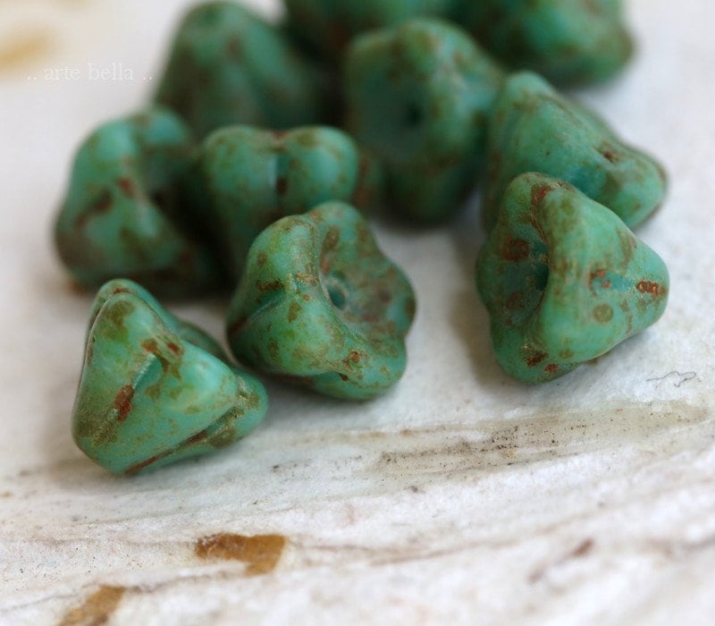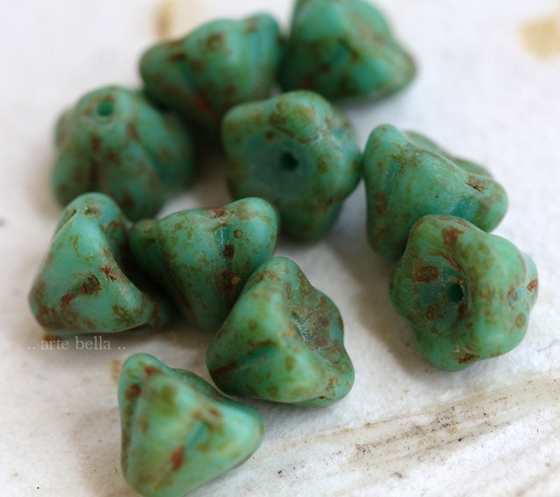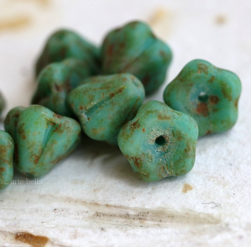 back in stock .. AGED TURQUOISE POSIES .. 10 Premium Etched Picasso Czech Glass Flower Beads 9x6mm (7320-10) .. jewelry supplies