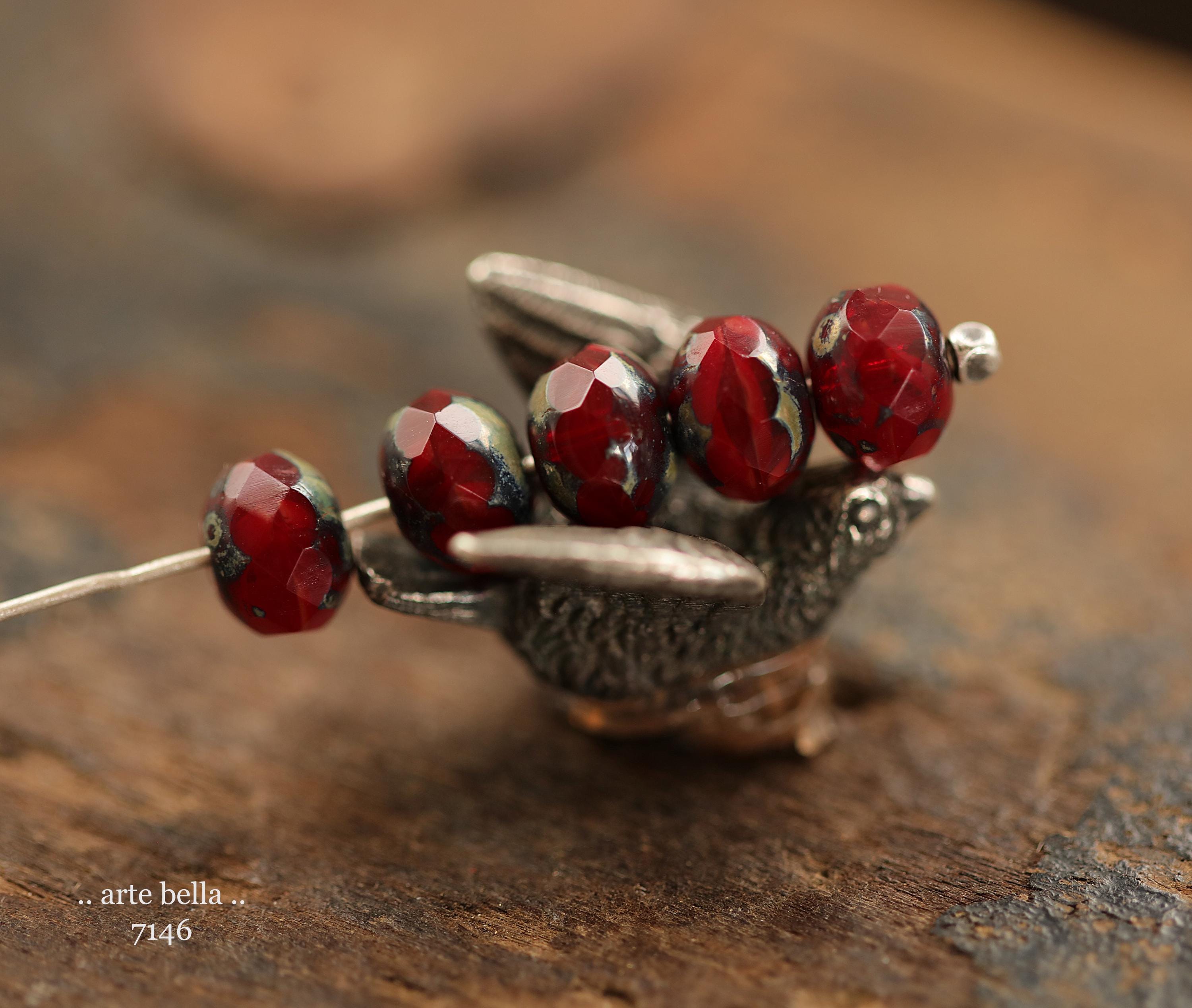 A mix or translucent and opaque dark red glass coated on the ends in an earthy and metallic Picasso, fire polished facets. Great for your fall/winter designs.