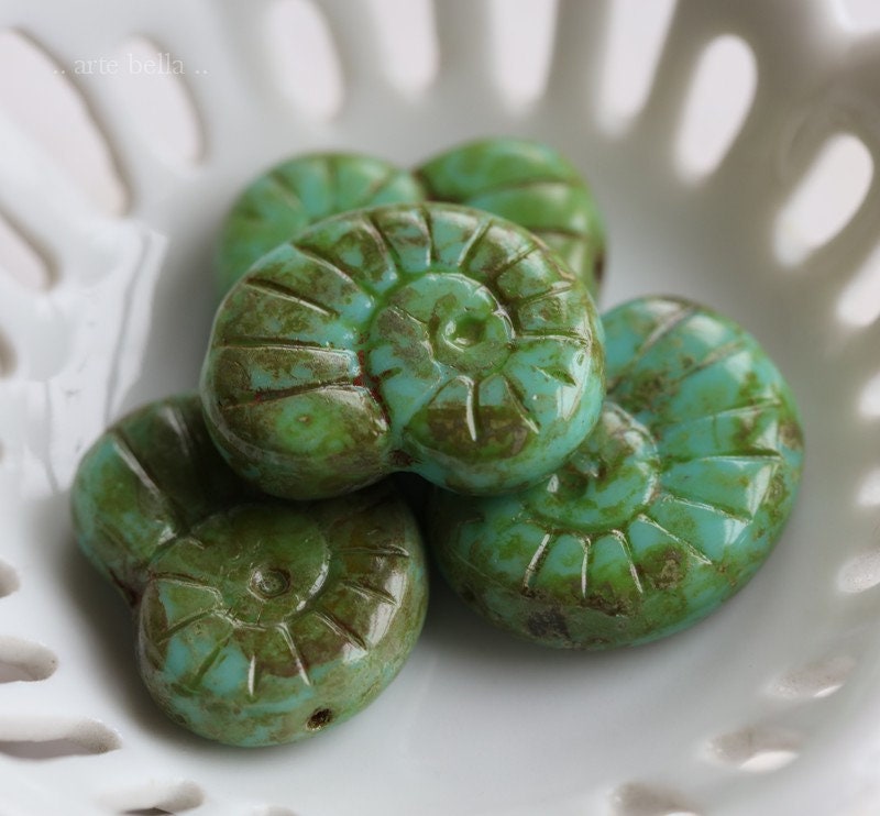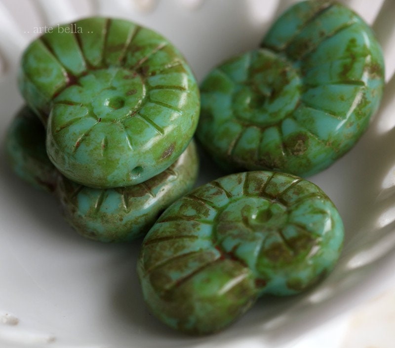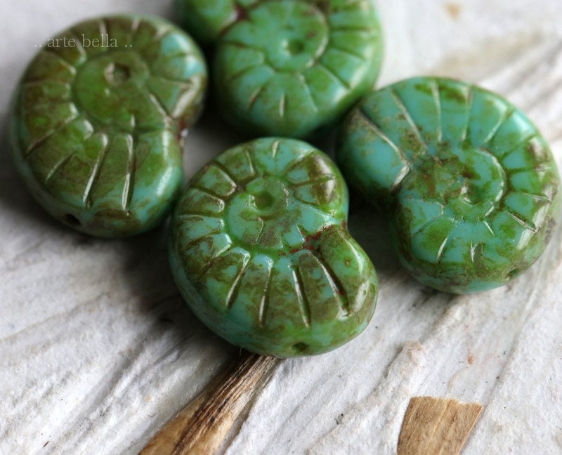 MOSSY TURQUOISE FOSSIL .. 4 Premium Picasso Czech Nautilus Ammonite Glass Beads 17x14mm (7212-4) .. jewelry supplies