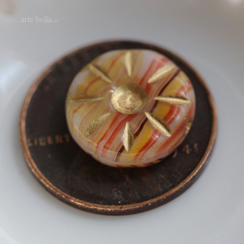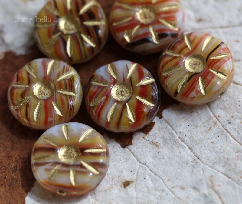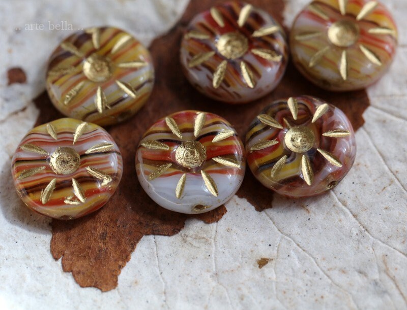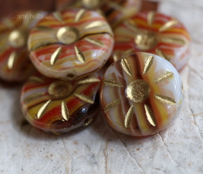 Carved daisy coin beads in opaque white, yellow, orange, red, maroon and brown glass, with a golden metallic wash.