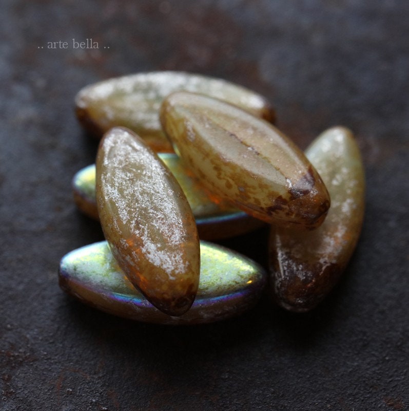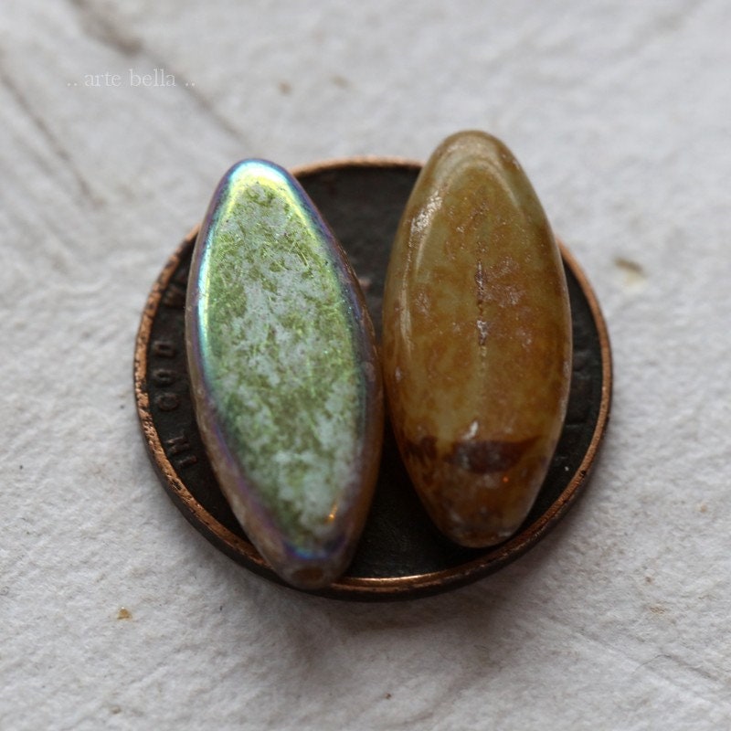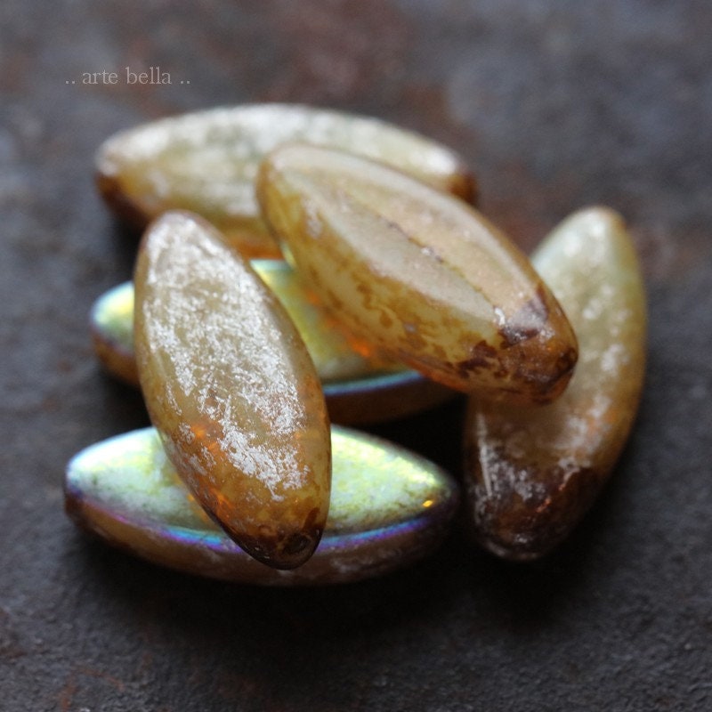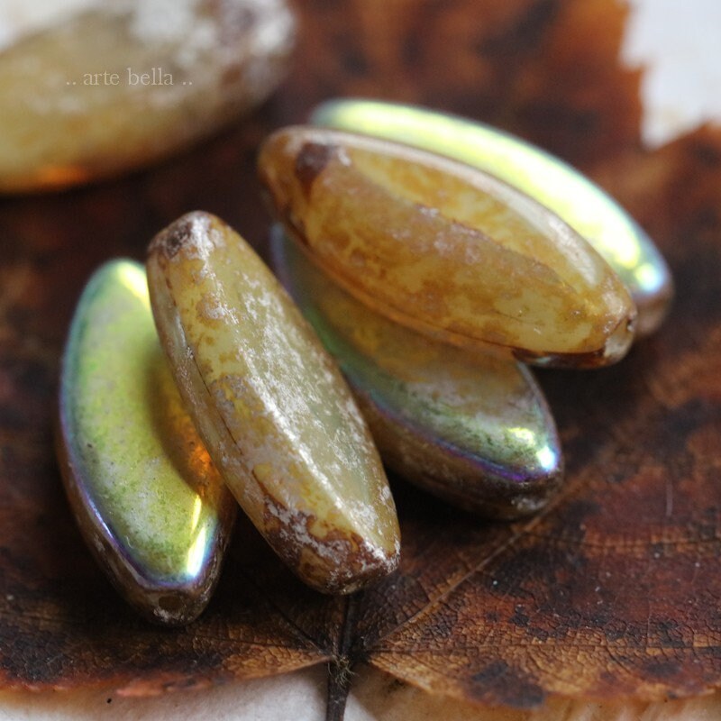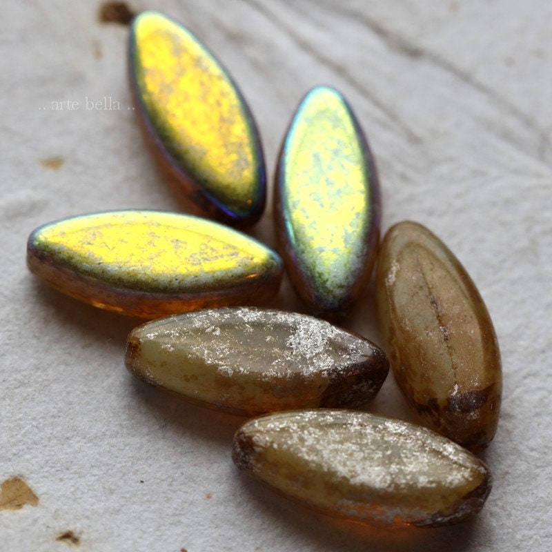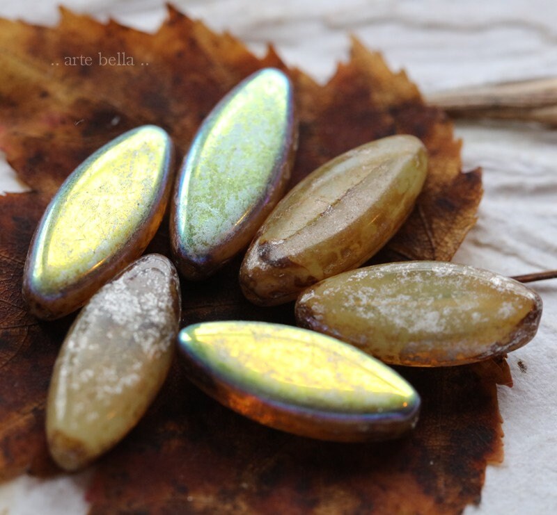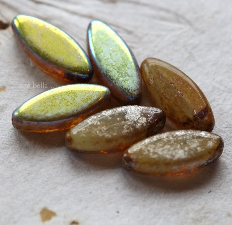 last ones .. MYSTIC CASHMERE PETALS .. 9 Premium Picasso Czech Glass Spindle Beads 18x7mm (7639-9)