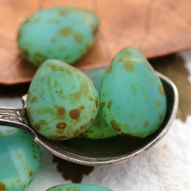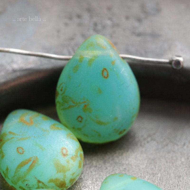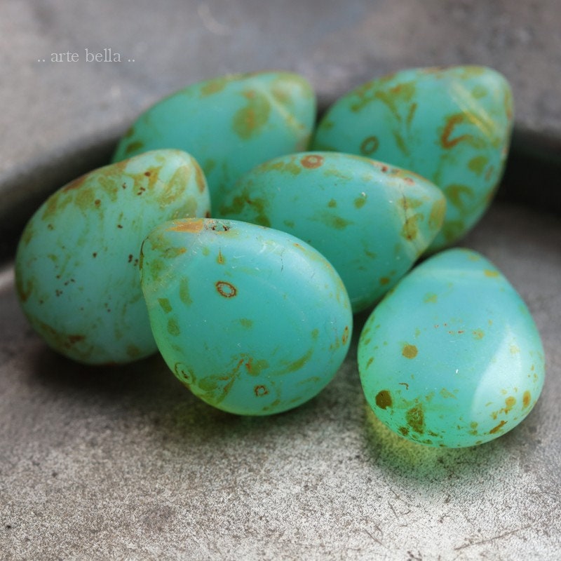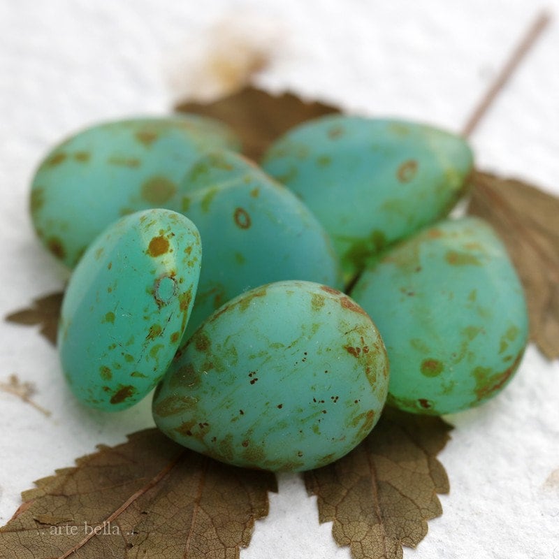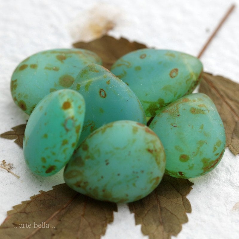 Gorgeous semi translucent and milky opal ocean green glowing pears with a lovely matte Picasso finish. **You will receive a random mix of 6 beads as seen in my pics.**