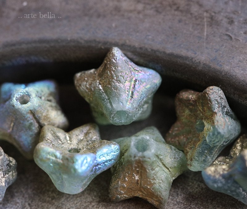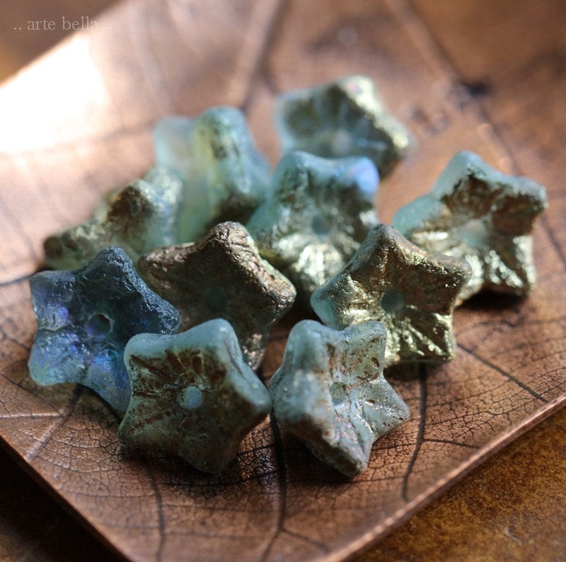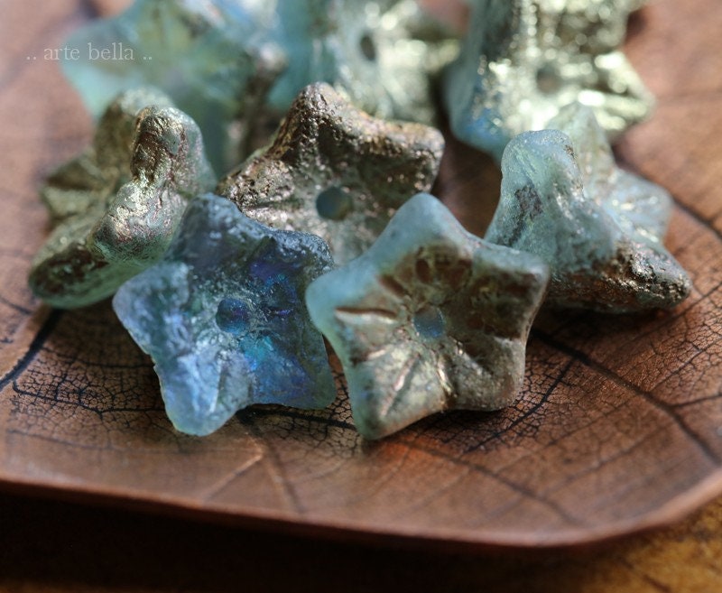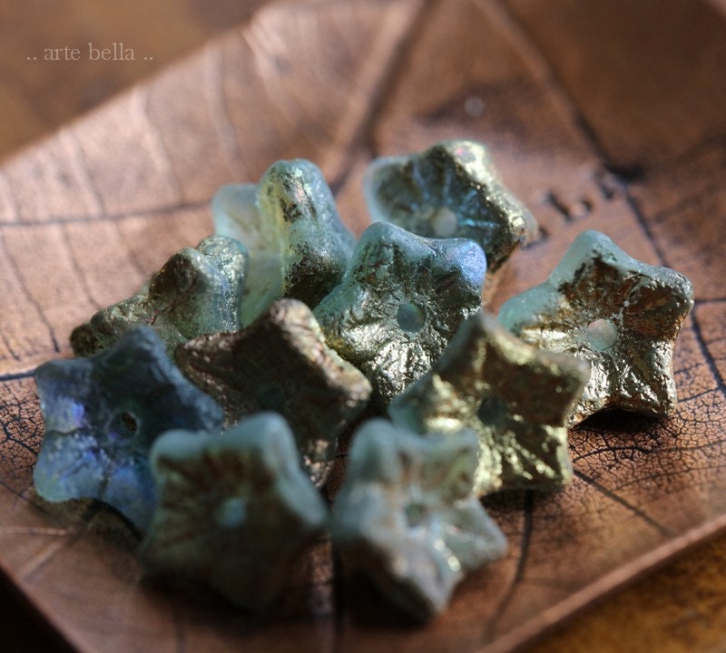 Pretty rustic bell flowers in a translucent light blue green etched glass with a golden metallic and Aurora Borealis finish. **PLEASE NOTE: As with all mixed glass beads and various finishes, each one is unique and one of a kind as seen in my pictures.**