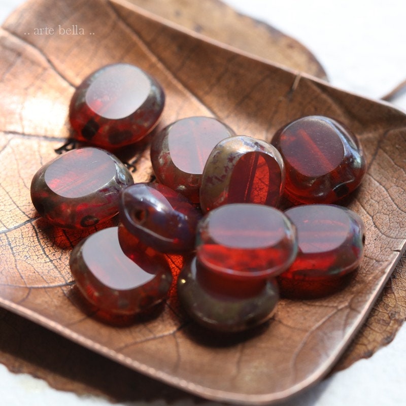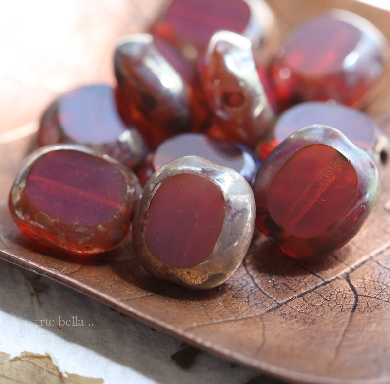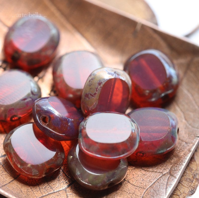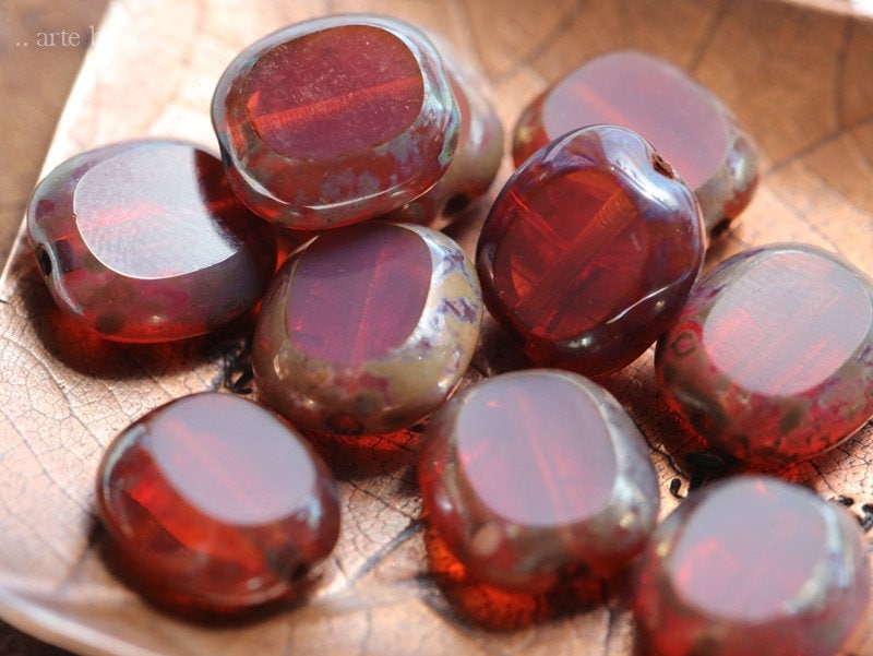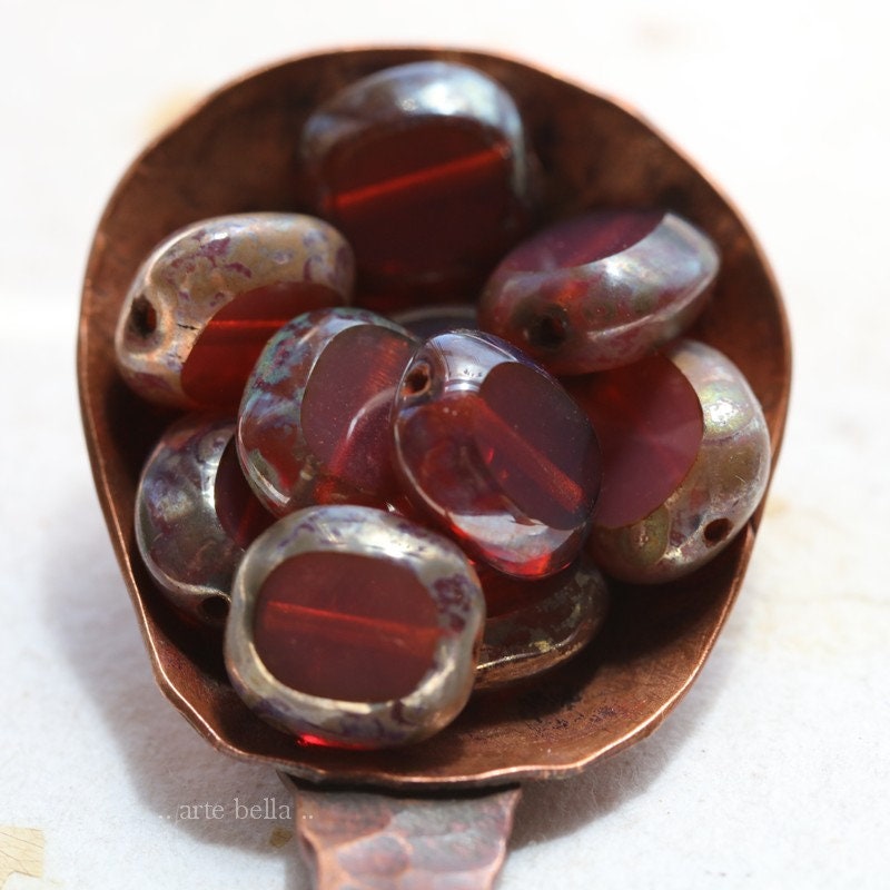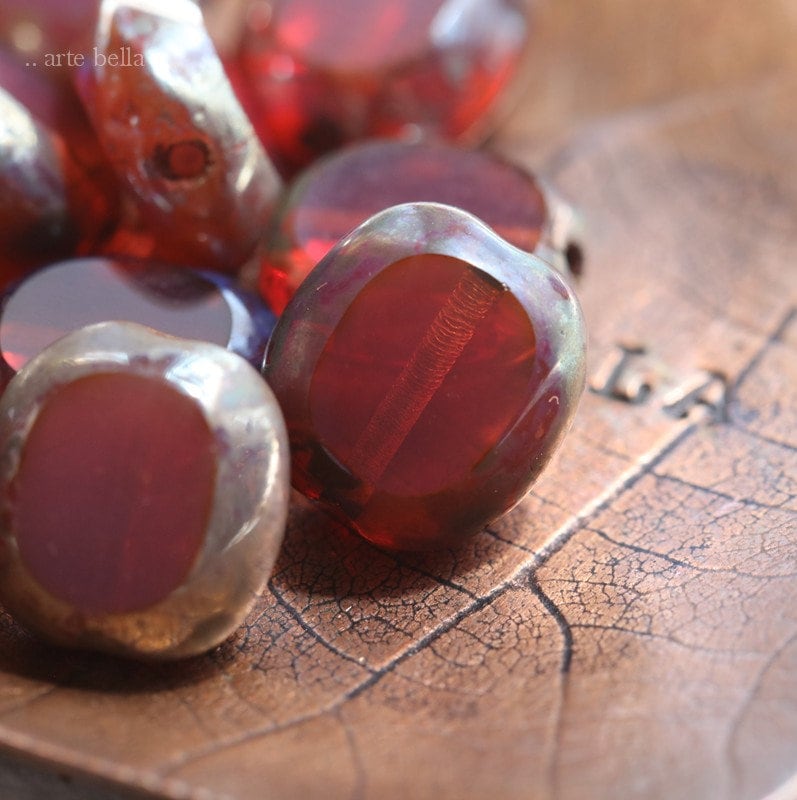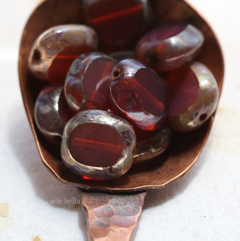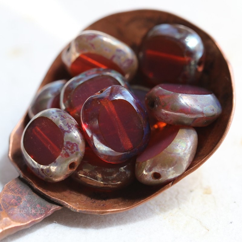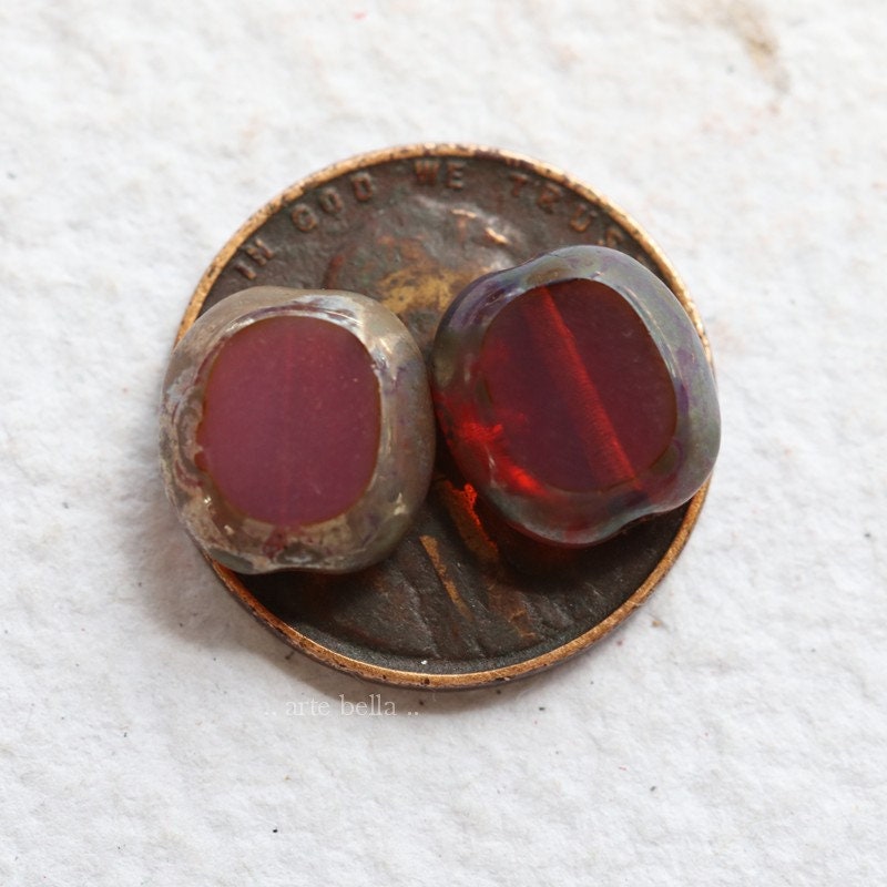 Table cut dark pink milky opal glass sliced oval coins coated on the edges with an earthy Picasso, metallic Aurora Borealis finish and fire polished on the face of the beads.