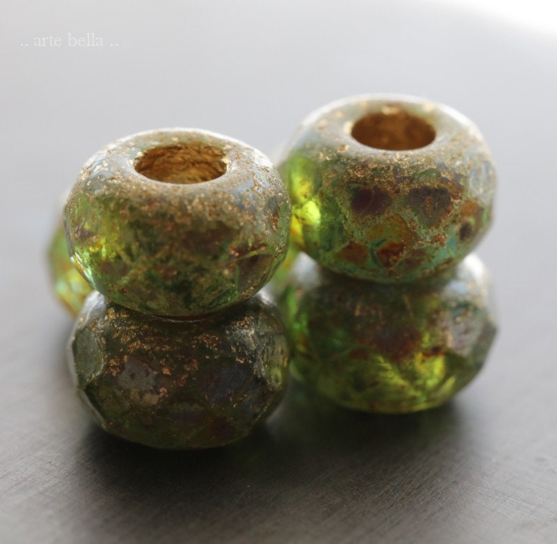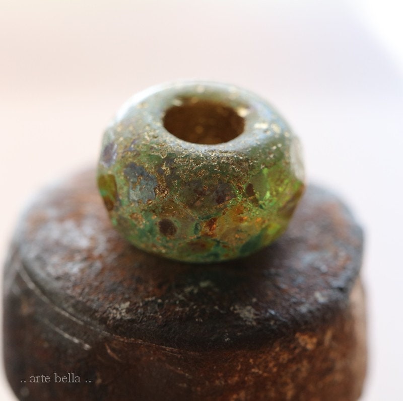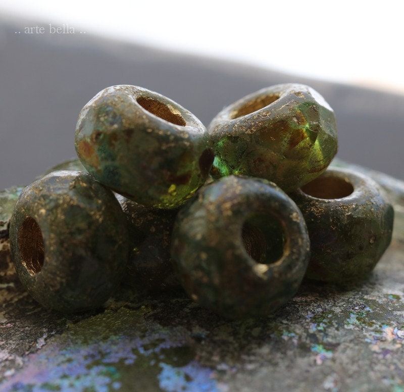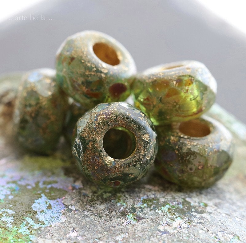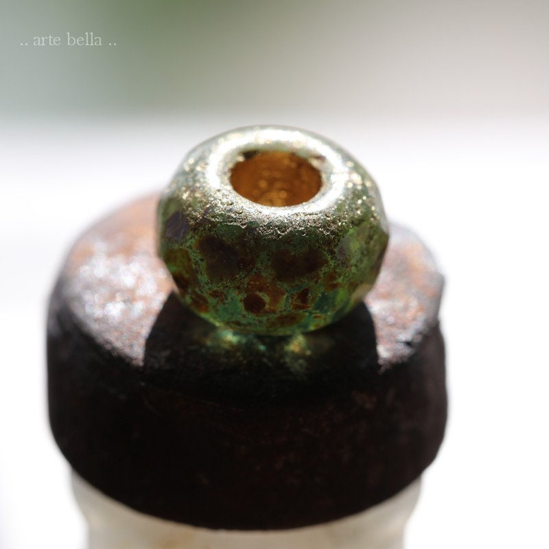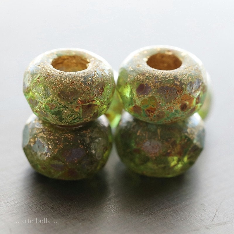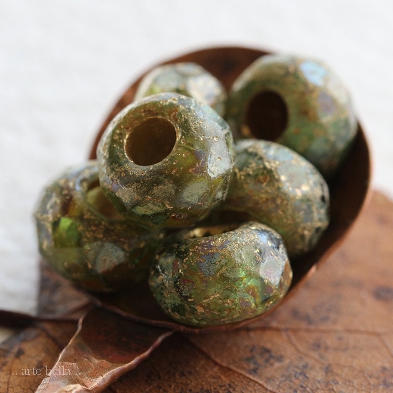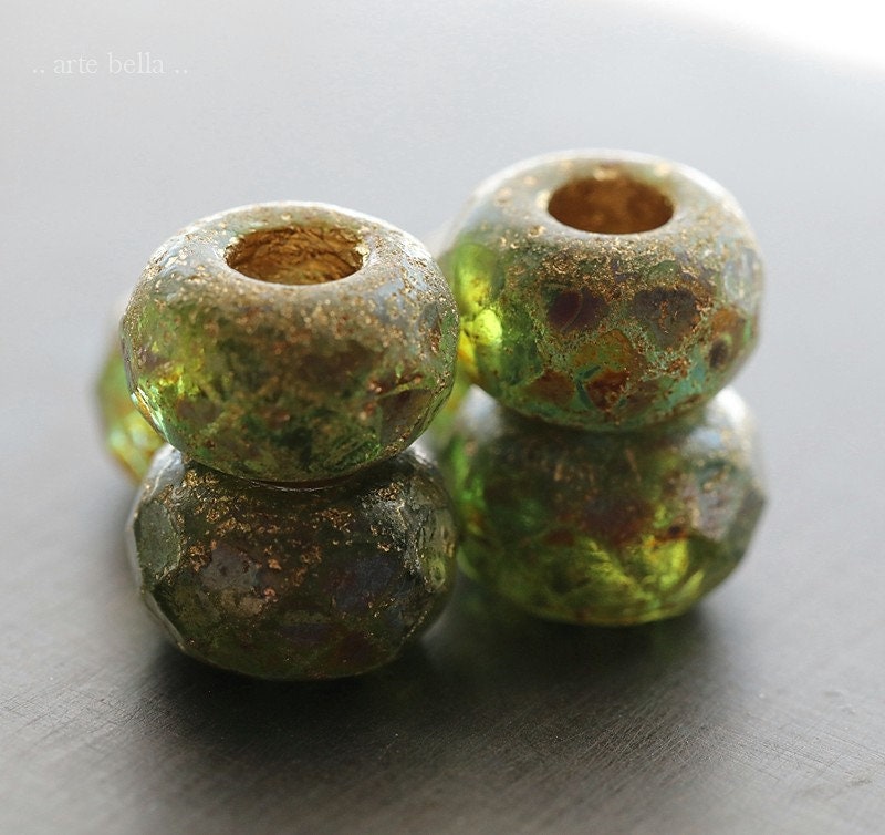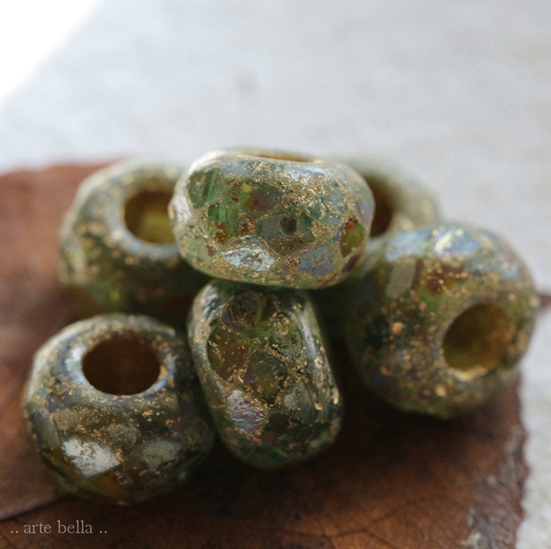Matte etched green glass with a golden metallic wash and earthy Picasso finish. Large bead hole is fully coated with the same golden metallic finish. These have an antique vintage vibe going on. Love, love, love!