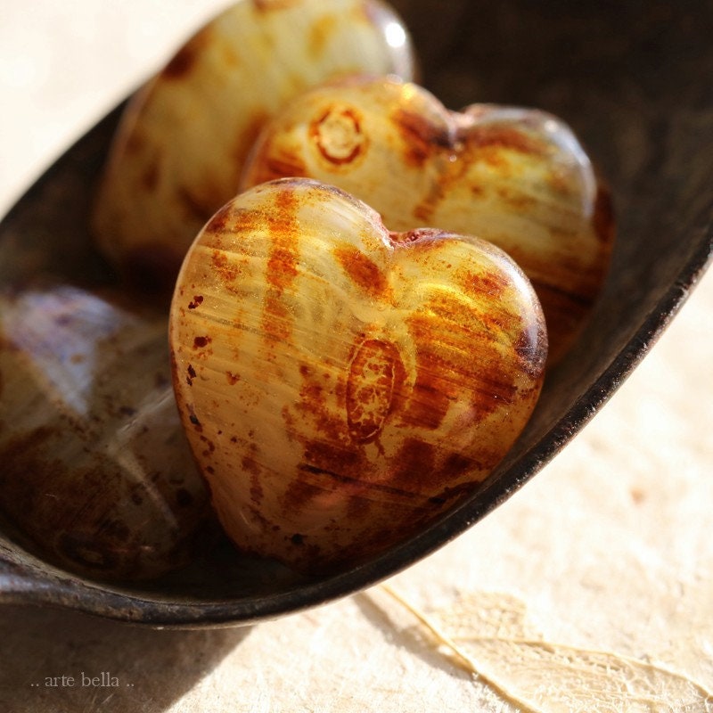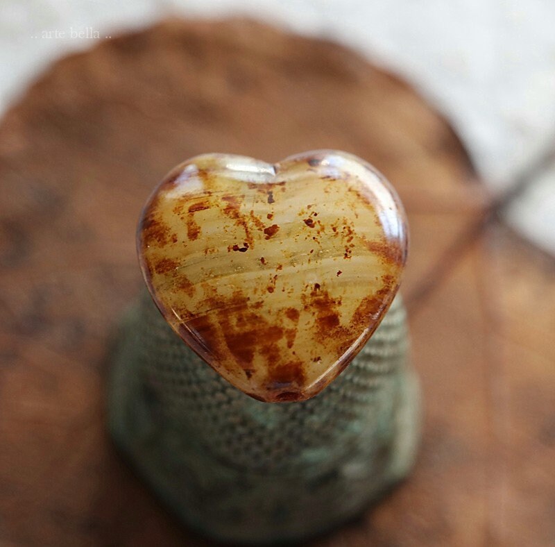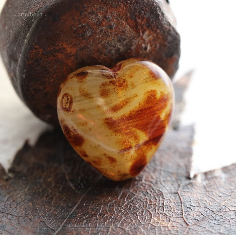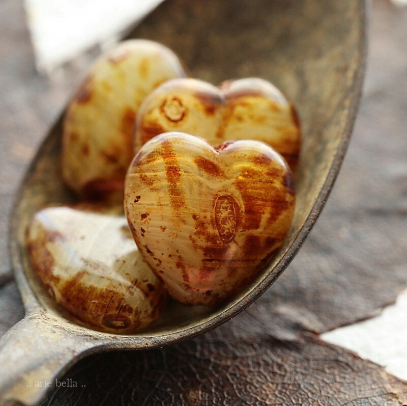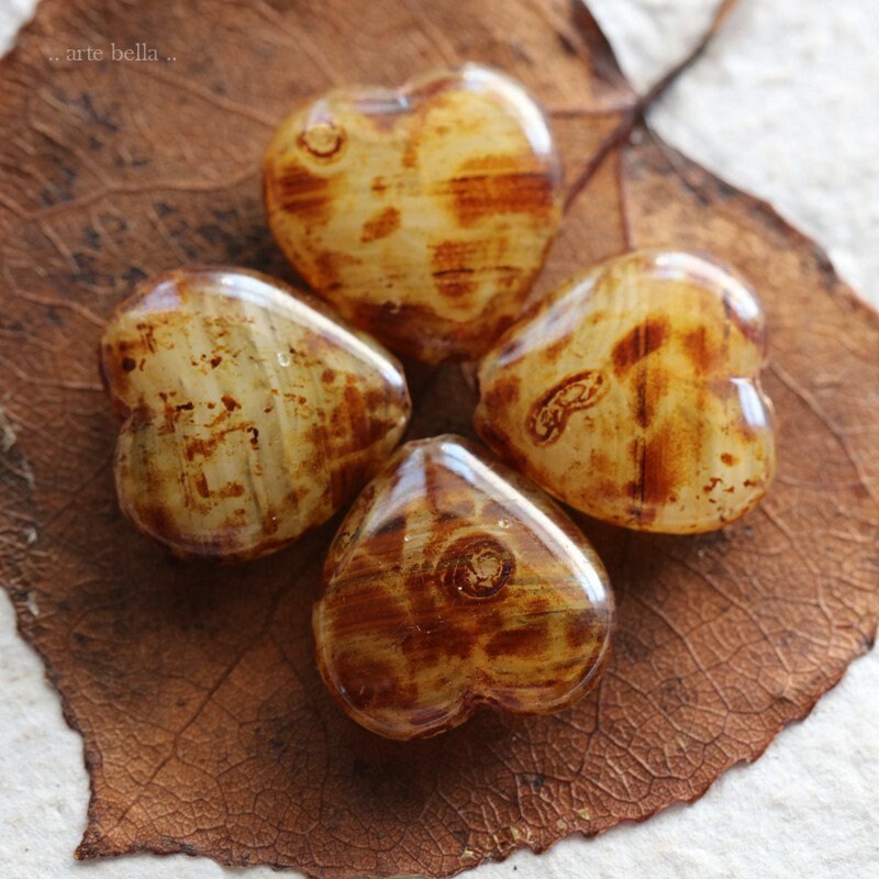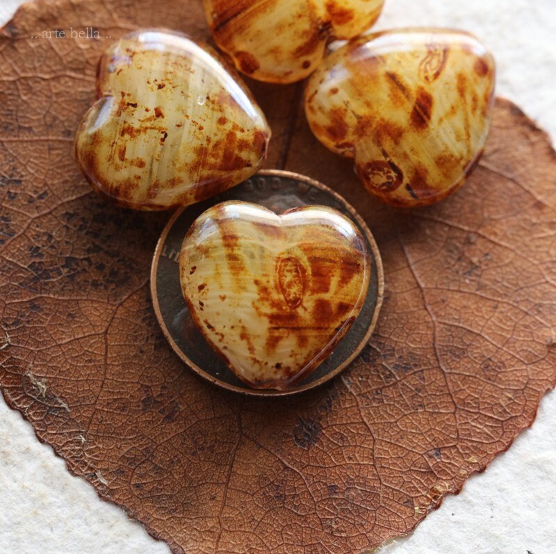 Great puffy heart beads in a mix of creamy ivory and clear striped glass with a amber brown Picasso with a glossy fire polished finish. **PLEASE NOTE: Every bead is unique and one of a kind, you will received 4 random beads.**