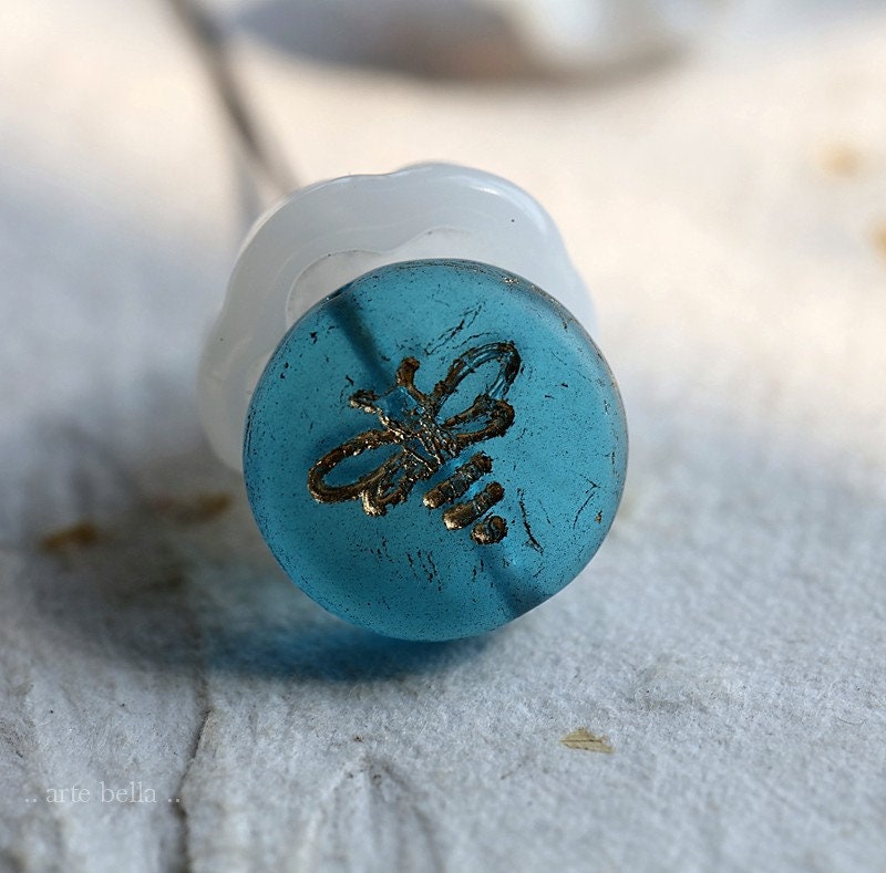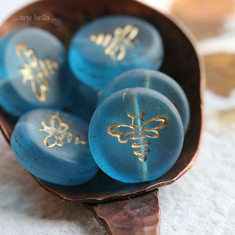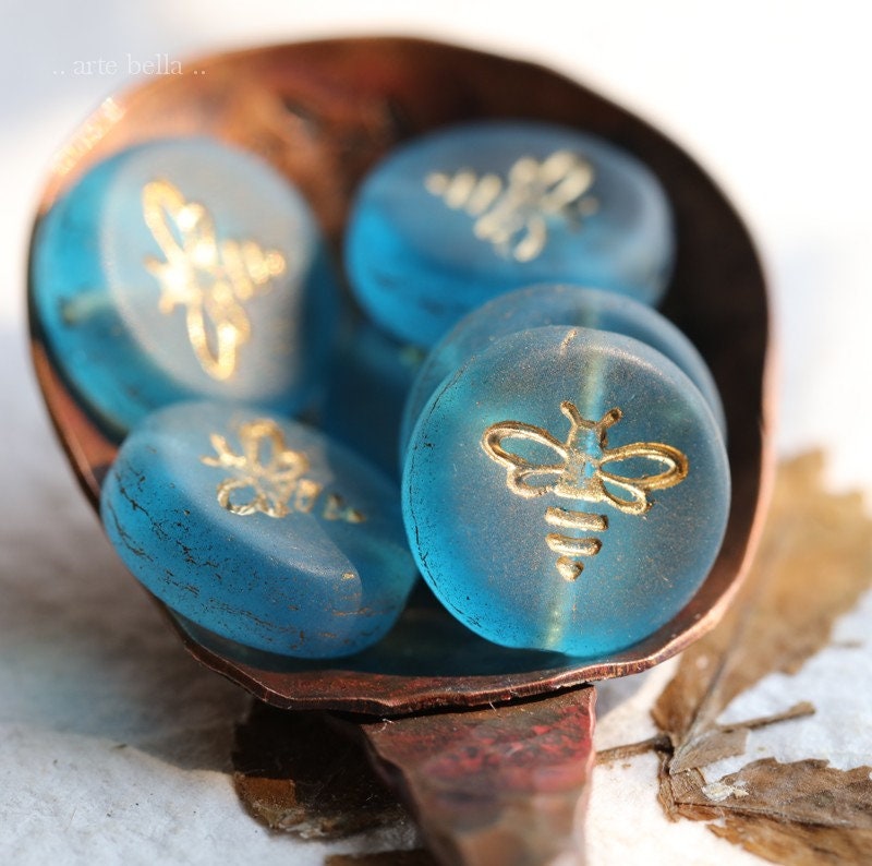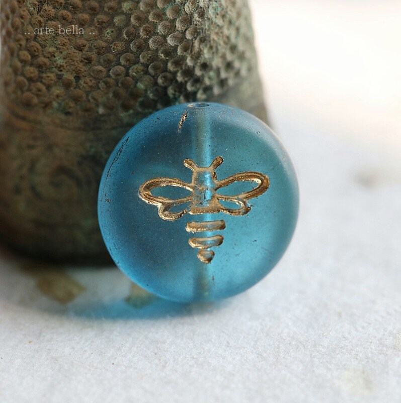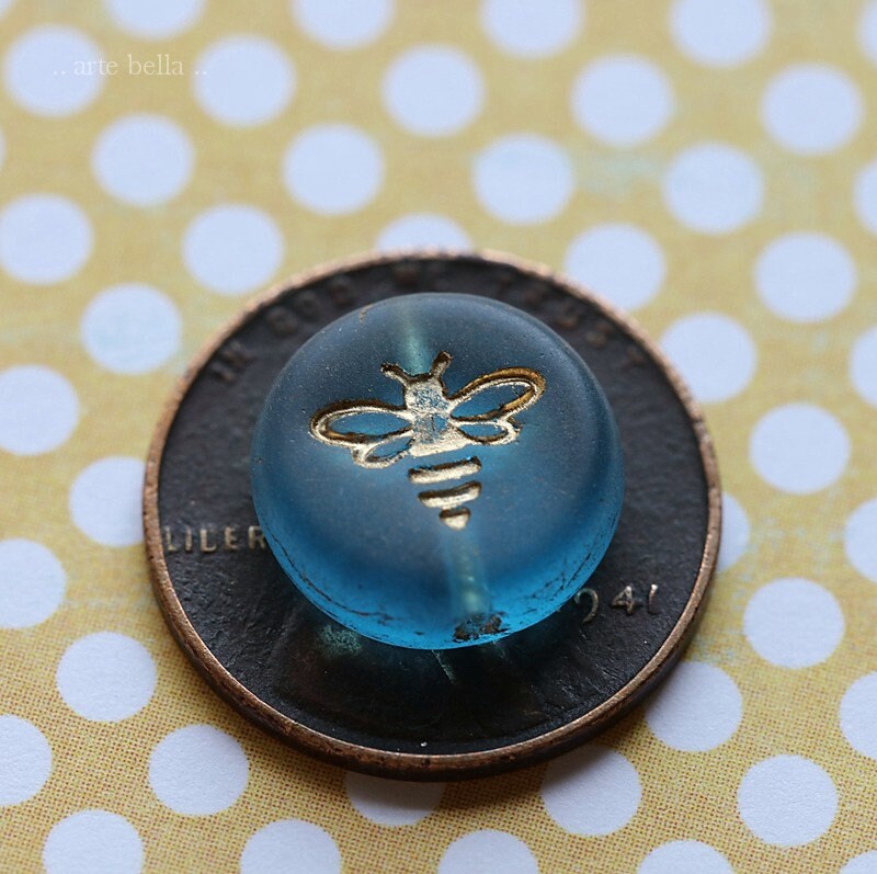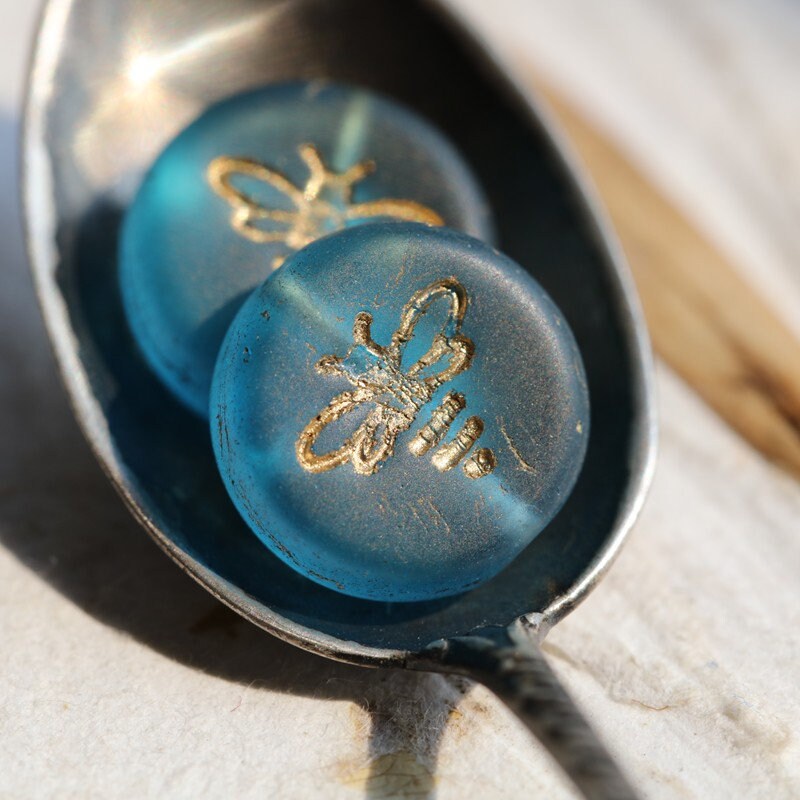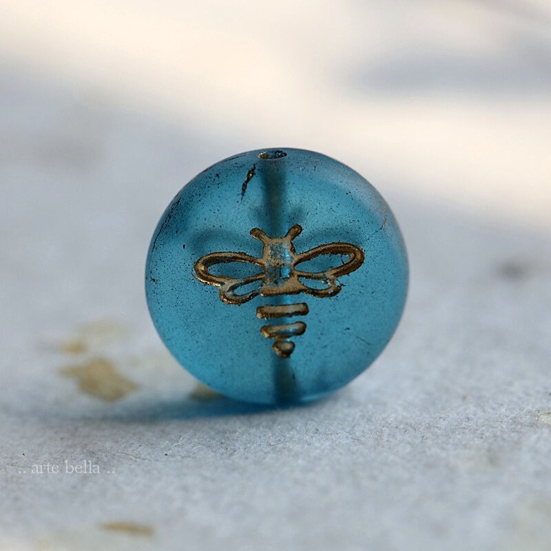 Pressed glass coins featuring a flying bee in translucent capri blue glass with a gold metallic wash, matte finish. **PLEASE NOTE: As seen in my pictures, the finish does vary on each bead. Please take this into account if you prefer beads to match perfectly as these do not.**