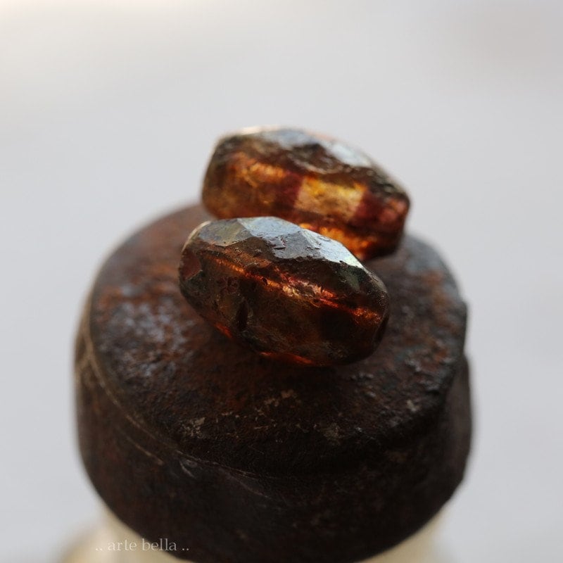 Beautiful amber brown and plum striped glass mix with an etched, earthy Picasso and golden metallic luster. These transmit light beautifully as seen in my pictures.