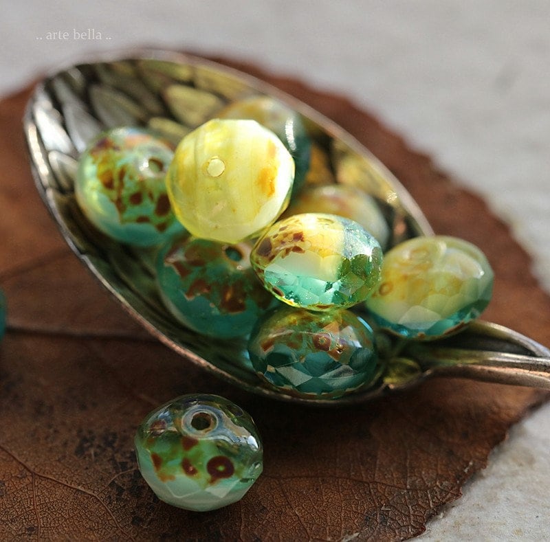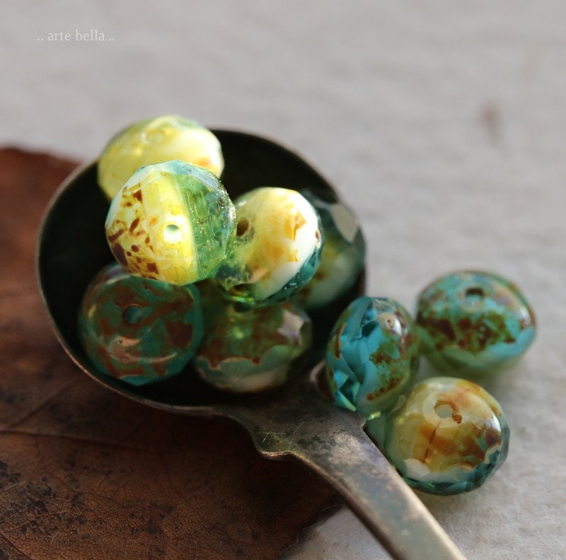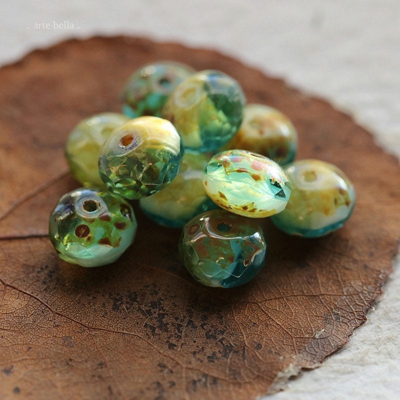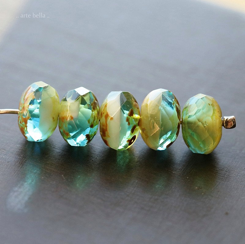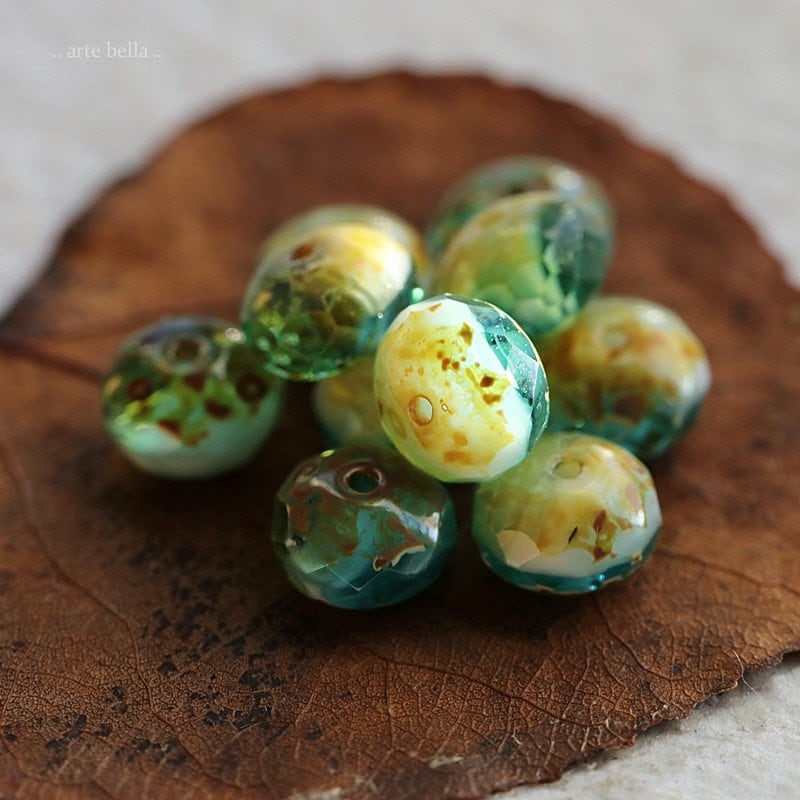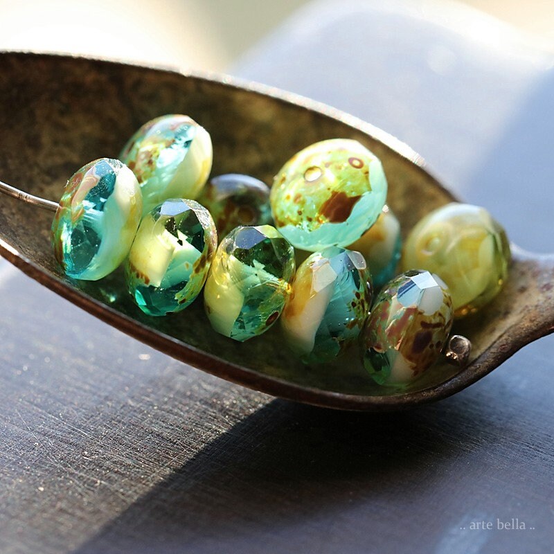 Pretty translucent aqua blue, green and opaque white glass mix with an earthy Picasso finish and fire polished facets.
