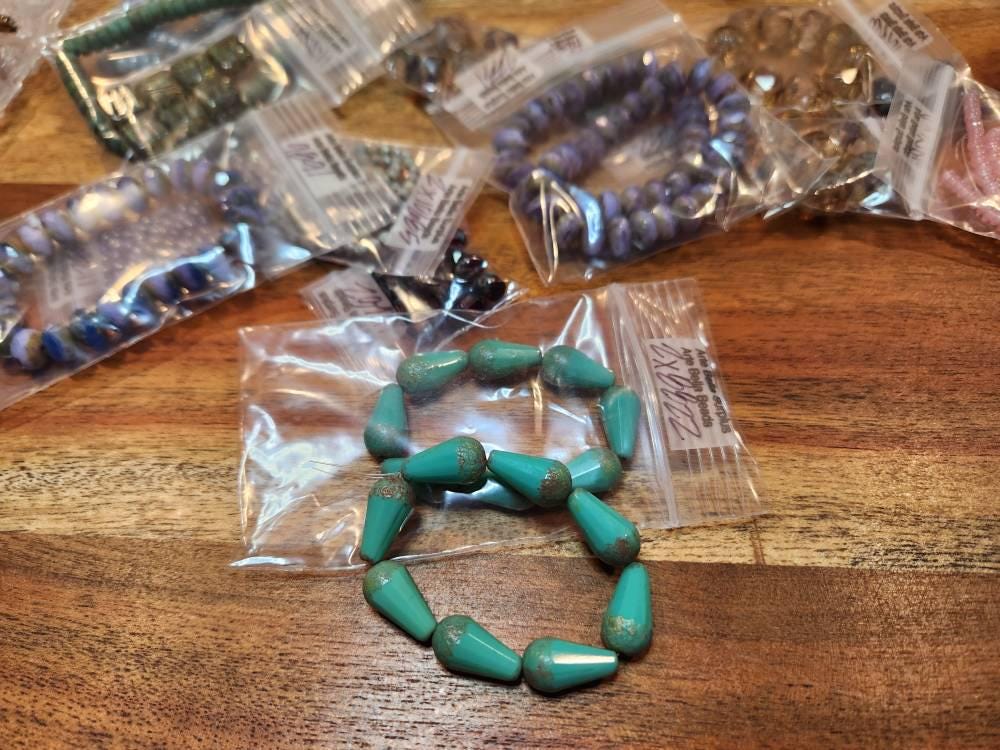 Faceted dangle drop beads in an opaque turquoise green glass, etched glass ends are coated in an earthy Picasso, fire polished facets.